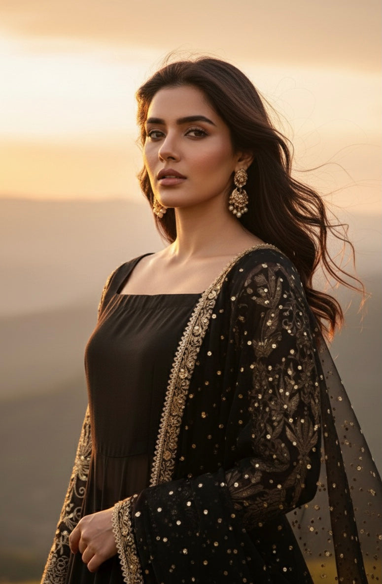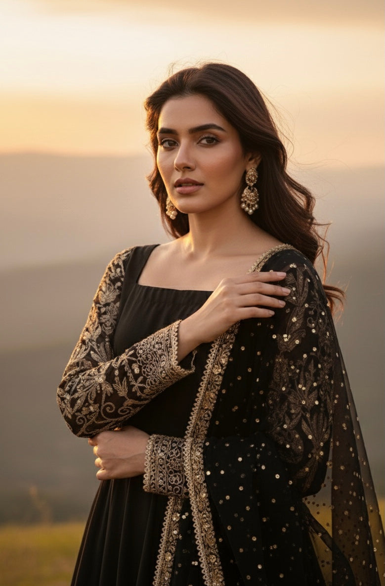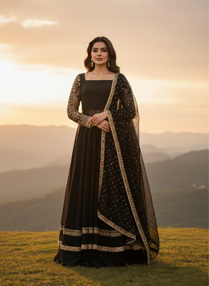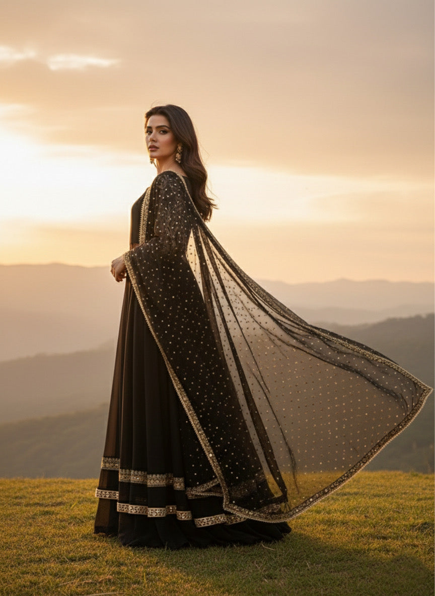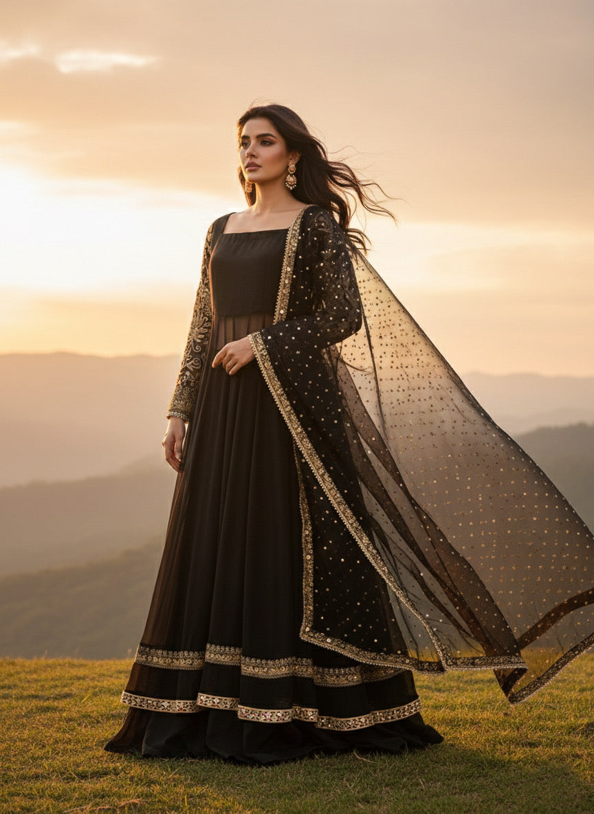 This sophisticated ensemble features a structured bodice crafted from premium raw silk, paired with a voluminous Korean raw silk kalidar lehenga for a regal silhouette. The outfit is elegantly layered with flowing chiffon kalis and sleeves, showcasing intricate Dori embroidery and artisanal mirror-work embellishments throughout the flare. Designed with a graceful broad neckline, the outfit follows a standard gown length of 55 inches and a lehenga length of 43 inches. The look is completed by a matching chiffon dupatta, meticulously detailed with a Dori border and a delicate sequin spray. Customizations are available upon request to ensure a bespoke fit.