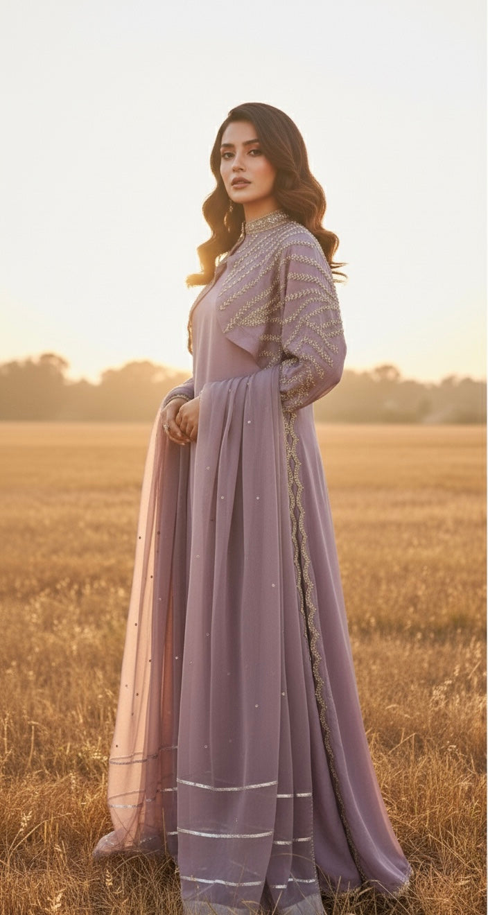 Exude effortless elegance in this meticulously tailored four-piece ensemble, featuring a modern-cut cape with full sleeves and an inner Kaftan-style shirt in a sophisticated Lilac palette. Hand-finished in luxurious Shamose Silk, the 55-inch inner shirt and matching straight trousers provide a sleek, fluid foundation for the show-stopping cape, which is lavishly adorned with a luminous blend of Swarovski crystals, pearls, and intricate Katdana work. The look is completed by a delicate Chiffon dupatta, enhanced with a shimmering sequin spray and traditional Gota accents, perfectly balancing contemporary couture with artisanal heritage. This bespoke article is available for full customization to ensure a personalized fit and finish for any occasion.