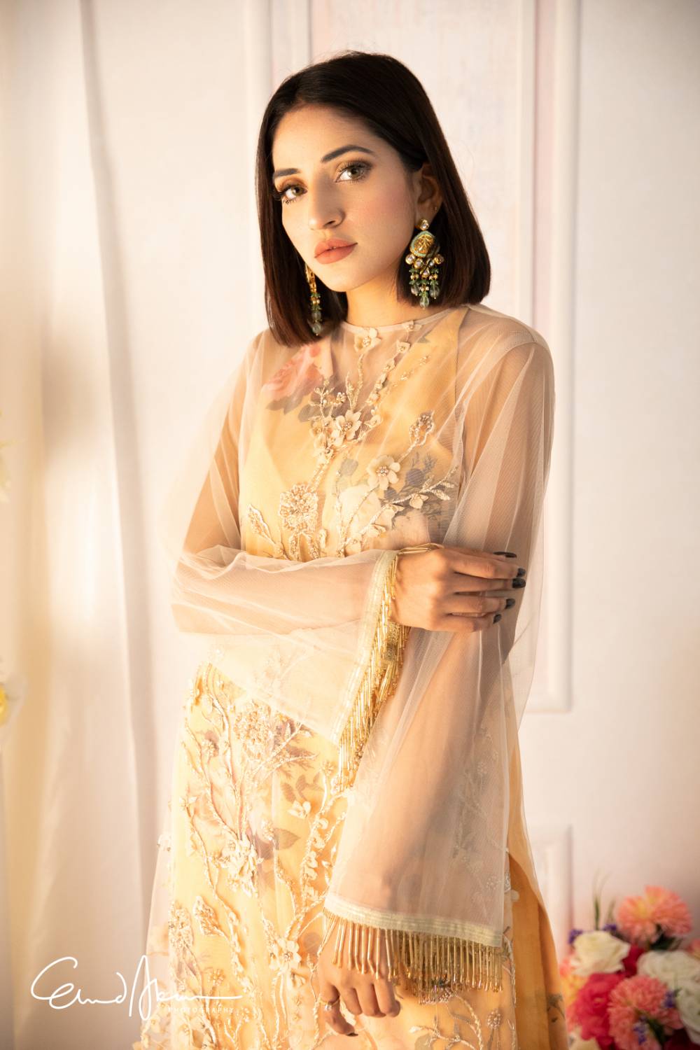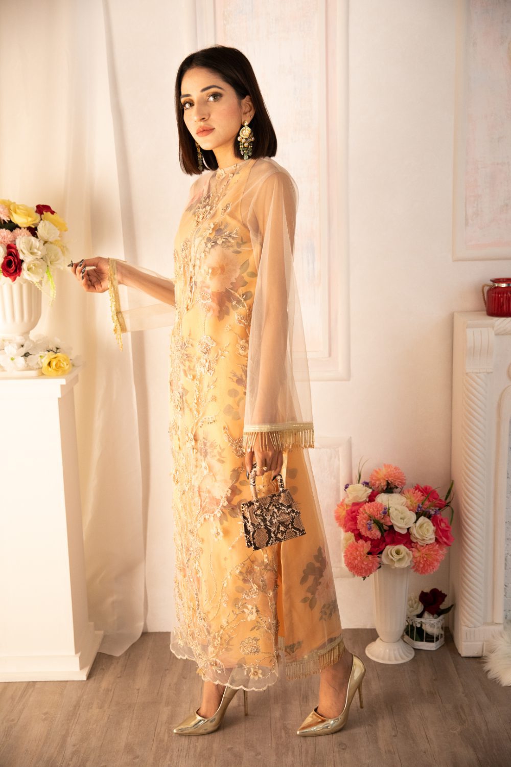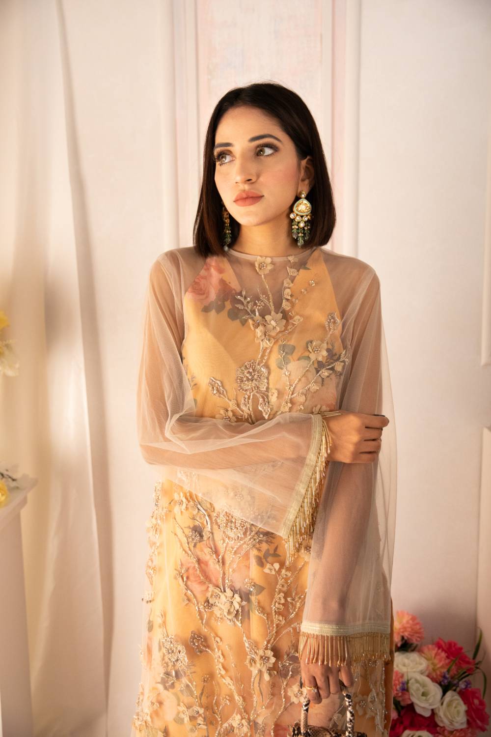 Intricately handcrafted long shirt on net canvas with overall subtle embellishments. The inner shirt is tailored with customized floral organza fabric. Paired with sleek and stylish cigarette pants. This outfit is sure to make you stand out in any of your summer soirees! \n