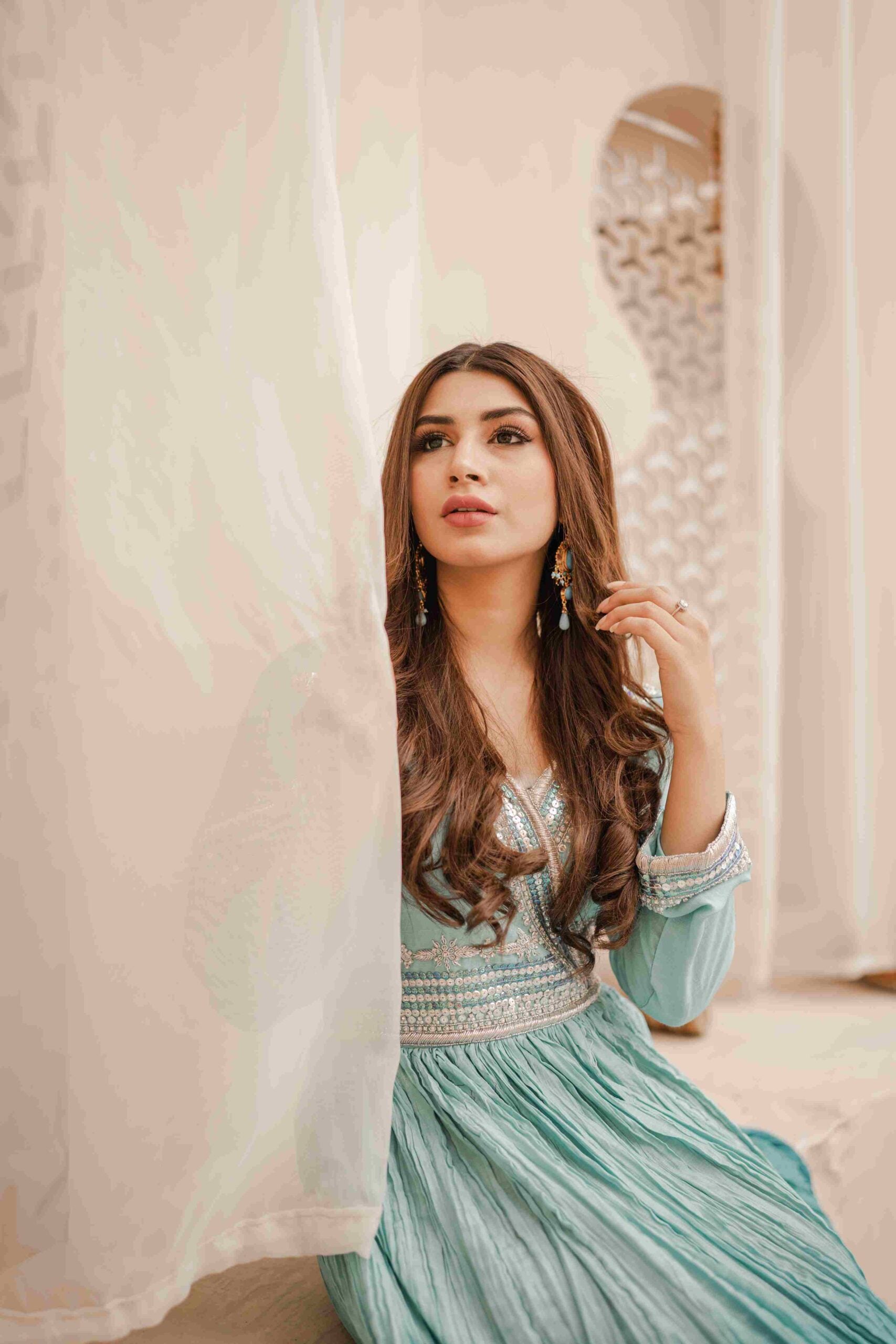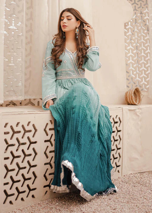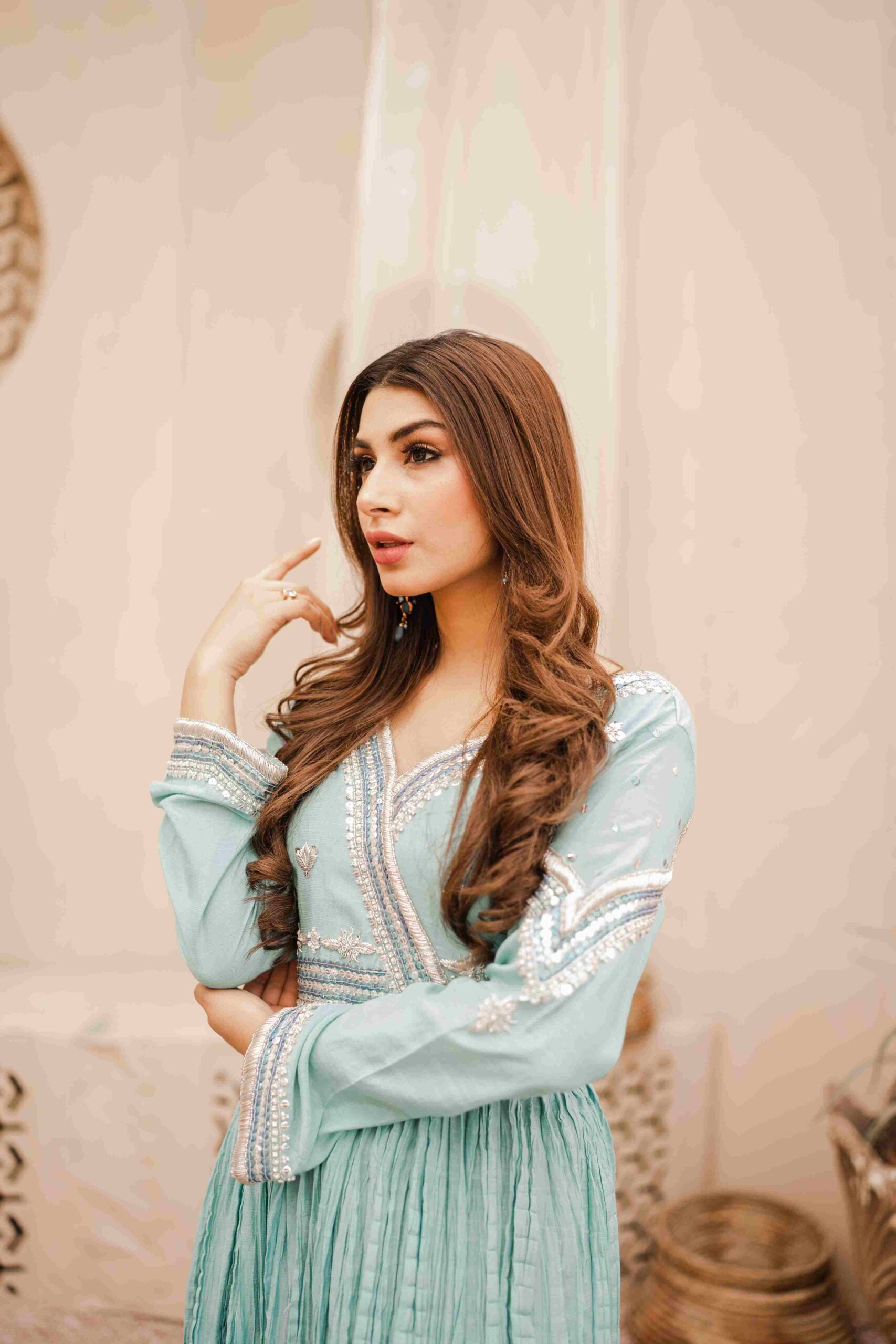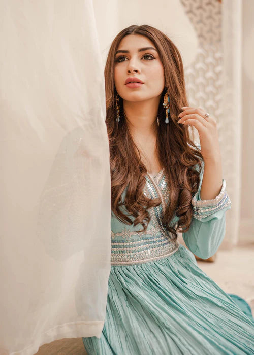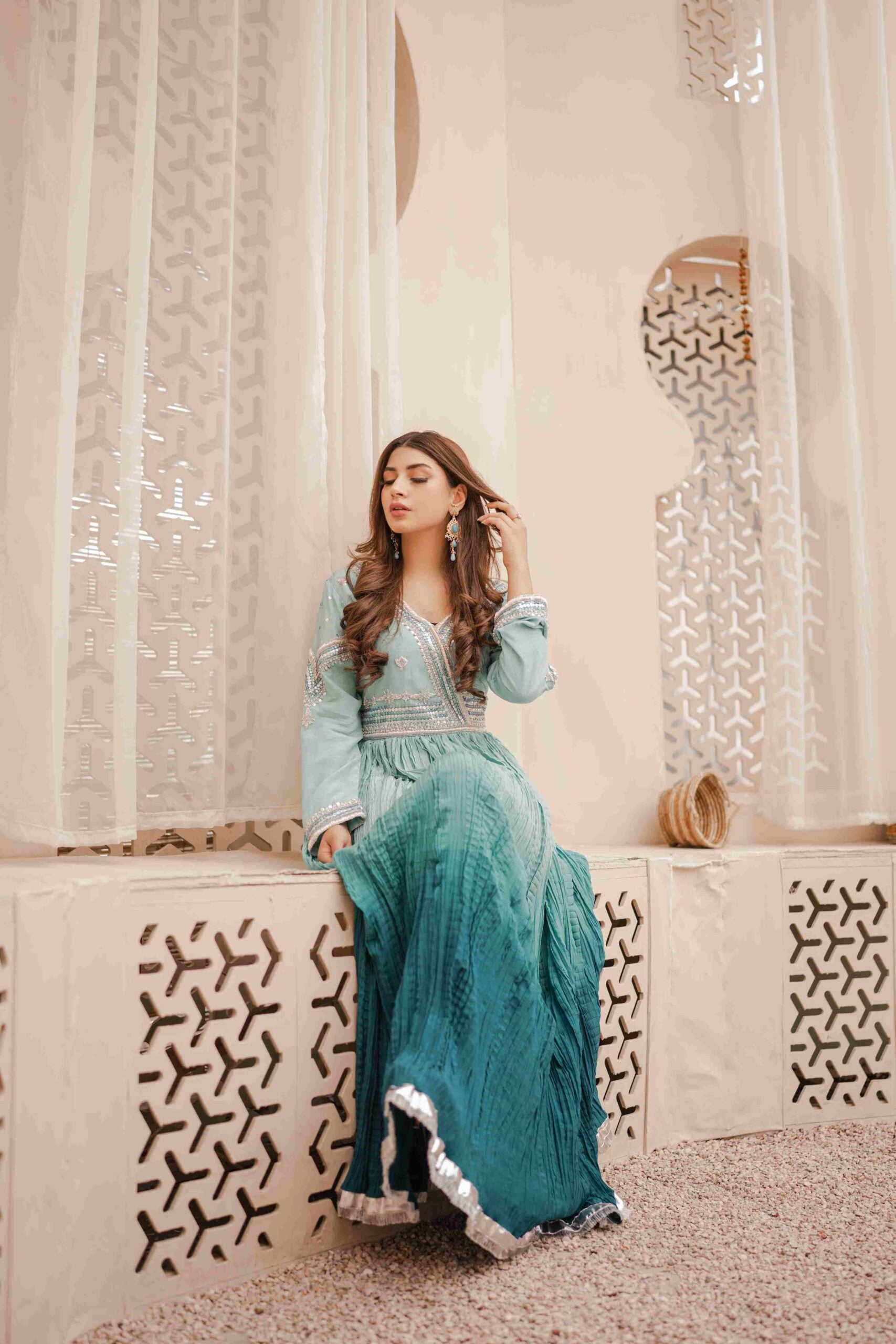 Elegant and gracefully designed 2 piece contemporary dress with a Mughal touch will make you look perfect. Panels of solid ivory hue stitched into a long flared peshwas. The chiffon bodice and sleeves are hand embellished with the best material and delicate motifs with embroidered geometric details. An added hand worked belt detail adds to this gorgeous ensemble. A crushed pink dupatta with traditional details is paired with the piece. |