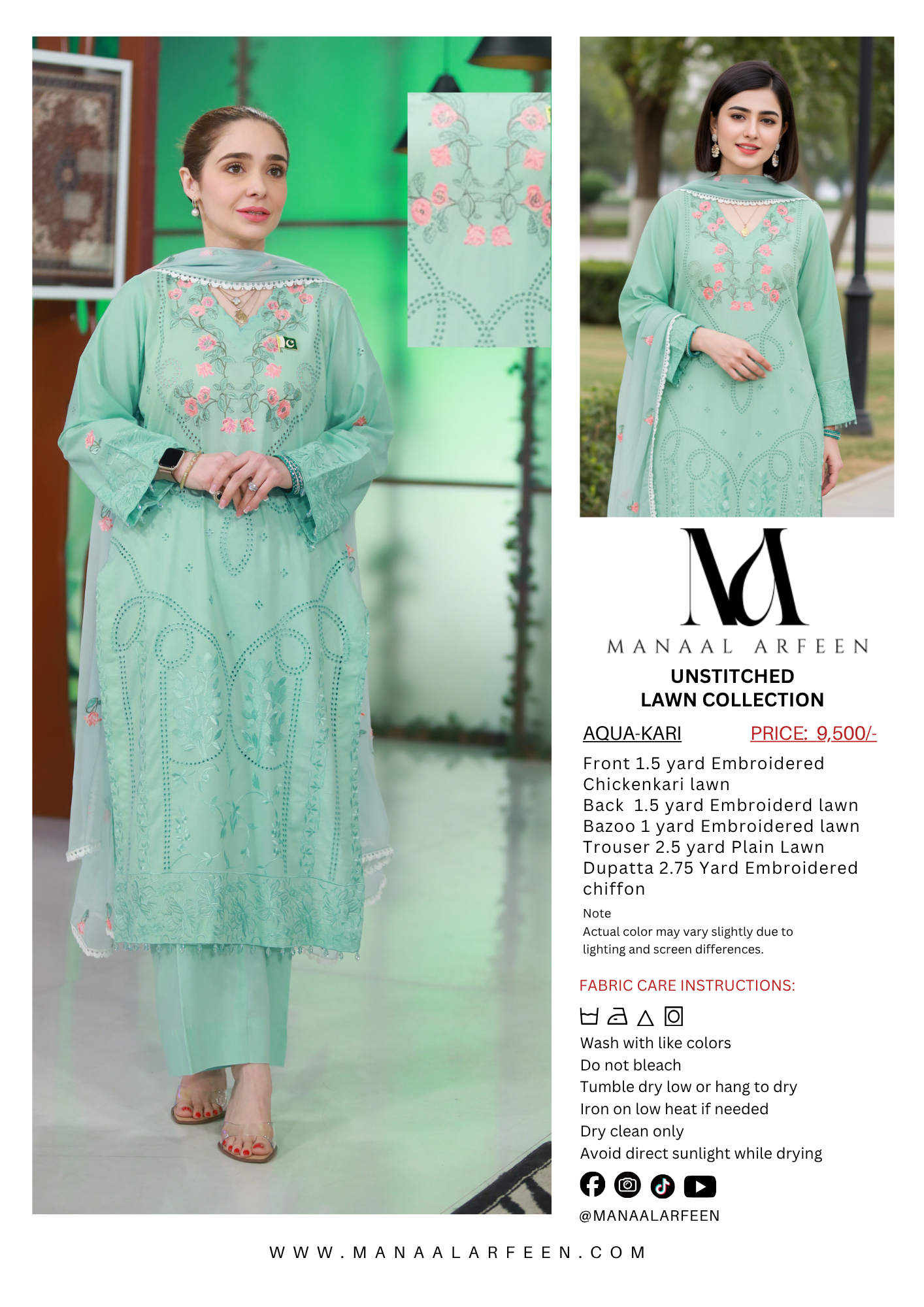 Crafted on premium lawn, this ensemble features a long silhouette shirt with double panels on both front and back, delicately adorned with lace inserts and embellishment on daman and sleeves. Intricate chicken kari embroidery graces the front, back, and sleeves, adding texture and elegance to every inch.