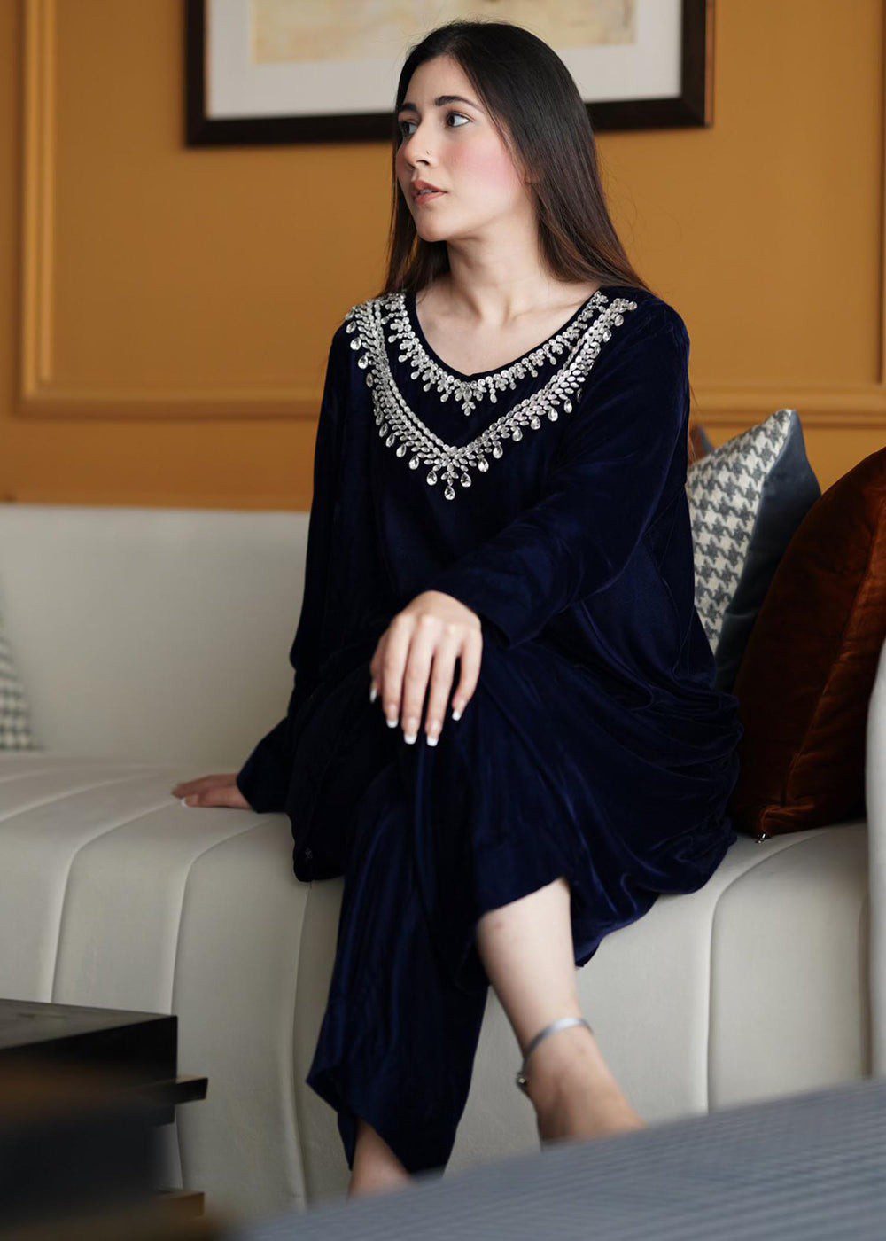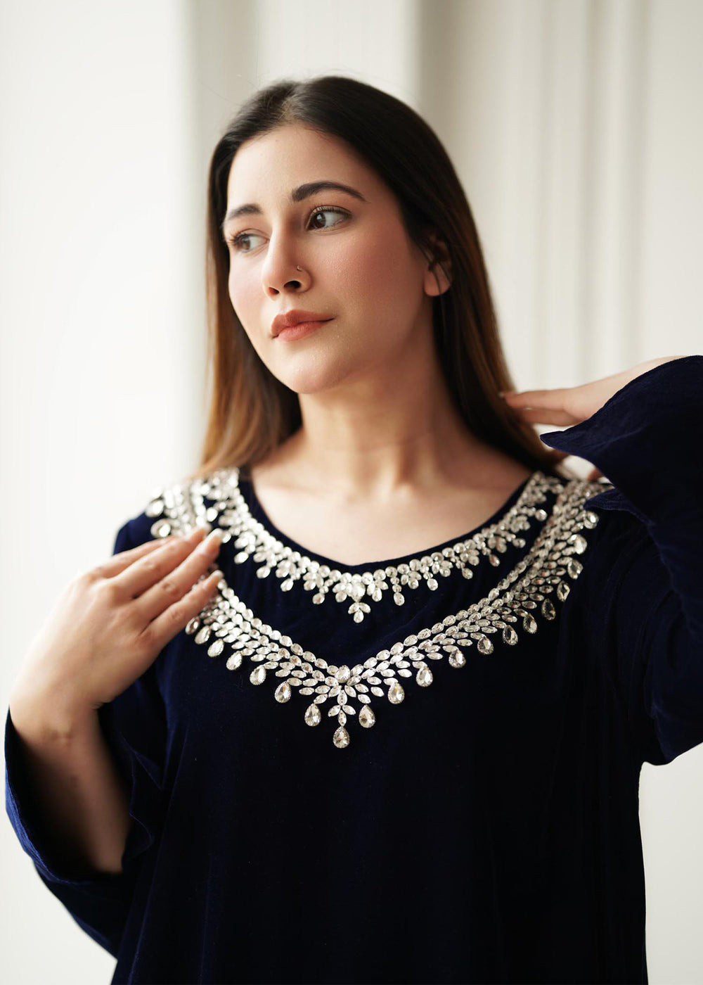 Description: Assymetical Shirt with the handwork. We have used the best crystals on neckline to create this magical look. Comes with bootcut trouser. We make this style in other fabrics too.