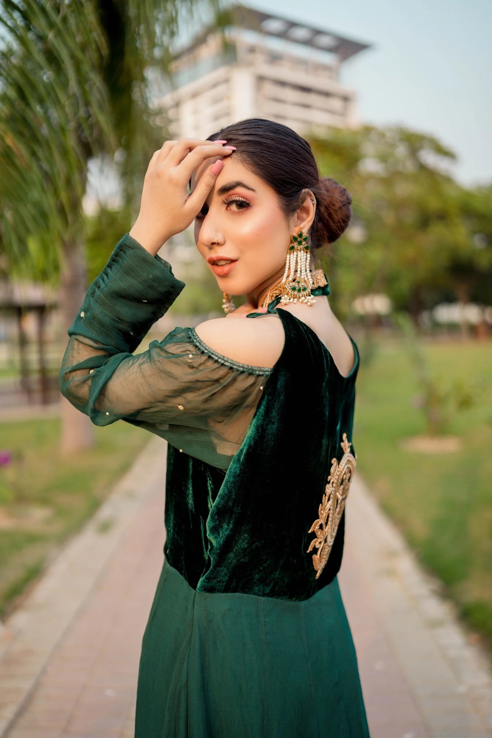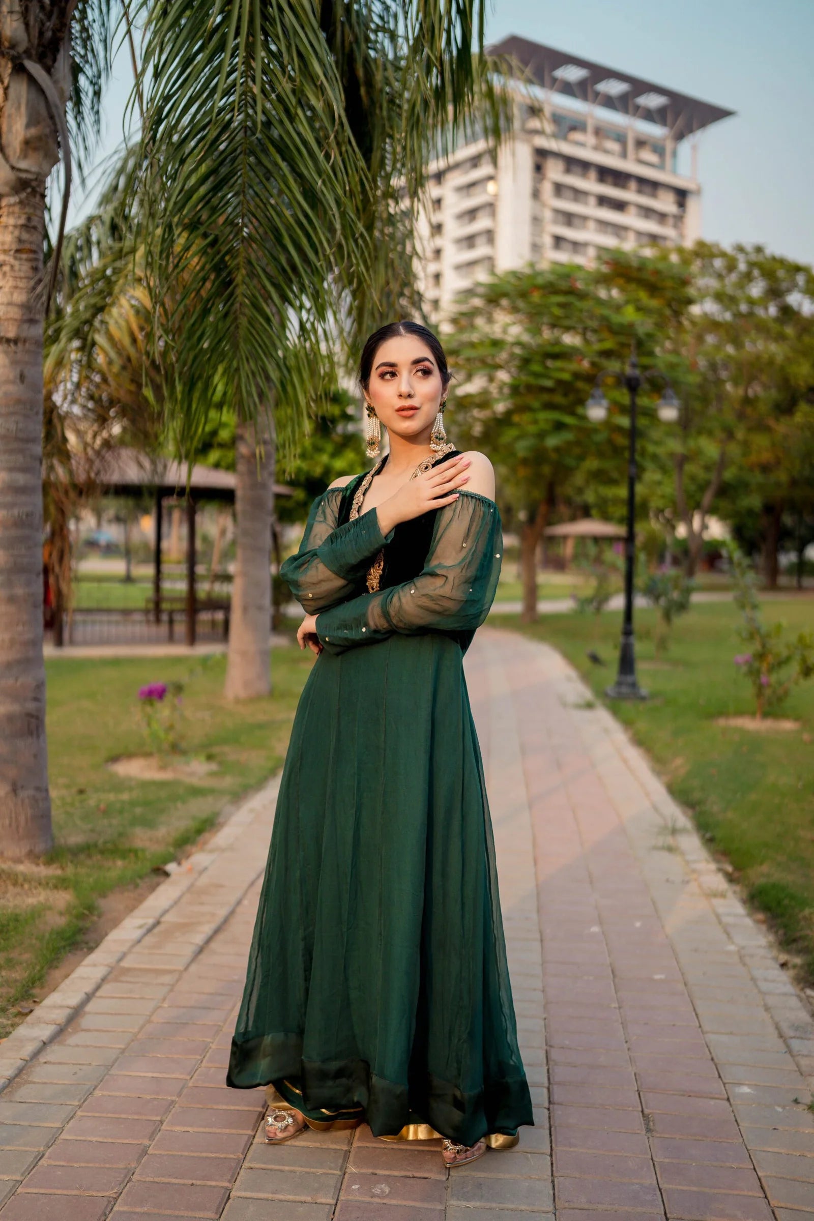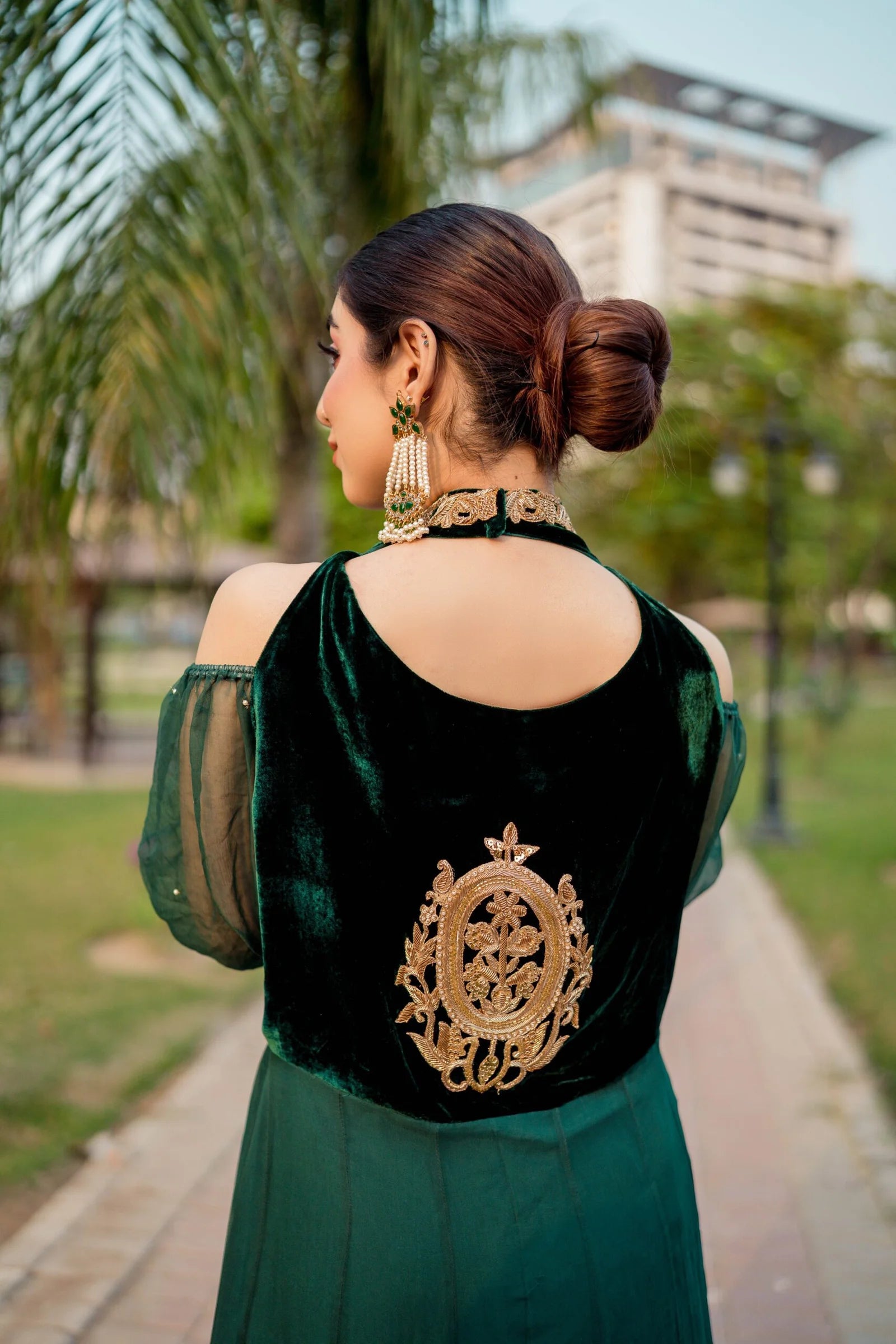 A traditional yet contemporary long dress with a beautiful cut, hand-worked neckline, embellished sleeves, and velvet bodice and hand-worked motif on the back.
