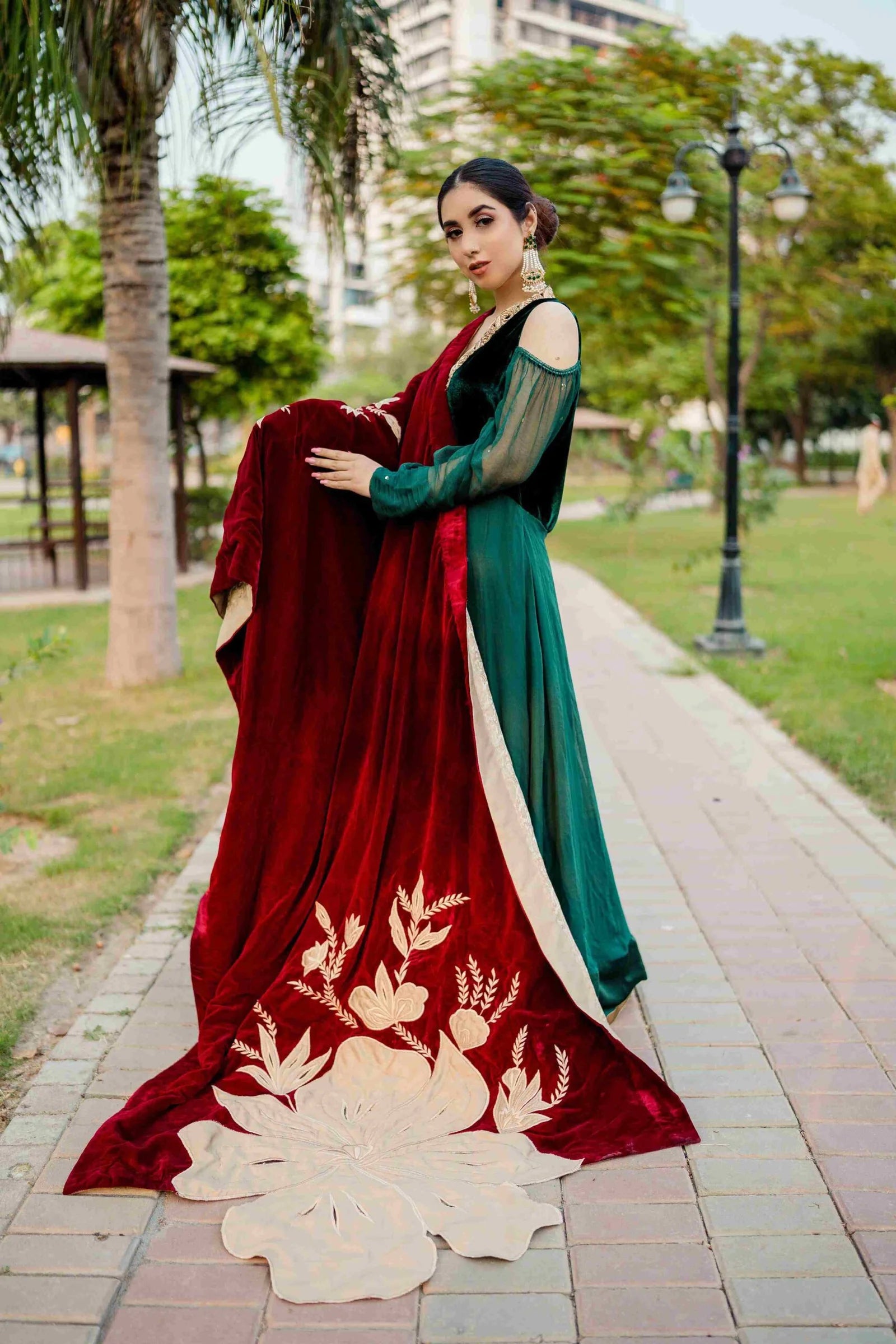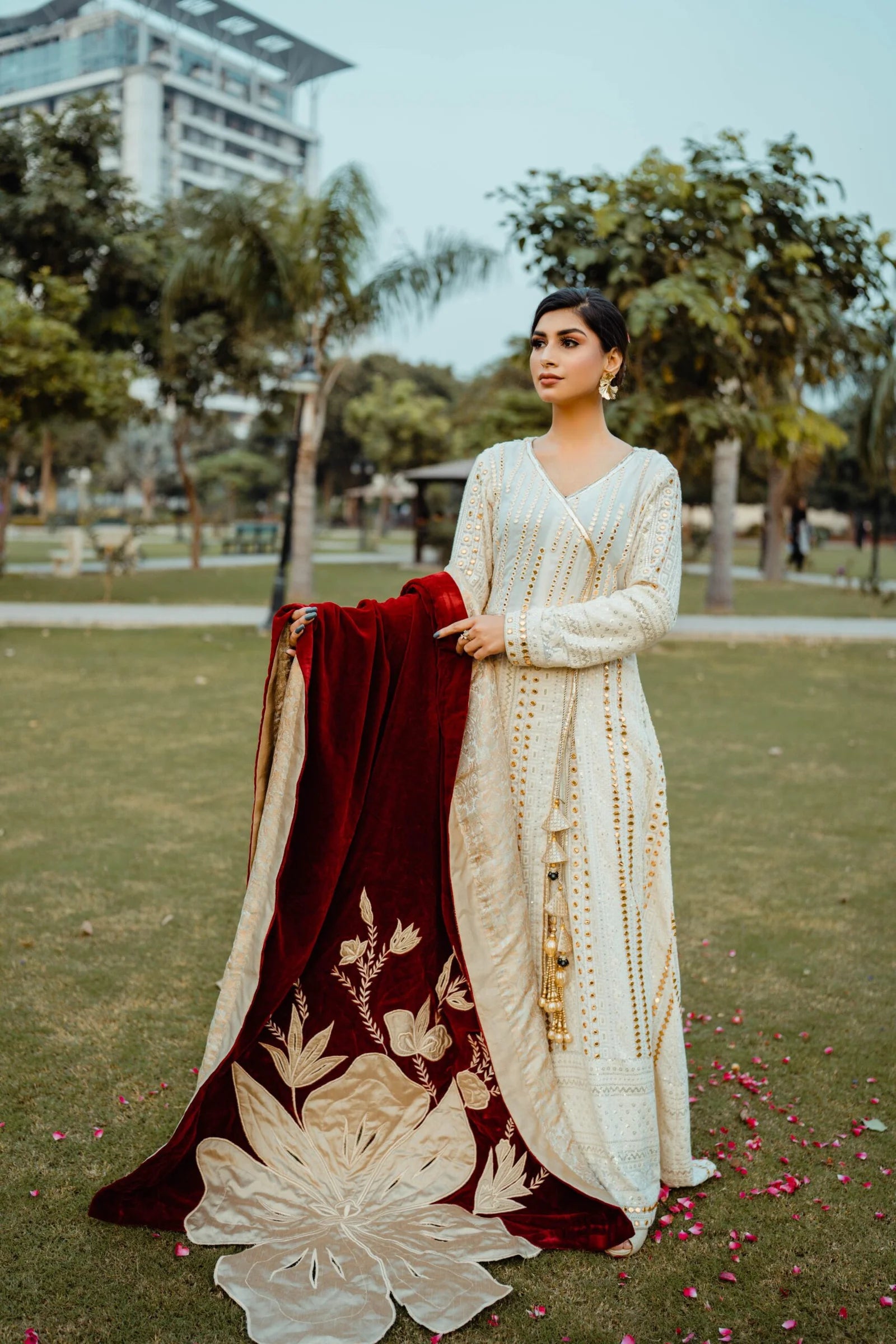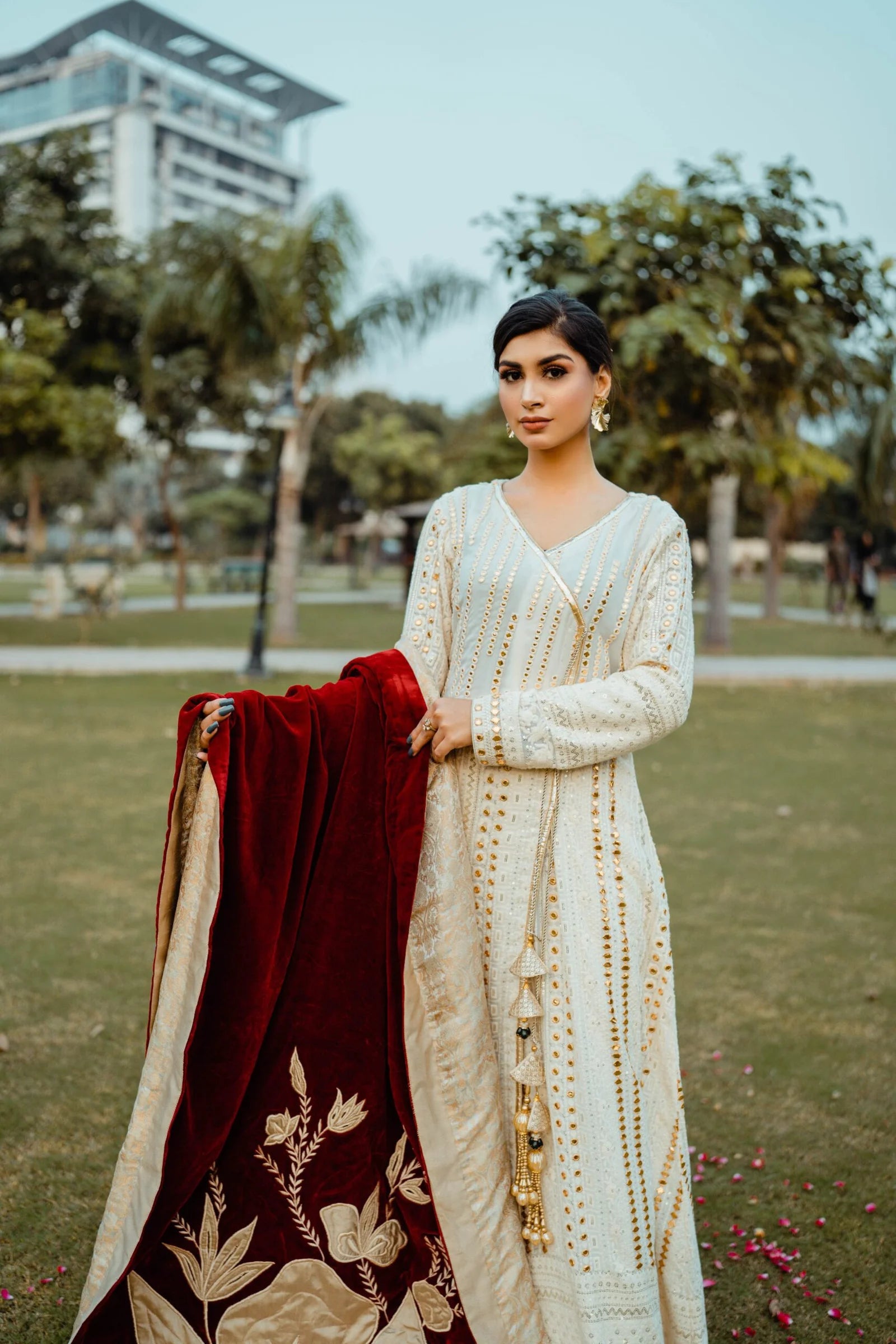 This luxury shawl comes with artistically designed floral motifs, cutwork, resham work embroidered details. Made on best quality velvet fabric. This luxury piece is designed with off-white and dull gold jamawar. Raw silk edging adds to its finish. Can be worn separately on a plain dress or pair it with angrakha to get a royal look.