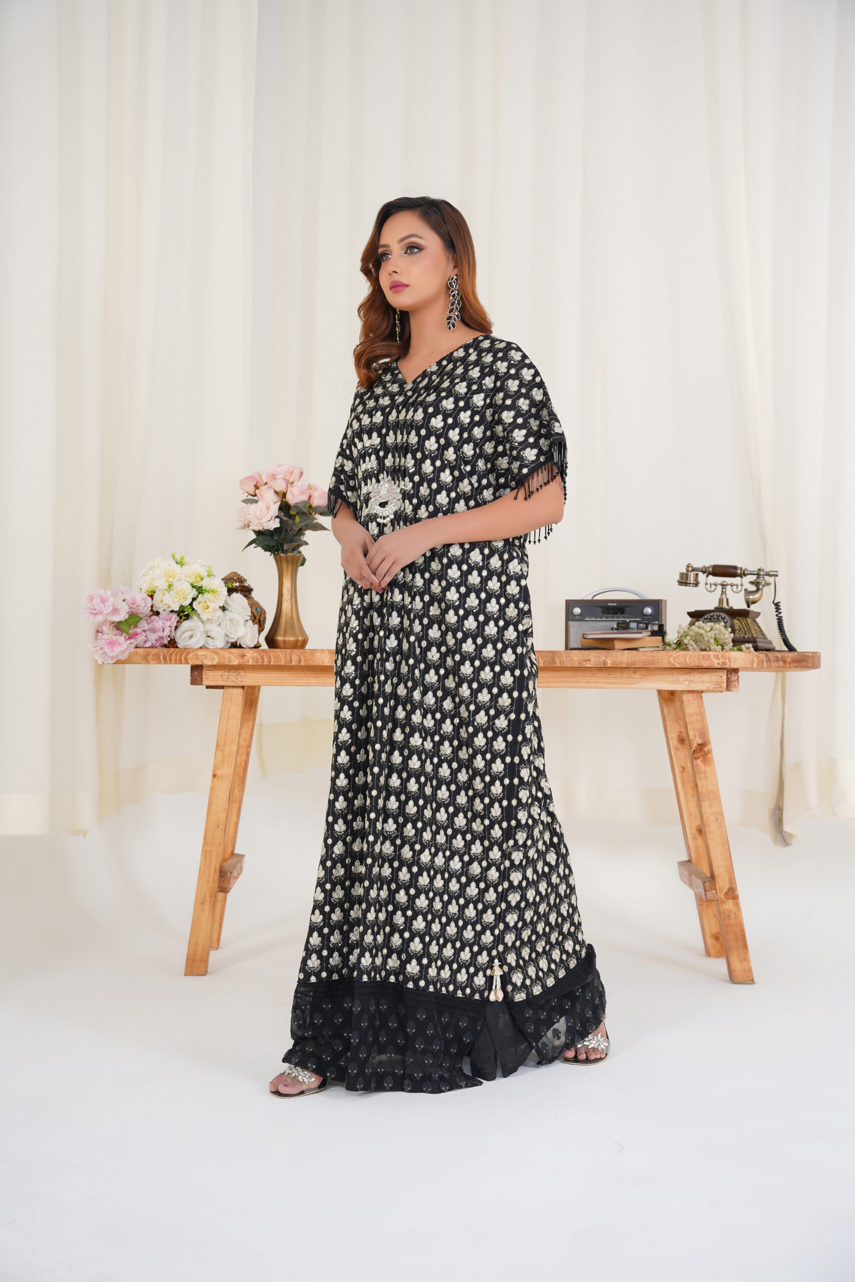 Crafted from the finest panni work and sequins fabric, this stunning kaftan features a long slip for an elegant silhouette. We have enhanced the design with exquisite handmade motifs, and the back of the neck showcases beautiful detailing that adds a unique touch. The slits are adorned with assorted tassels, further elevating the overall look. This two-piece ensemble is perfect for making a stylish statement. Disclaimer: Actual product color may vary slightly from the image.