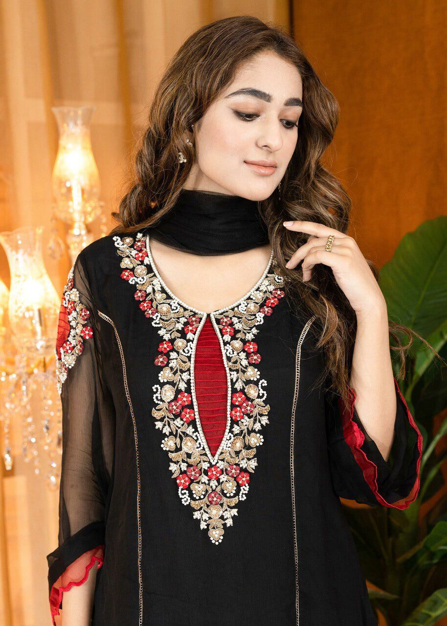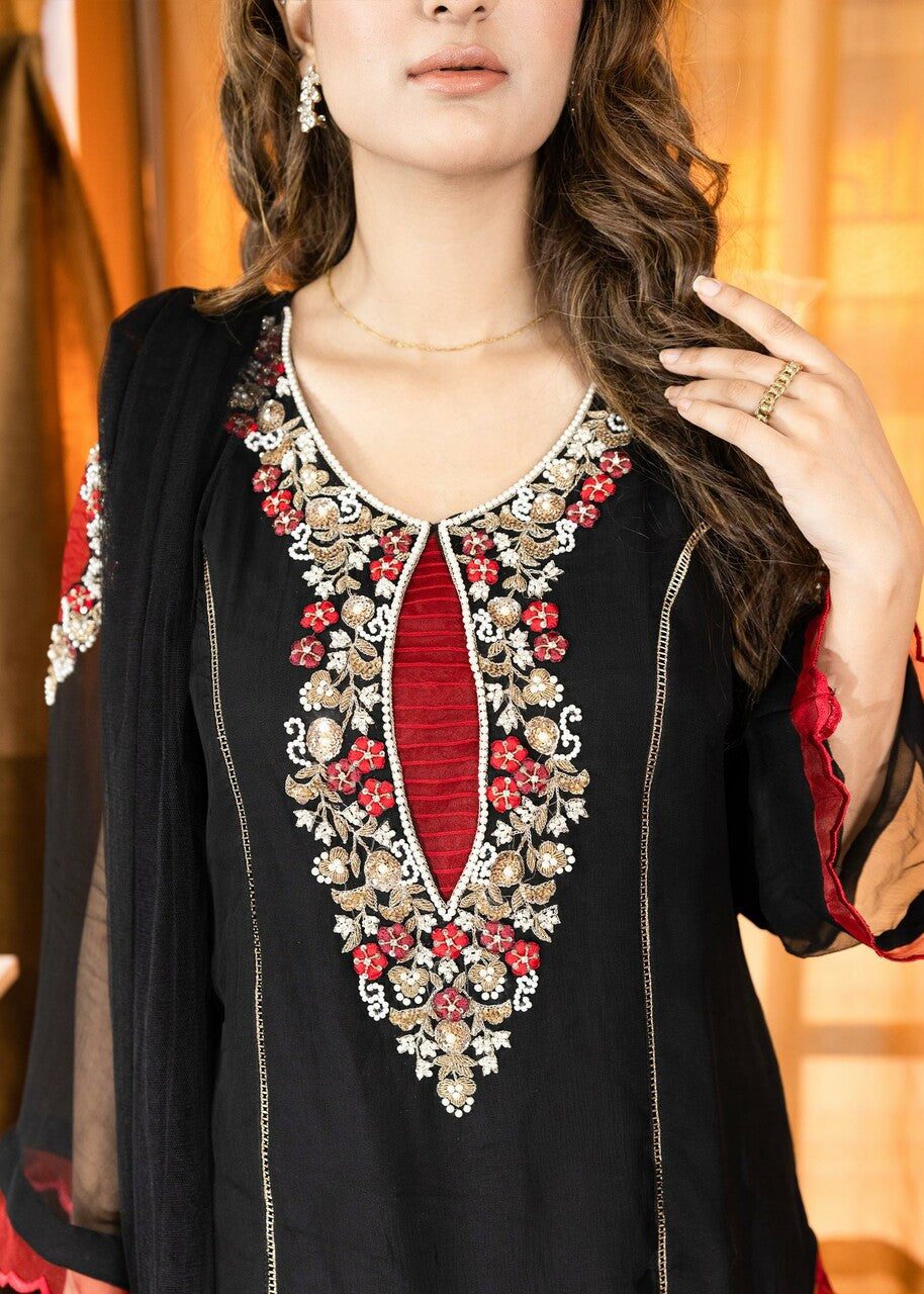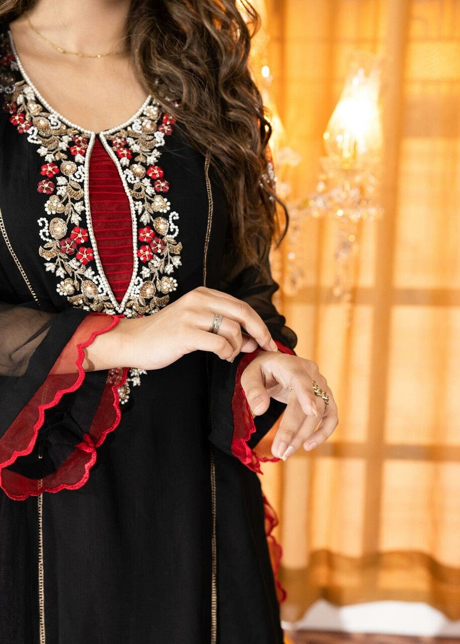 Description: classic combination of black and red makes this article our best seller. Long chiffon shirt with paneled details, embroidered neckline with assorted roses embellished with pearls, crystals, zari and dabka. We have added matching motif on sleeves to give it a complete look. Scalloped with red organza gives the article more elegant touch. Can be paired with organza pleated dupatta. Disclaimer: The color of the outfit may vary due to the lighting effect used in the photography.