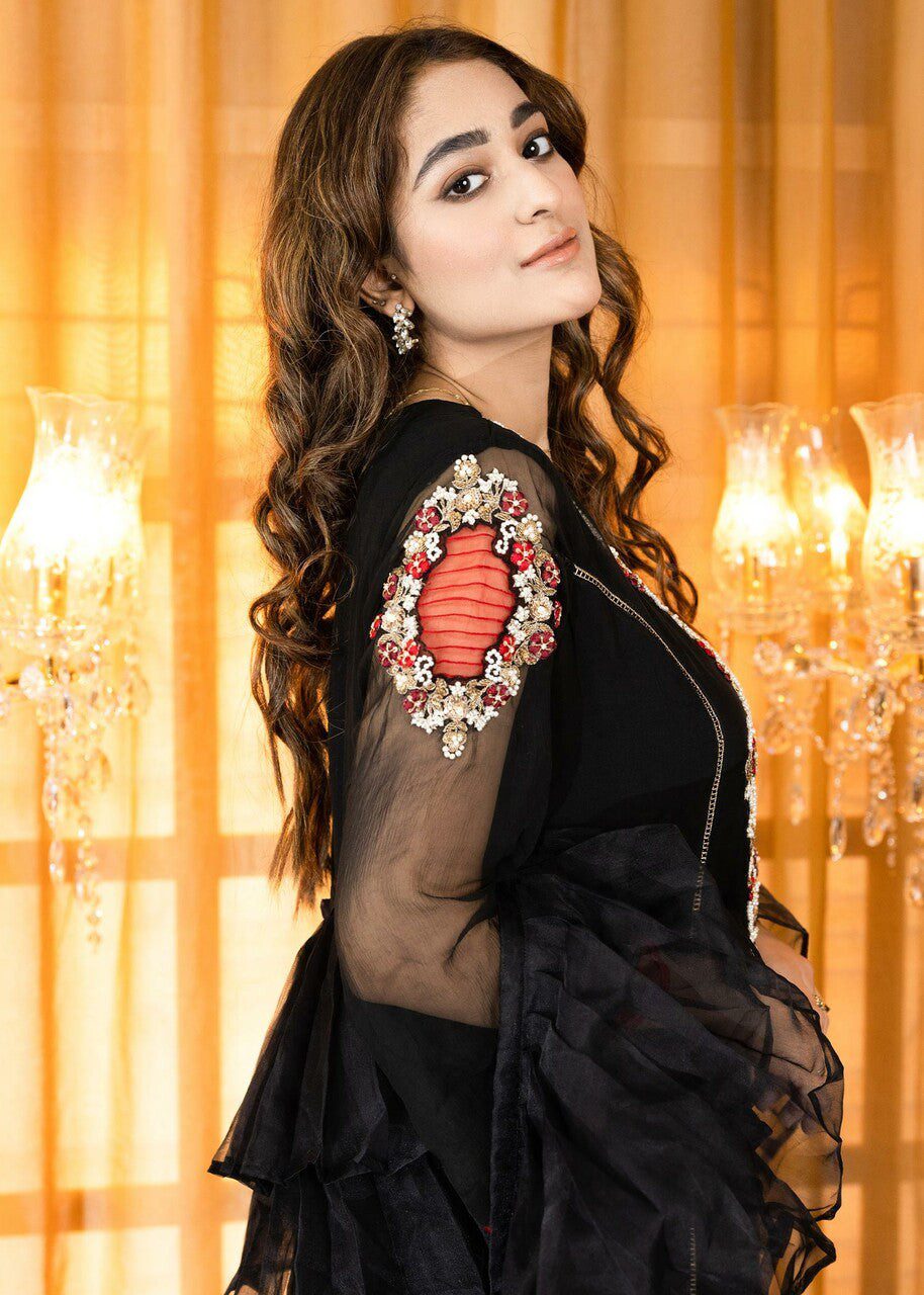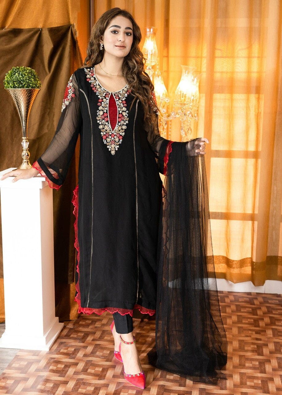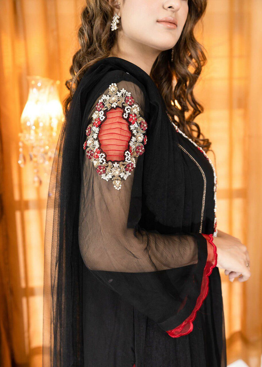Description: classic combination of black and red makes this article our best seller. Long chiffon shirt with paneled details, embroidered neckline with assorted roses embellished with pearls, crystals, zari and dabka. We have added matching motif on sleeves to give it a complete look. Scalloped with red organza gives the article more elegant touch. Can be paired with organza pleated dupatta. Disclaimer: The color of the outfit may vary due to the lighting effect used in the photography.