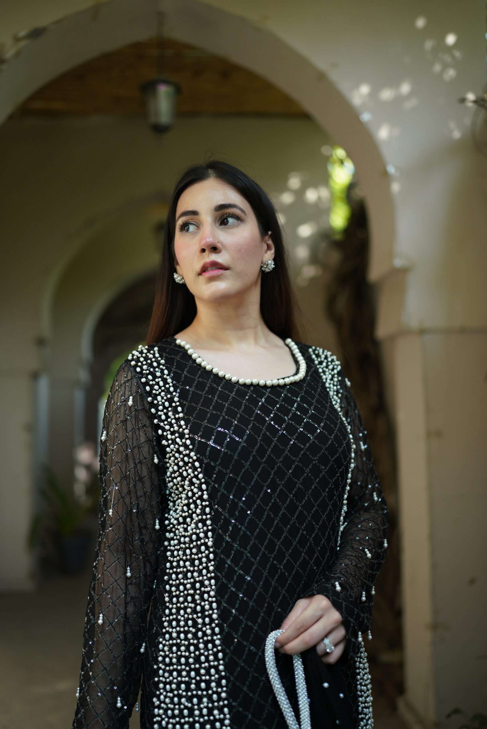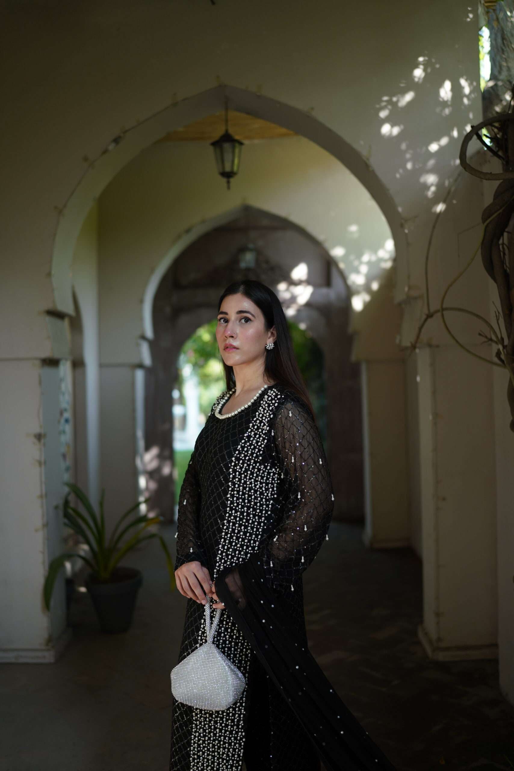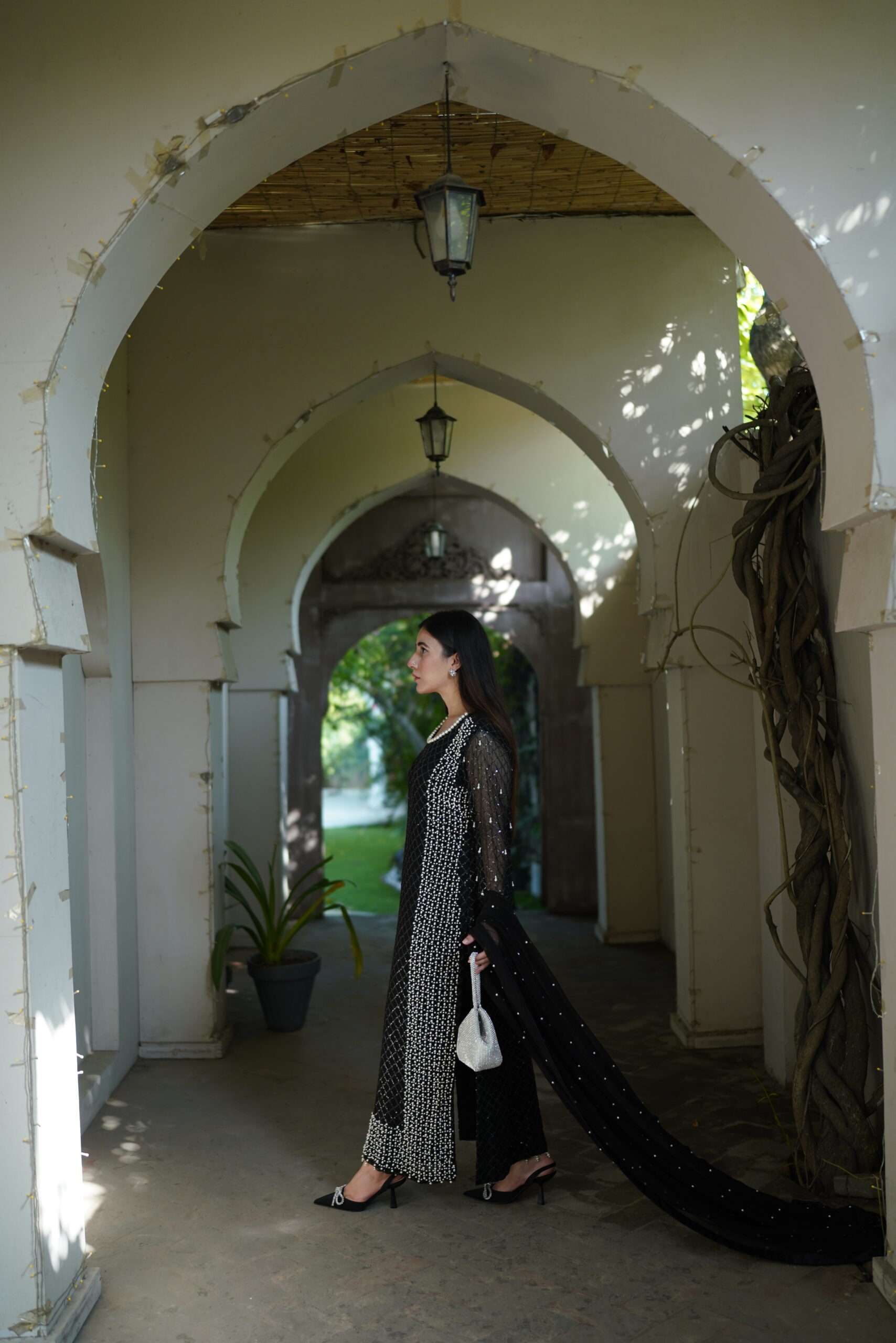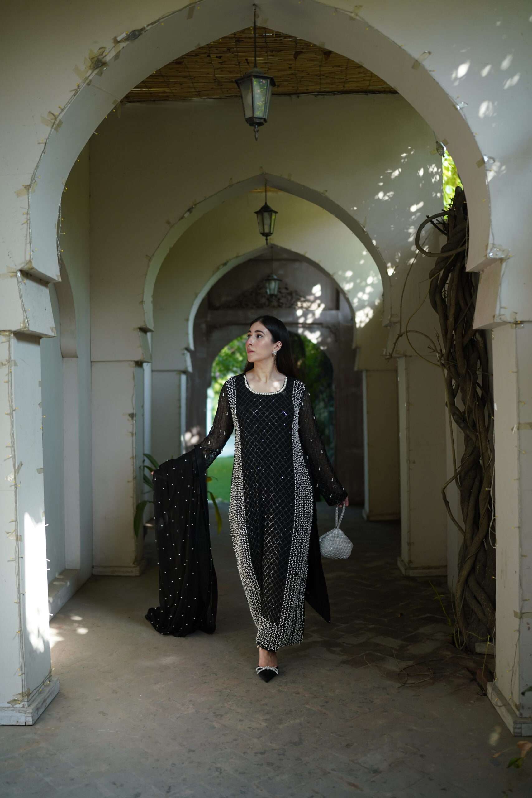 A glimmering article with handwork using the best pearls. This sparkling yet sophisticated article will make you stand out from the rest in any occasion. Comes with chiffon dupatta having pretty frill details on borders. Straight trouser with crisscross fabric gives the article delicate details to complete the look.