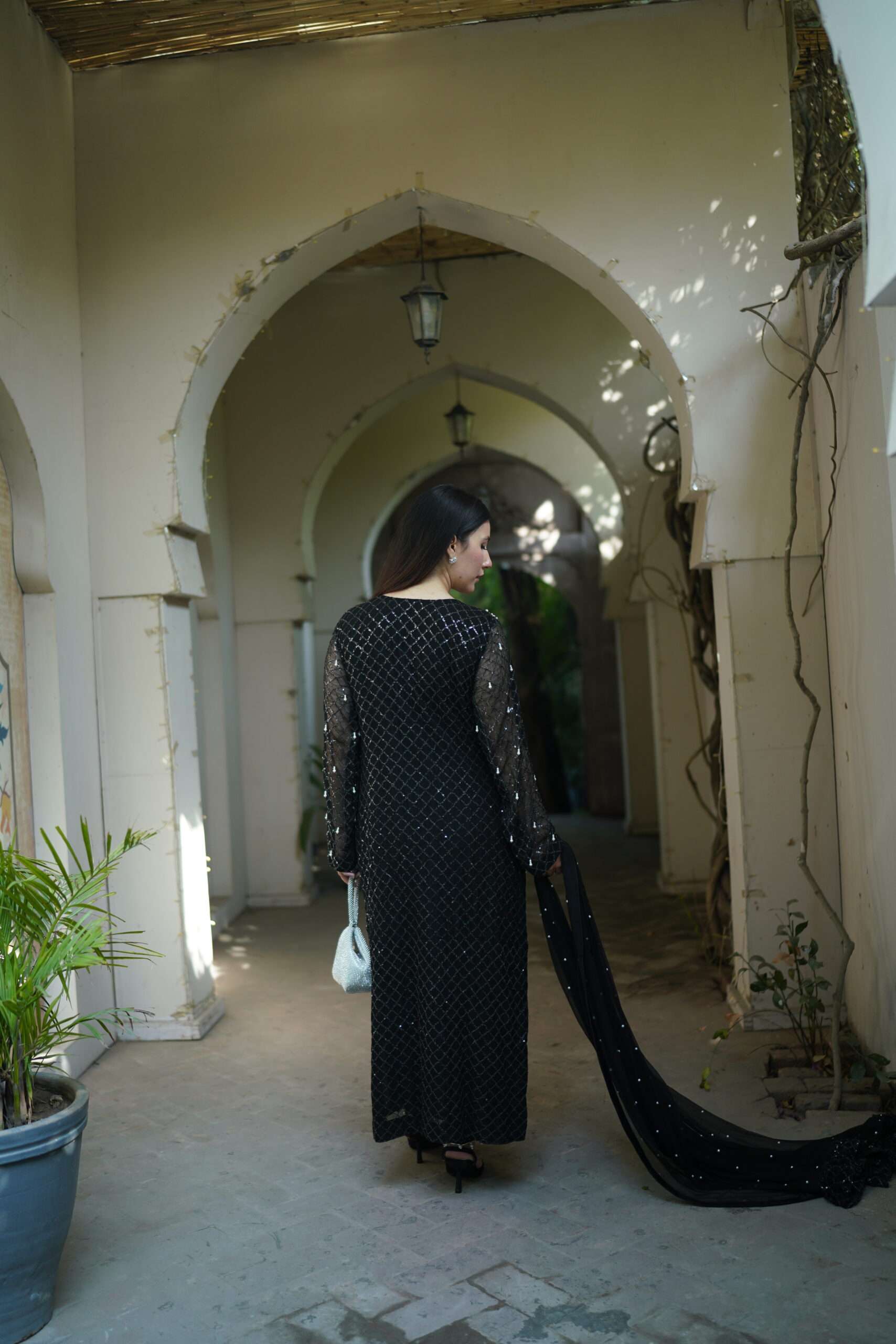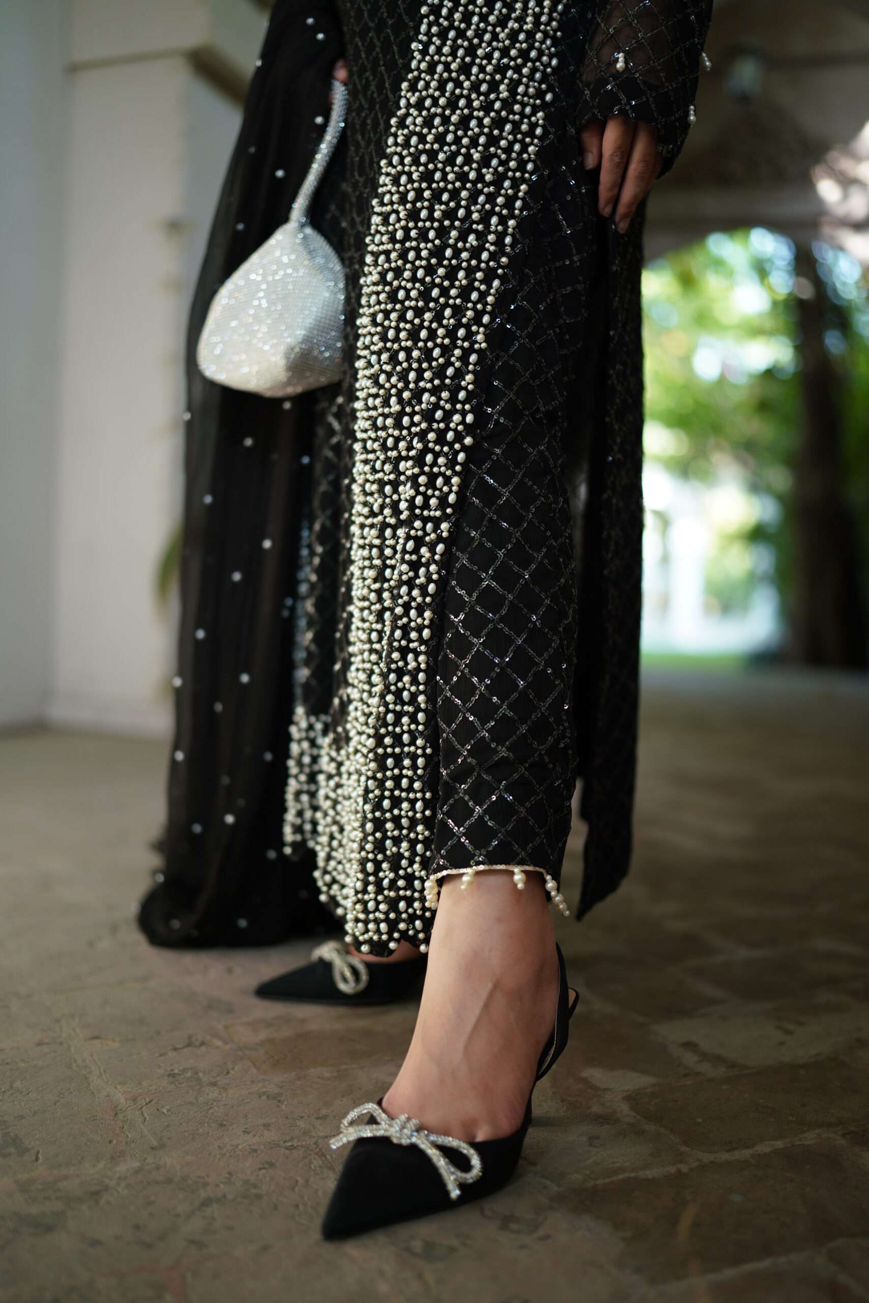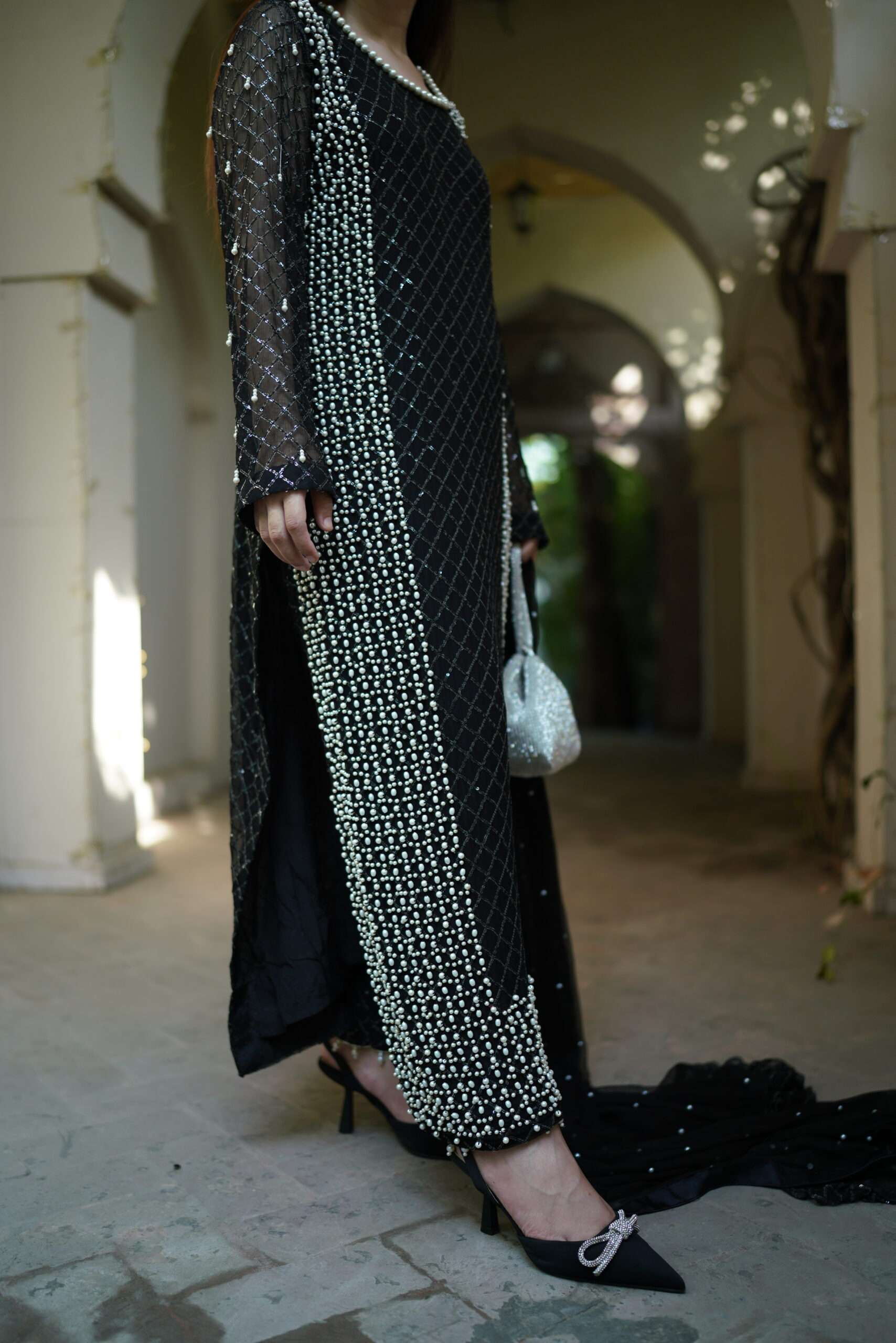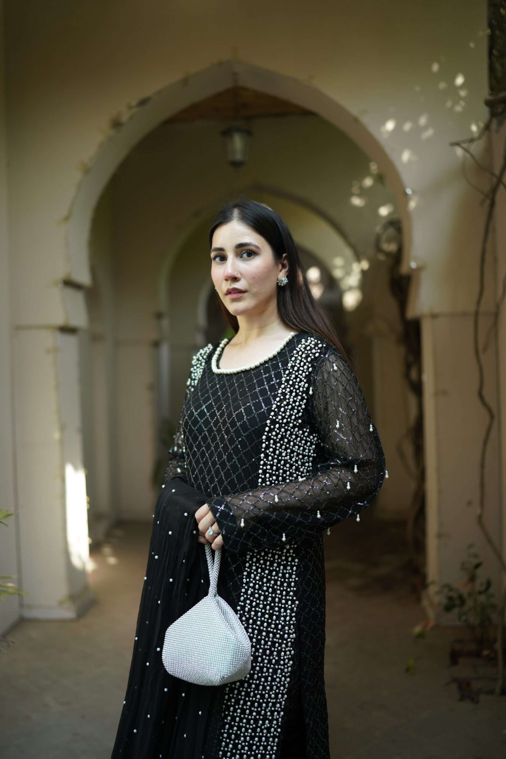 A glimmering article with handwork using the best pearls. This sparkling yet sophisticated article will make you stand out from the rest in any occasion. Comes with chiffon dupatta having pretty frill details on borders. Straight trouser with crisscross fabric gives the article delicate details to complete the look.
