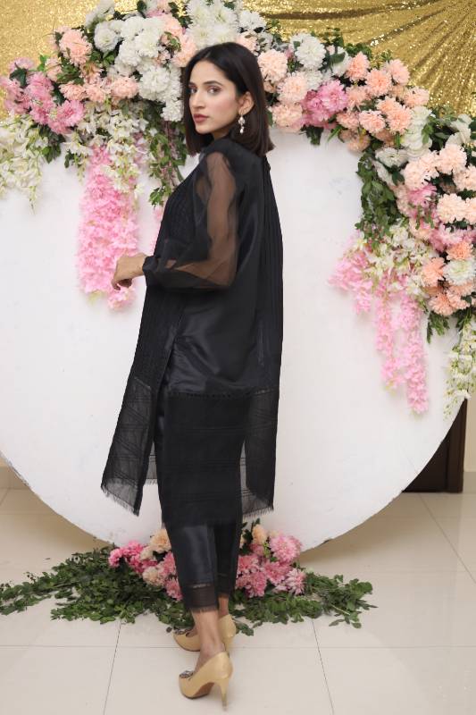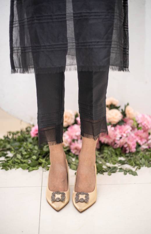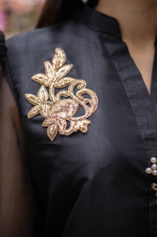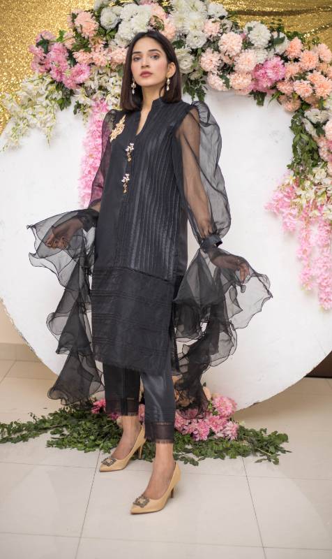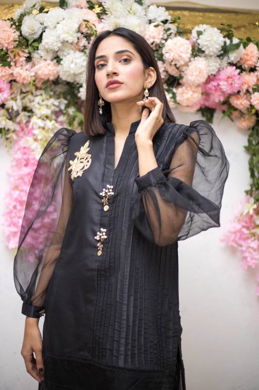 Gorgeously pleated dress with frayed edges and delicate handwork embroidery along with fine embellishments. This beautiful shirt comes with renaissance style puffy sleeves. The front and back of the dress are designed to perfection.