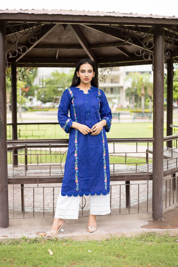 Lawn cotton chicken Kari shirt in Royal blue. Scalloped neckline with details of pearls. Embroidered to perfection. Can be paired with chicken Kari trouser. Available separately.