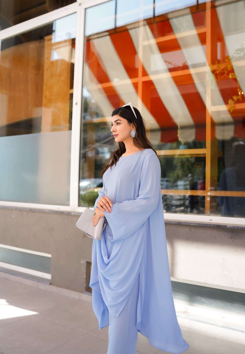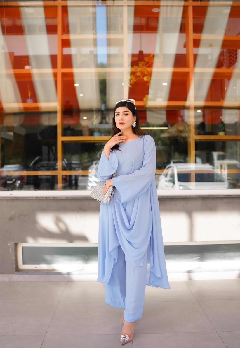 When it comes to style, no one beats us! Casual, easy to carry yet beautifully designed, this piece from our flaunt cuts will surely make heads turn! This ensemble in baby blue and georgette is surely going to make you feel beautiful and unique!