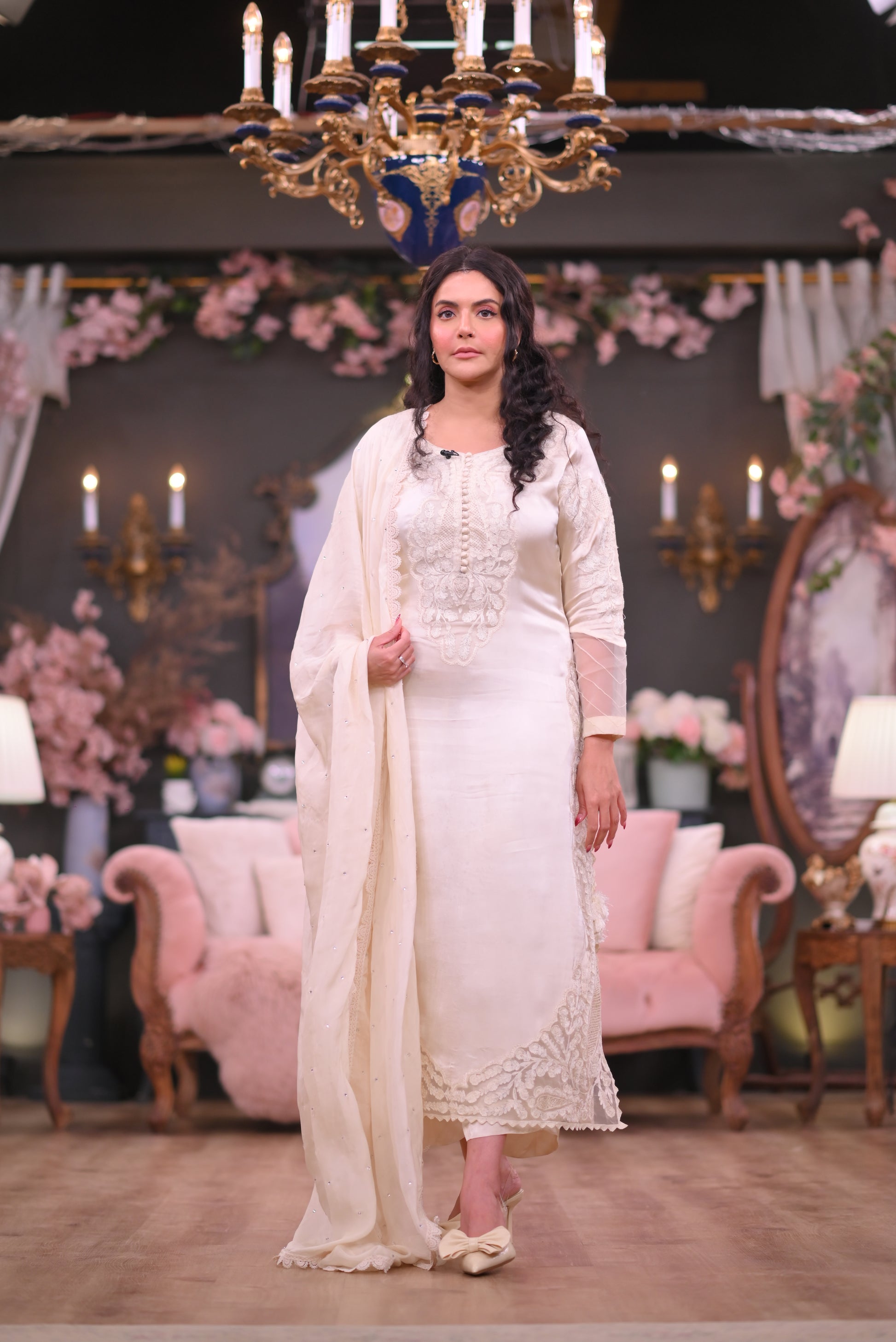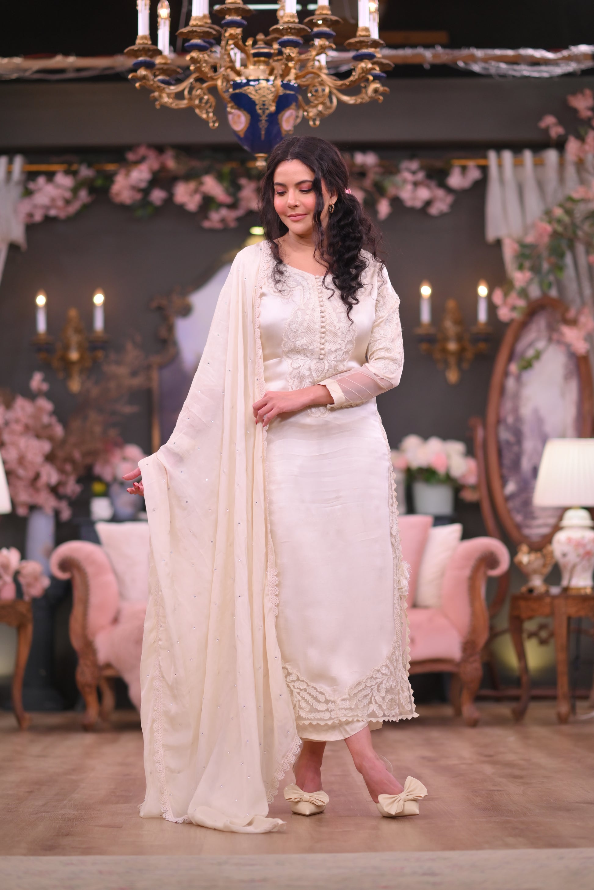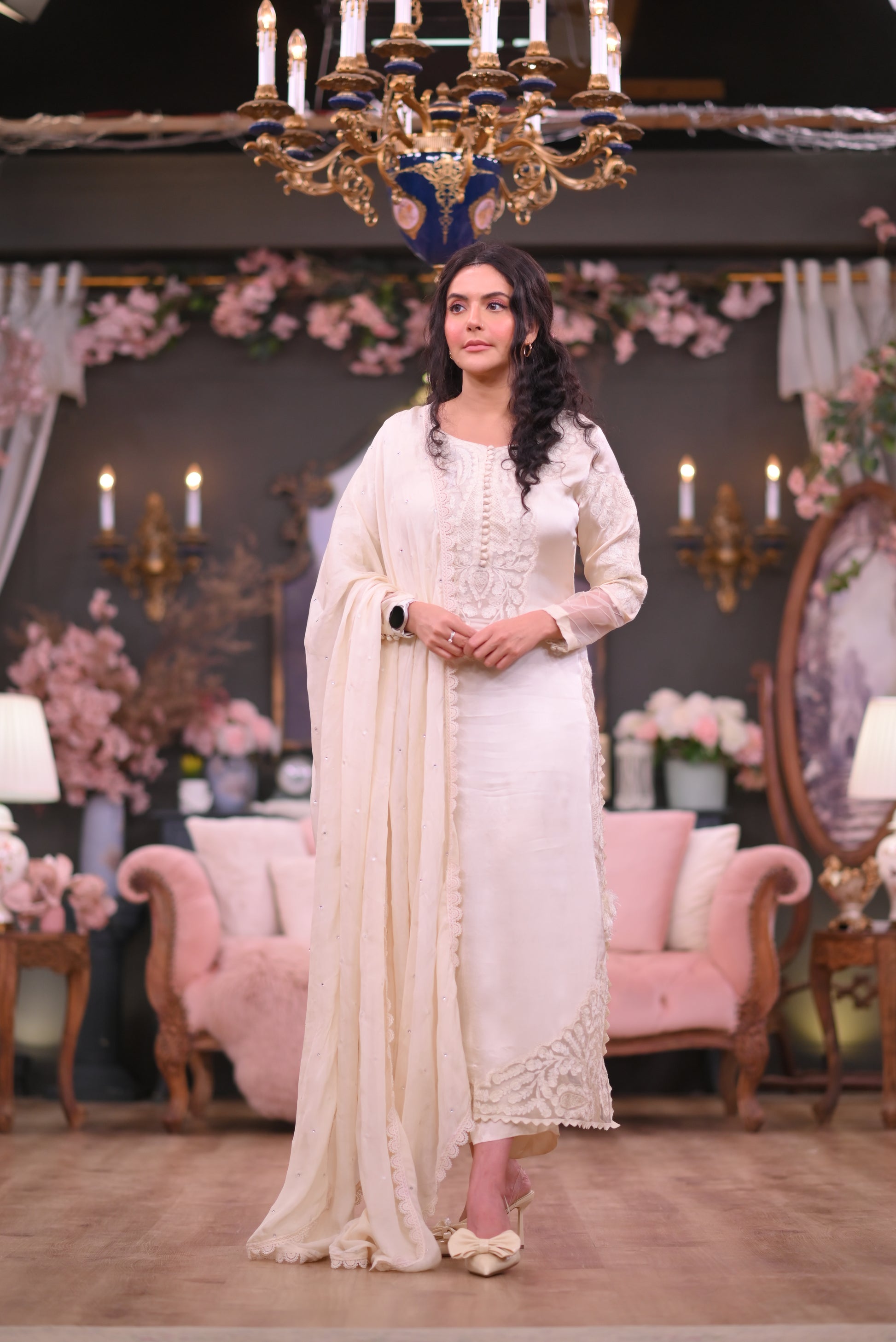 Shine like a moon in our off white cream ensemble. Made in finest charmeuse silk the long shirt silhouette makes you look elegant. Our traditional ari work on neckline and finished with loop button details along with work on daman, side hems front and back of shirt makes this outfit traditional yet modern. Keeping the low slit trend alive with handmade tussles and the sleeves adorned with just the right amount of organza. Craftmanship on the hems where we have used organza with silk is awesome attention to detail. Paired with medium silk dupatta comes with crystal spray and wide legged pants in charmeuse silk.