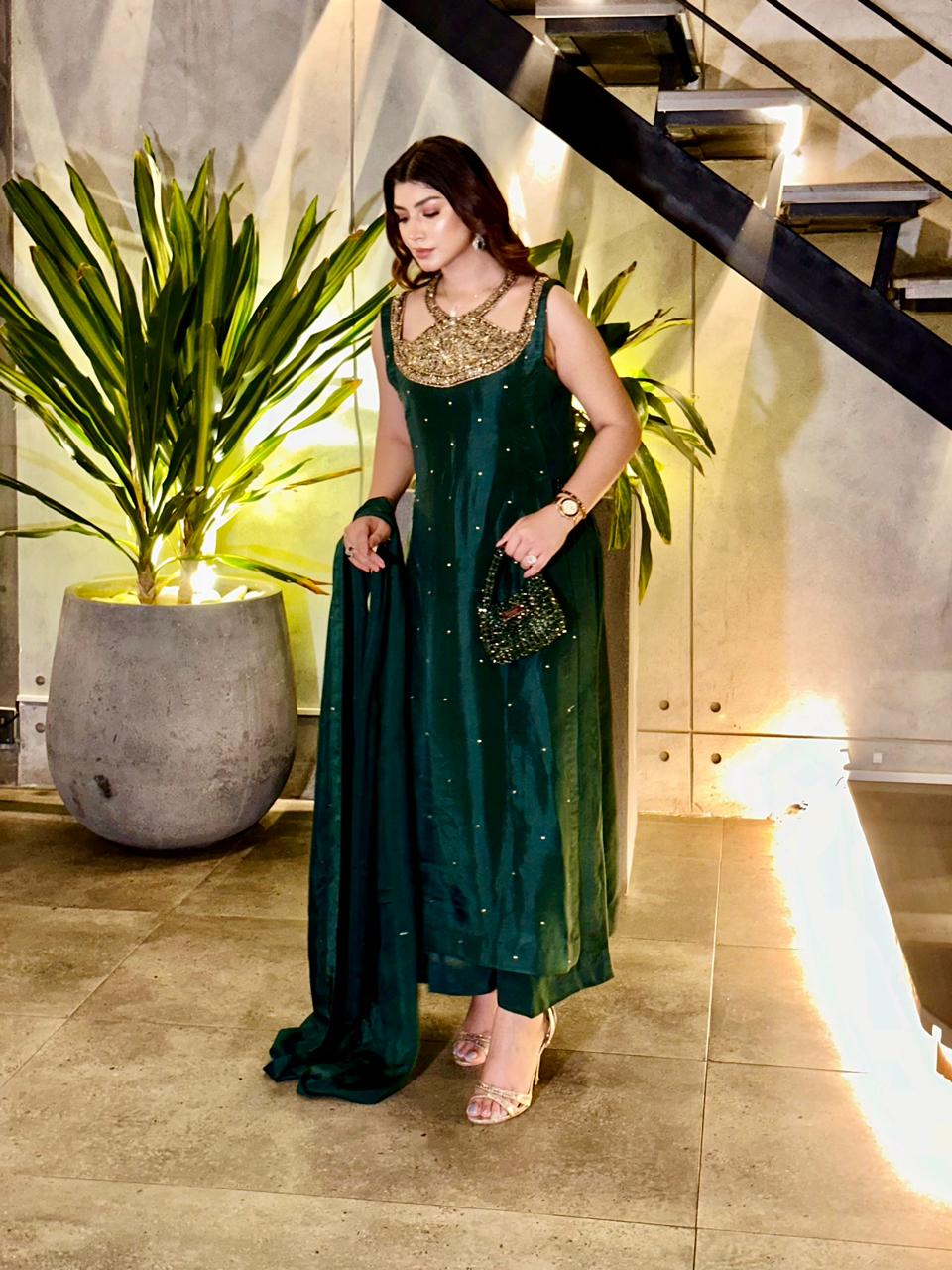 This mesmerizing ensemble is a masterpiece of artistry and elegance. Each detail of this three-piece outfit is meticulously handcrafted to bring forth its exquisite beauty. The contemporary neckline, embellished with intricate kora, dabka, tilla, and shimmering sequins, exudes a sense of luxury and sophistication. The shirt glistens with a delicate spray of sequins, adding a touch of glamour. Customizable with sleeves upon request, this ensemble is flawlessly paired with sleek straight pants and a medium silk dupatta, creating a look that evokes pure allure and charm.