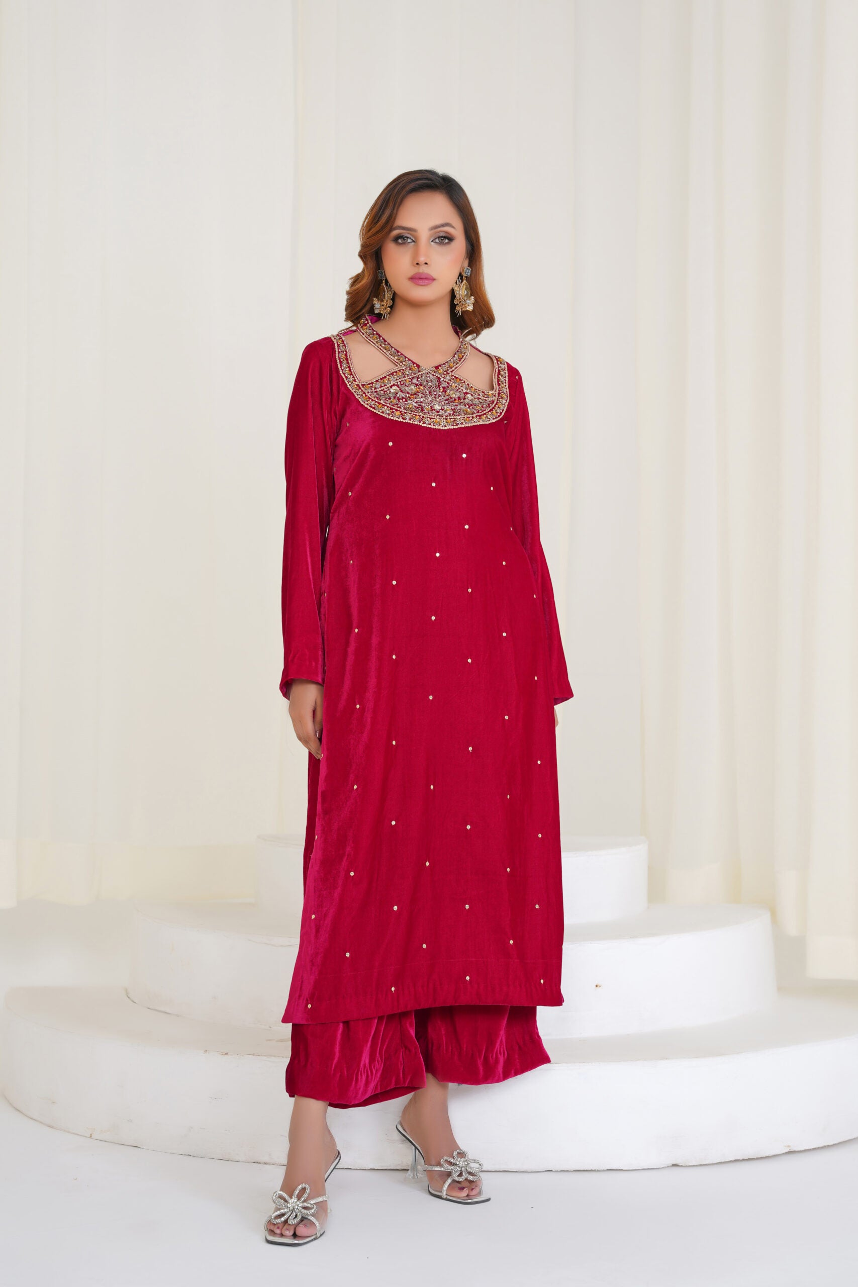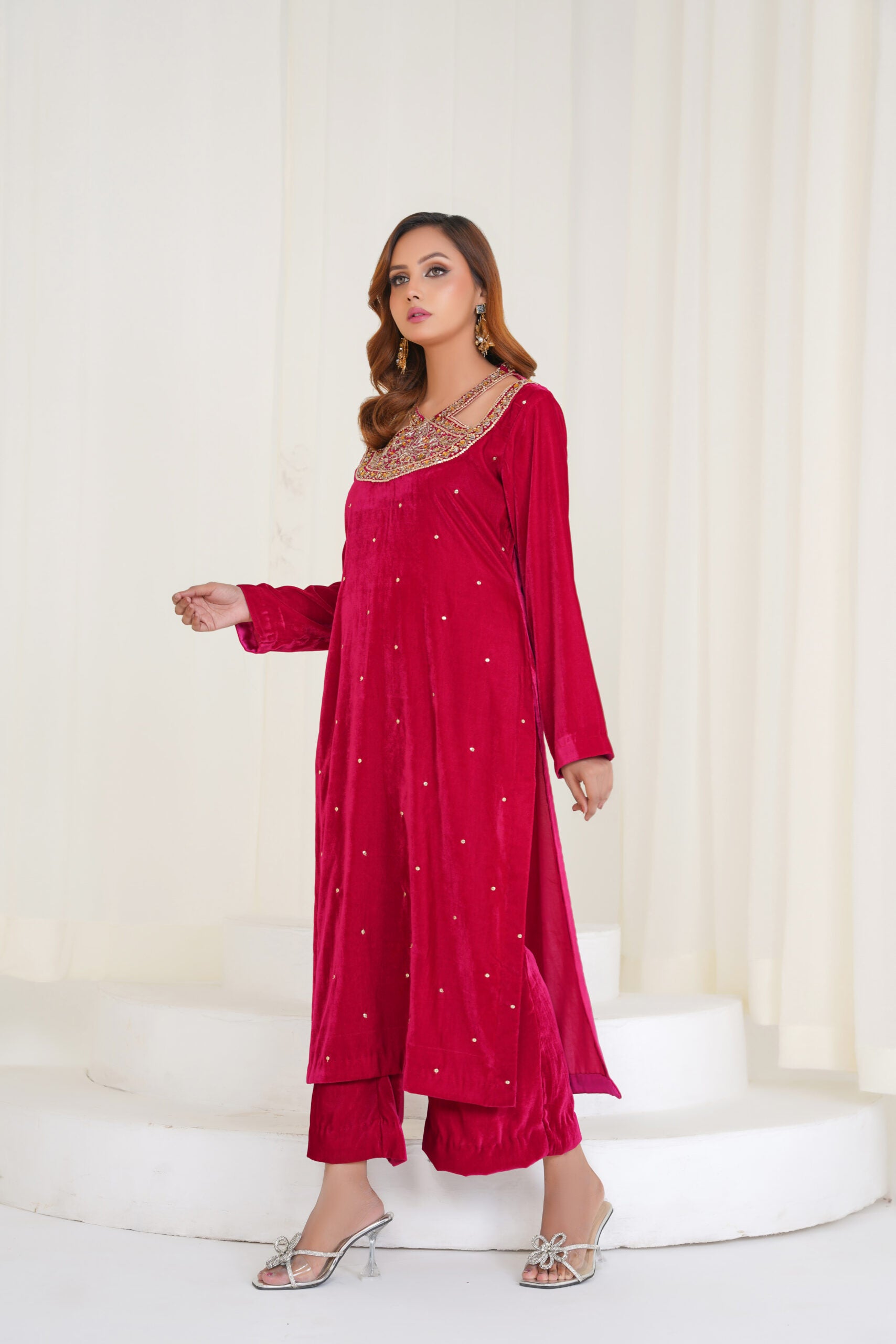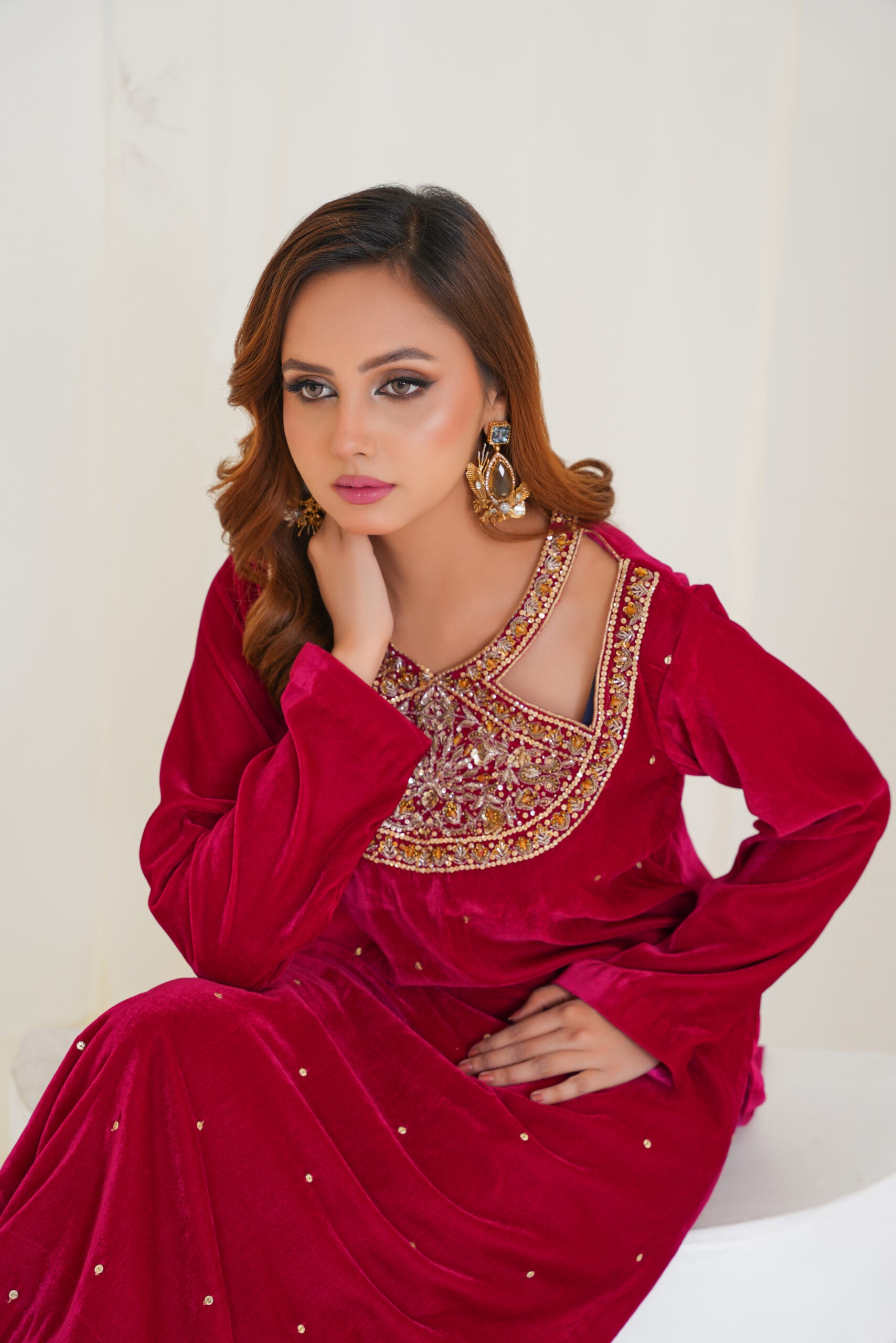 Additional Description: This stunning ensemble features a handworked neckline on rich magenta velvet, adorned with intricate dabka, beads, sequins, and kora, making it an essential addition to your collection. It is complemented by luxurious velvet trousers and a beautifully block-printed medium silk dupatta. Disclaimer: Actual product color may vary slightly from the image.