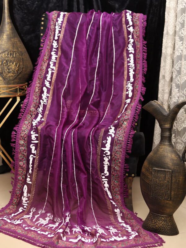 Pure organza fabric is used to make this dopata. Dyed in indigo color and make with block printed technique. Hand painted names of client can be customised upon request. Finished off with beautiful embellishments. The embroidered thread work is done by using expert craftsmanship.