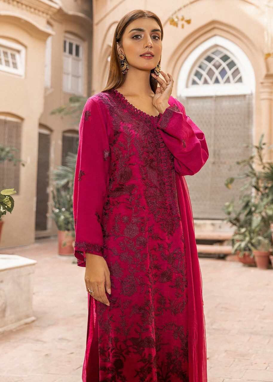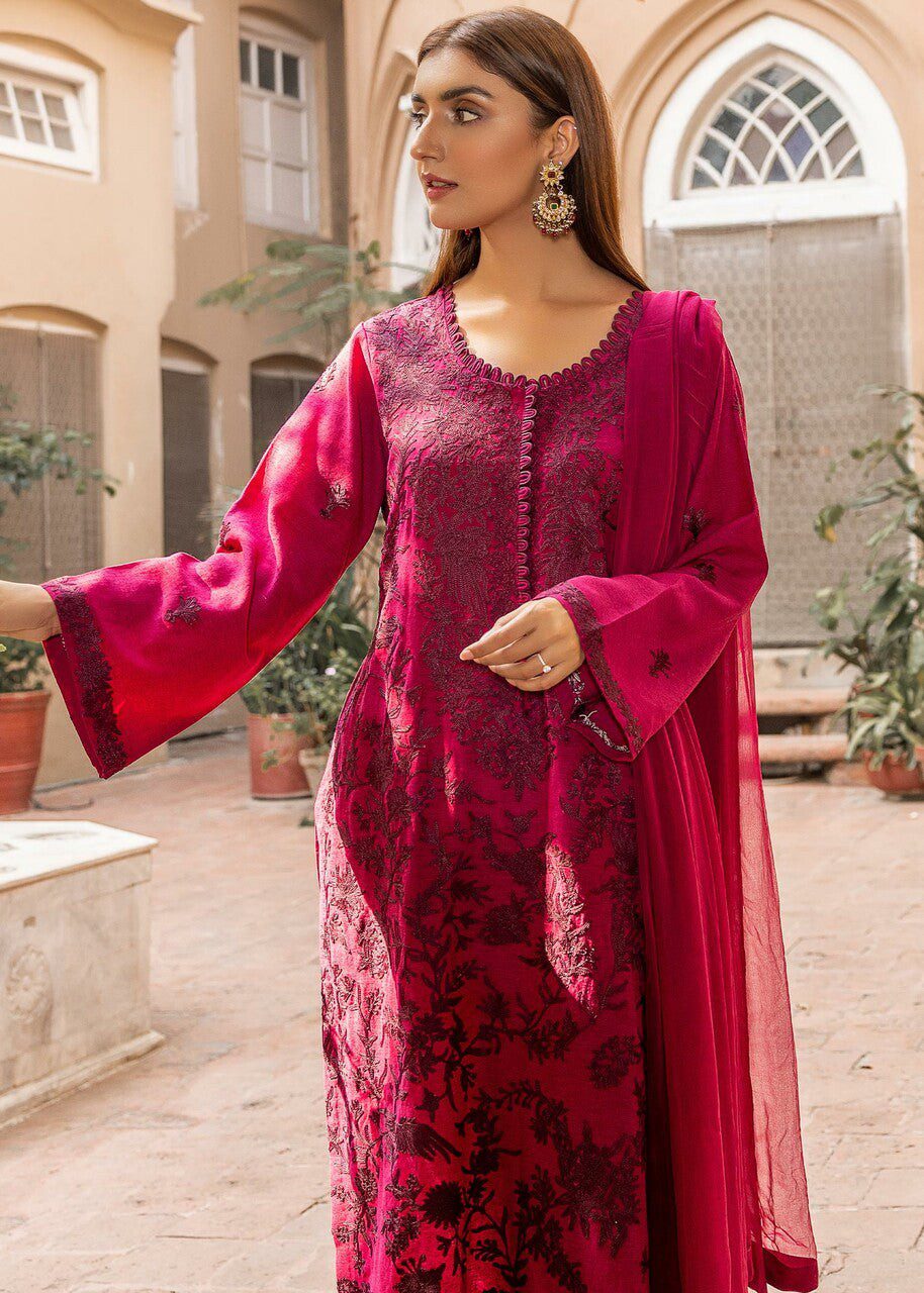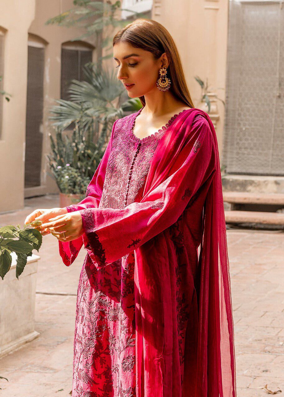 Description: This article is all about luxury and elegance. Pure karandi is used to make this outfit. Traditional Ari work in beautiful floral imagery in a deep magenta hue. This article comes with trousers and chiffon dupatta. Disclaimer: The color of the outfit may vary due to the lighting effect used in the photography