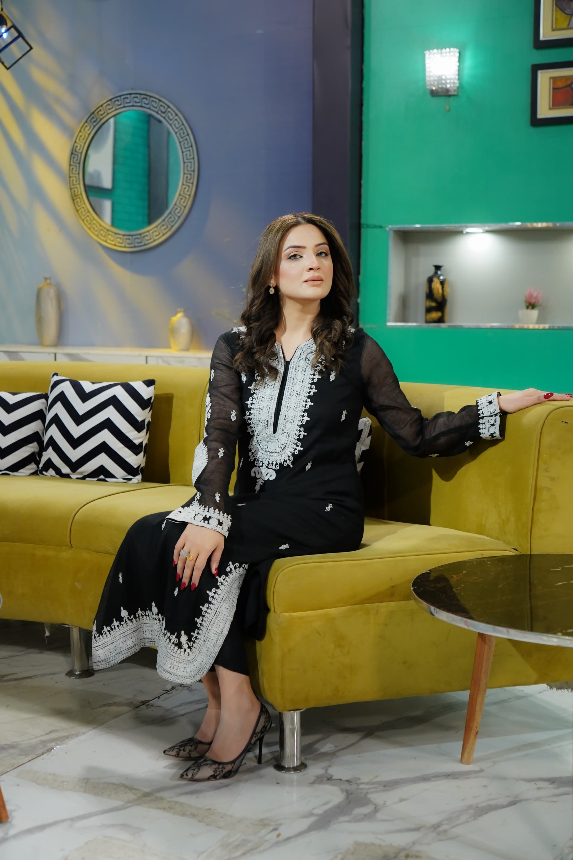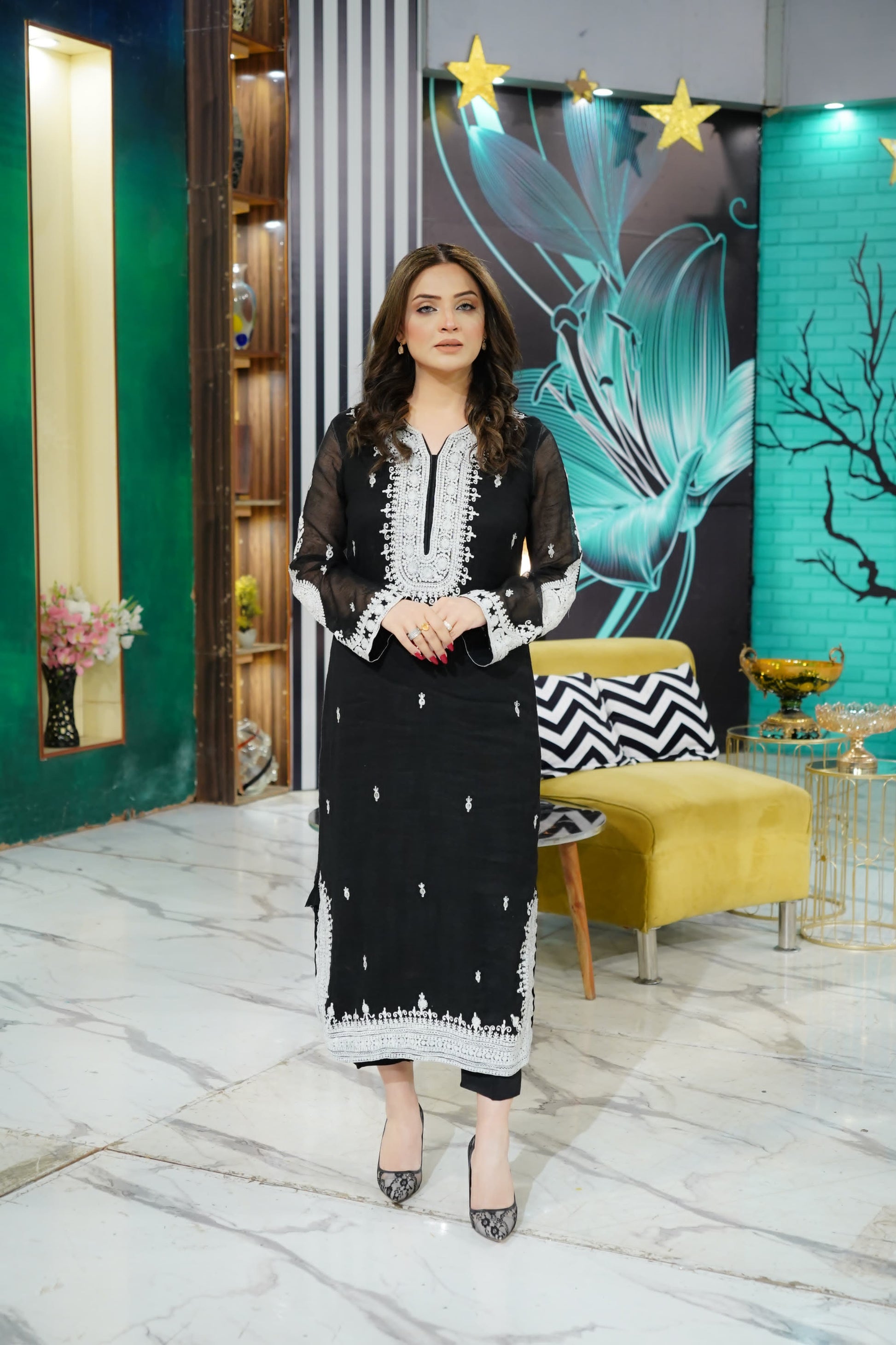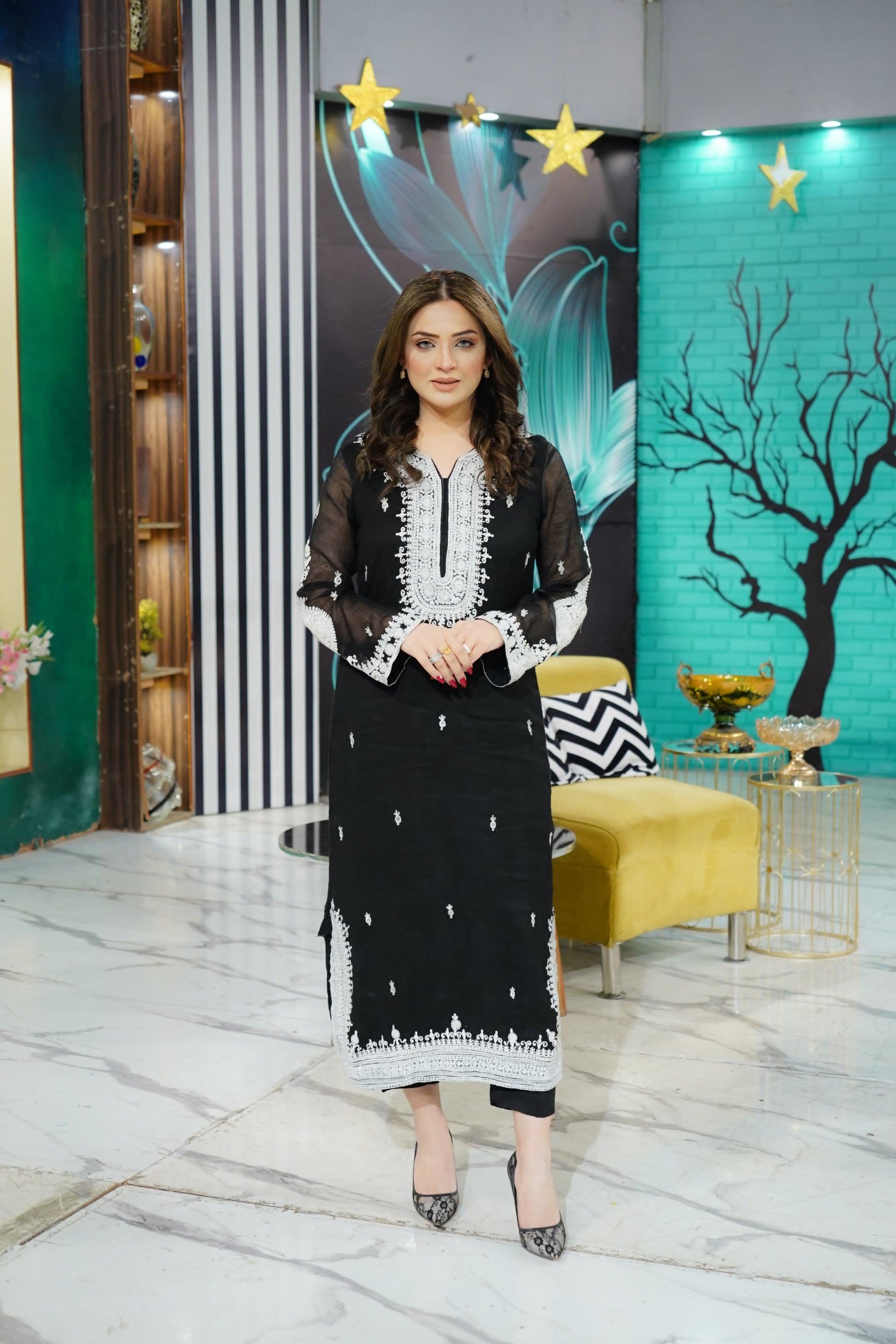 Crafted to exude both boldness and sophistication, this outfit makes a statement without being overpowering — ideal for festive gatherings, formal dinners, or special occasions. The look is completed with a beautifully dyed plain black dupatta in medium silk, adding depth and a pop of color that ties the entire outfit together effortlessly.
