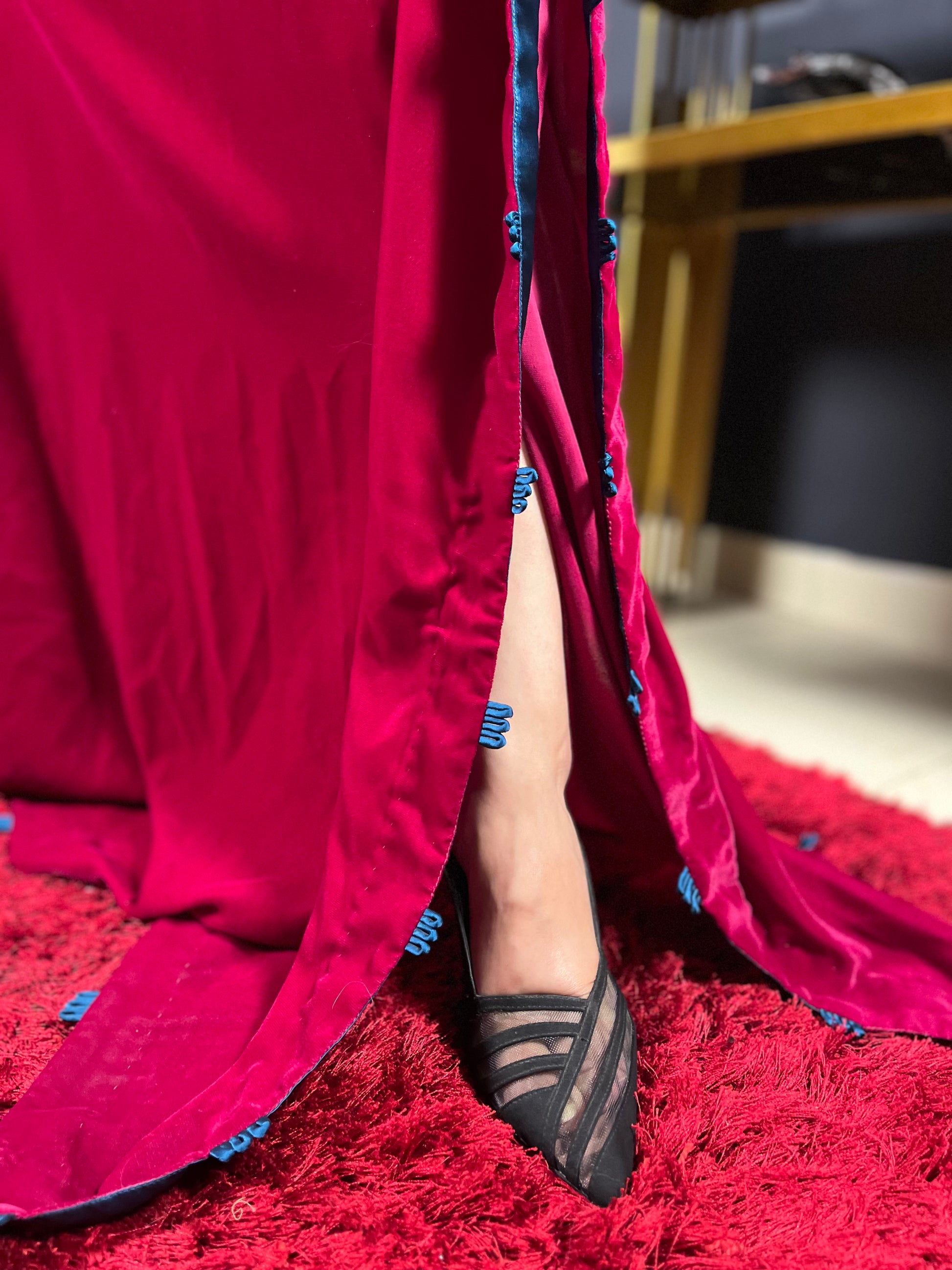 This exquisite kaftan features intricate dori work and beautiful applique detailing. The contrasting finishes throughout the kaftan, complemented by decorative loops, create a stunning visual appeal. This piece is designed to make a statement, blending elegance with unique craftsmanship for a truly captivating look.