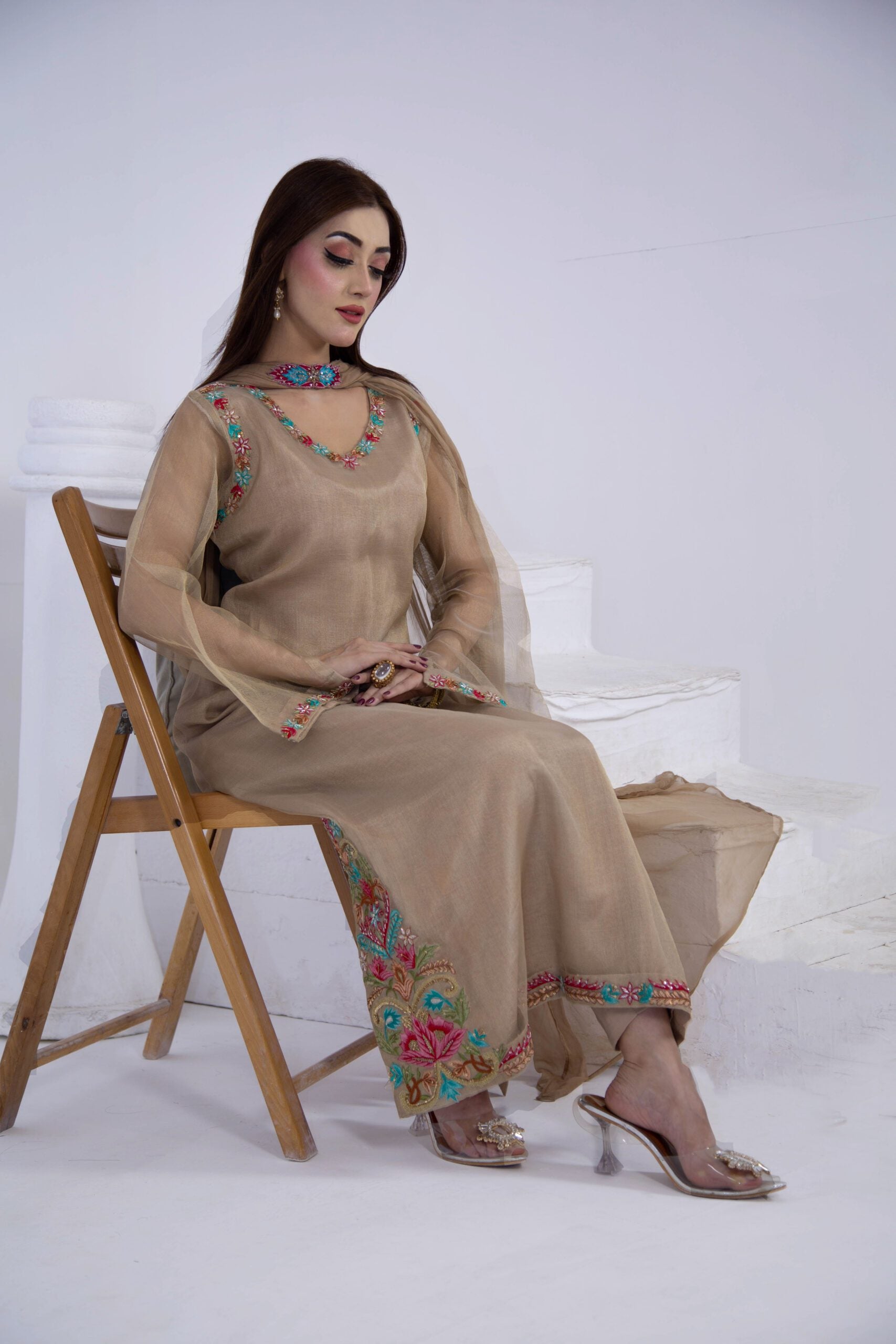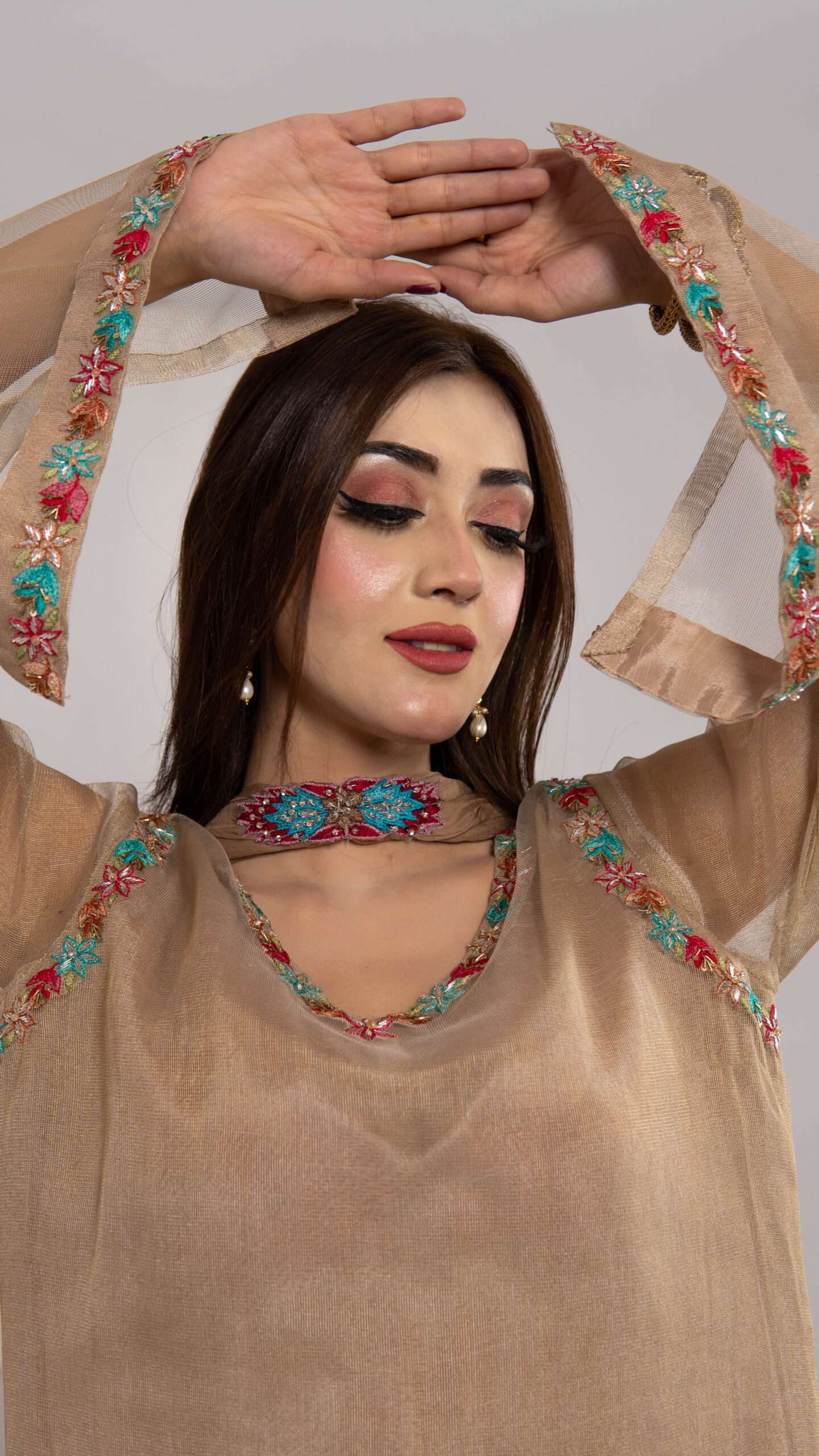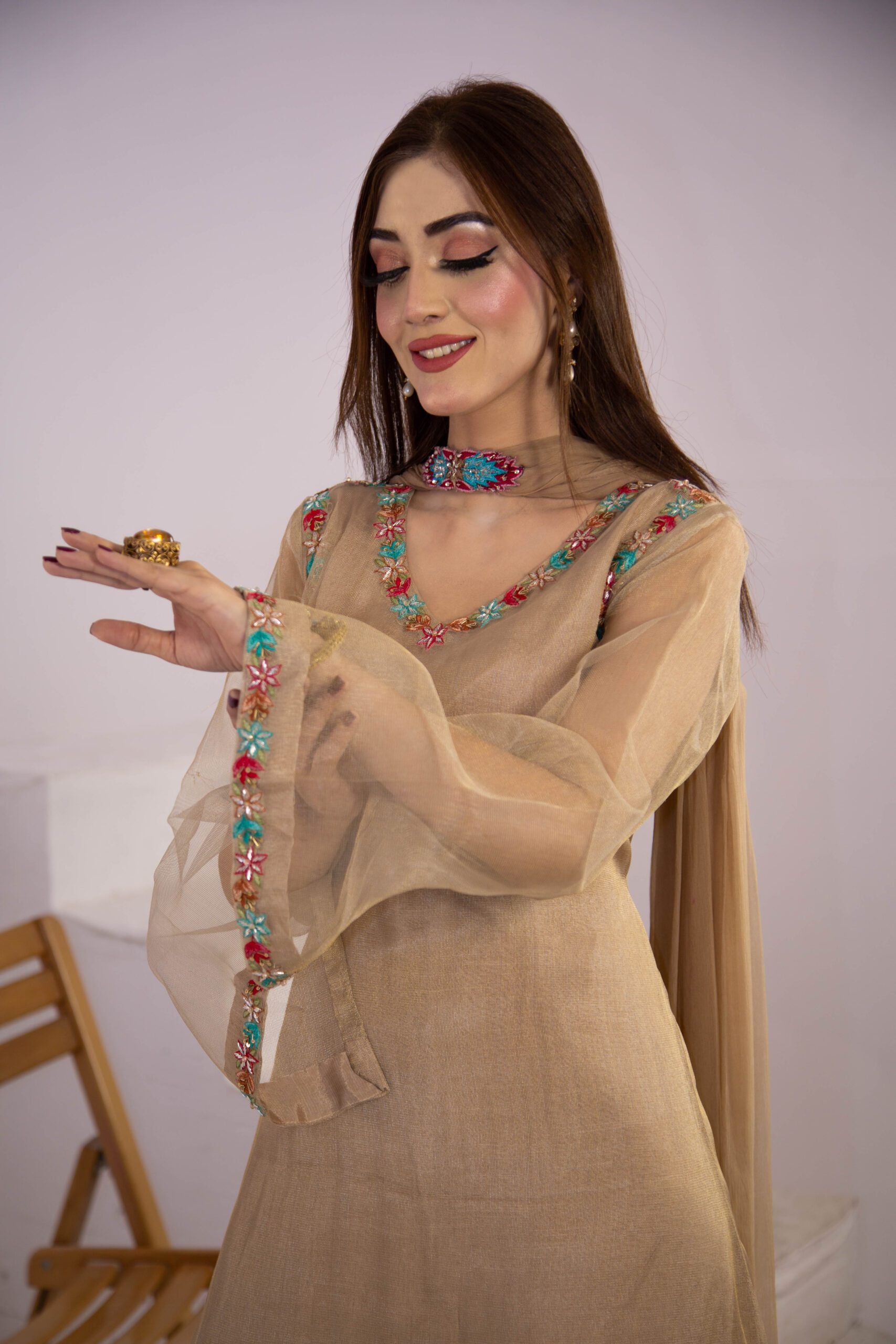A Dull gold base used for this outfit is used as a canvas to paint a beautiful floral pattern of your dreams. We have used shades of blue, red, beige and green in the embroidery patterns along with handwork on the neckline, hems of shirts and sleeeves. This is a long shirt with low slits. Comes with trouser and dupatta. Dupatta has a stunning detail of motif. Standard length of shirt is 49 inches.