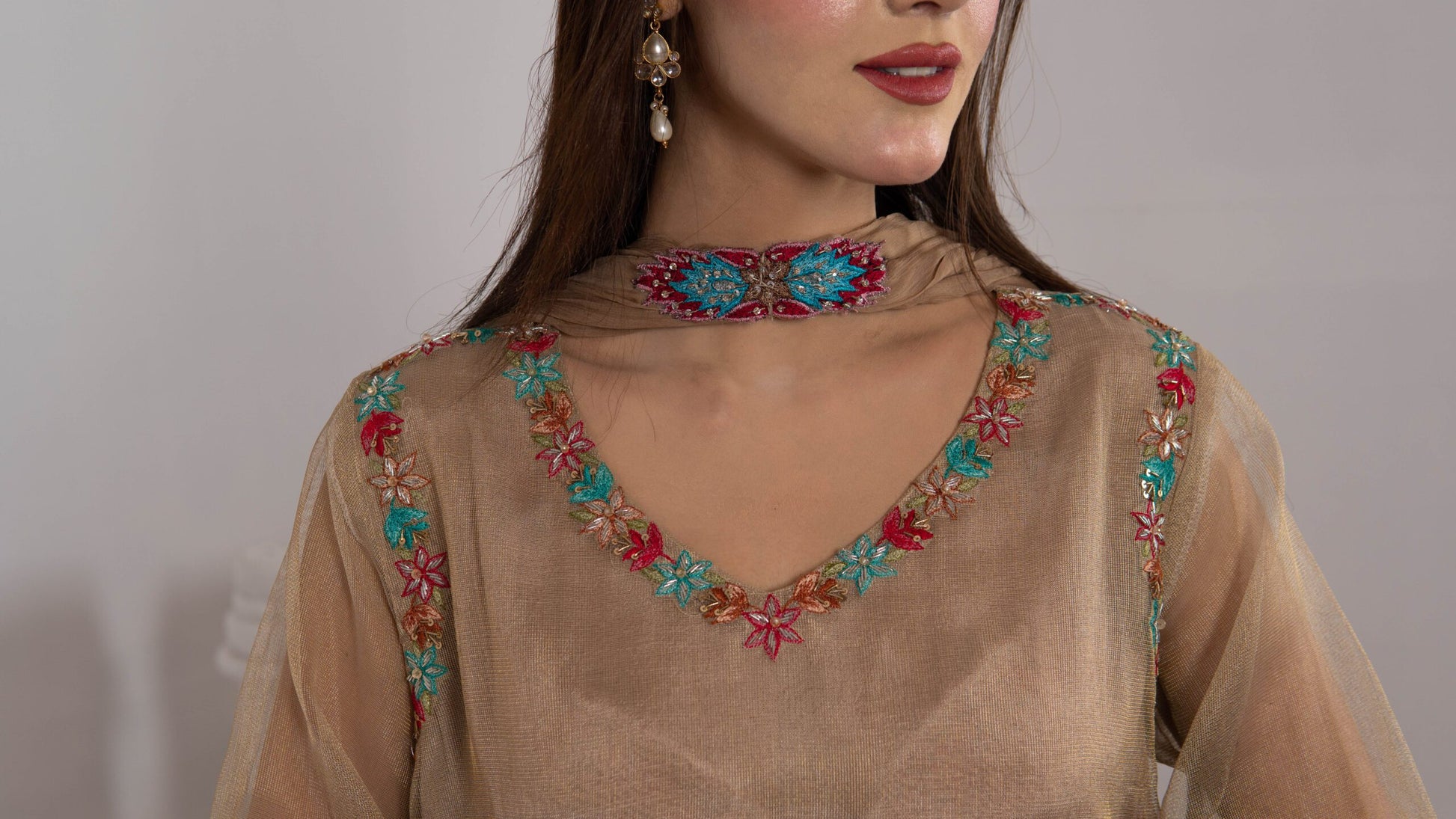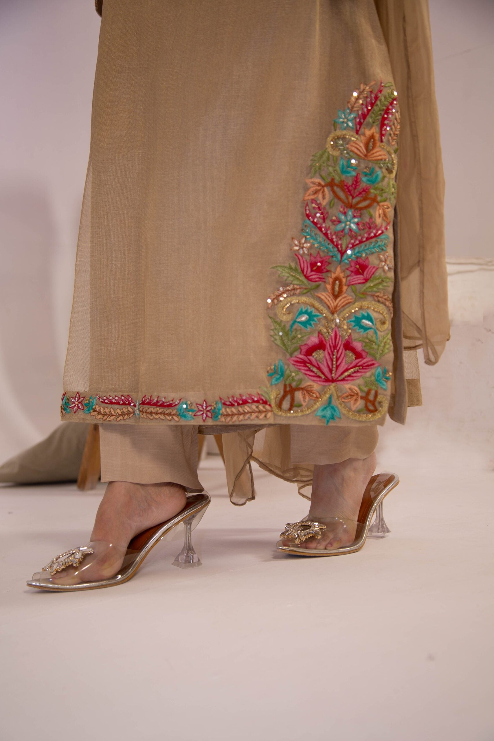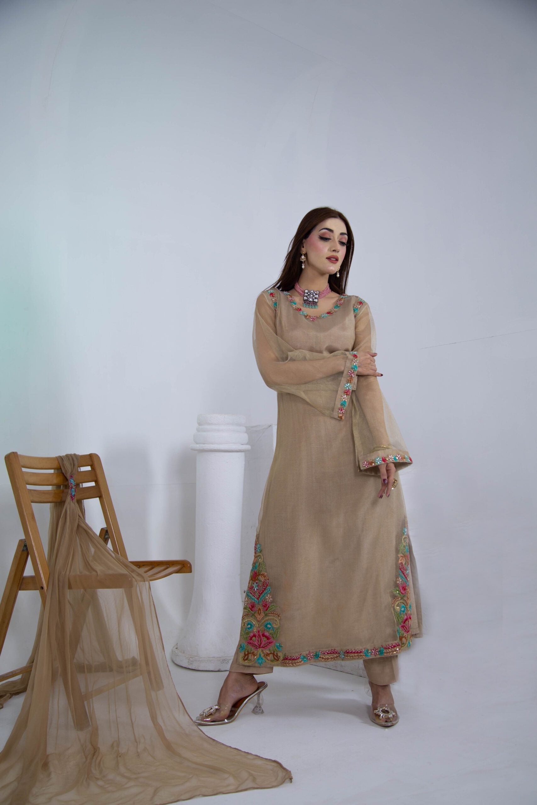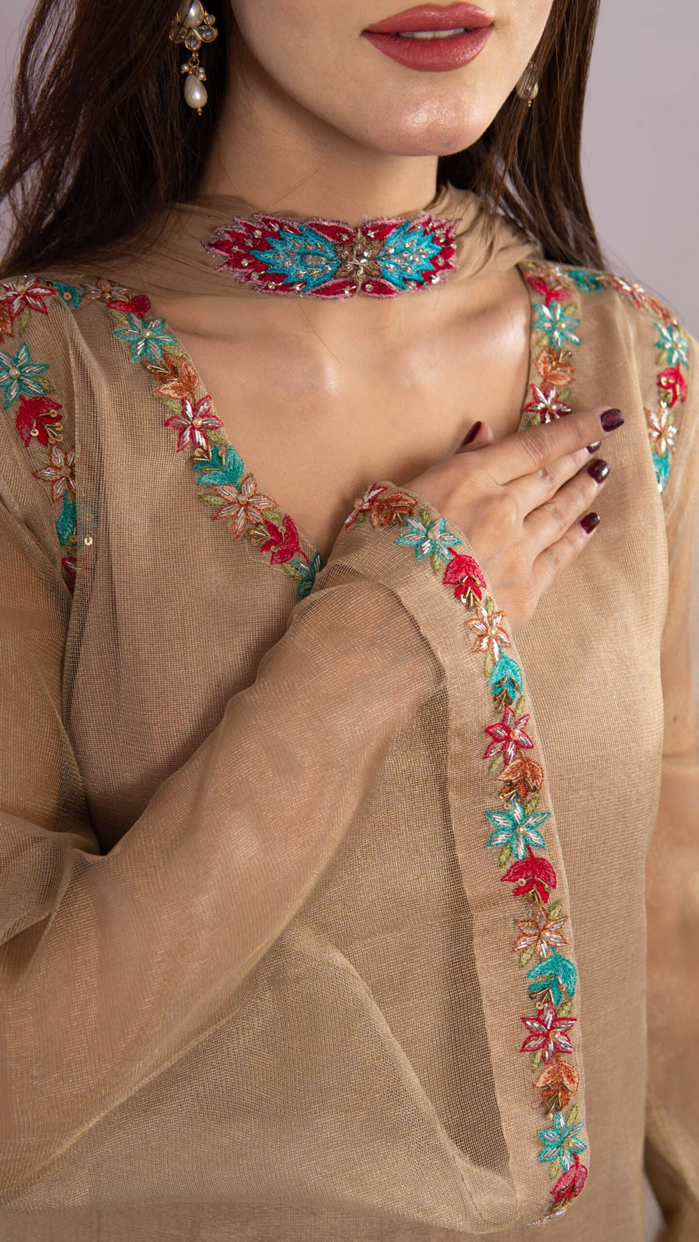 A Dull gold base used for this outfit is used as a canvas to paint a beautiful floral pattern of your dreams. We have used shades of blue, red, beige and green in the embroidery patterns along with handwork on the neckline, hems of shirts and sleeeves. This is a long shirt with low slits. Comes with trouser and dupatta. Dupatta has a stunning detail of motif. Standard length of shirt is 49 inches.