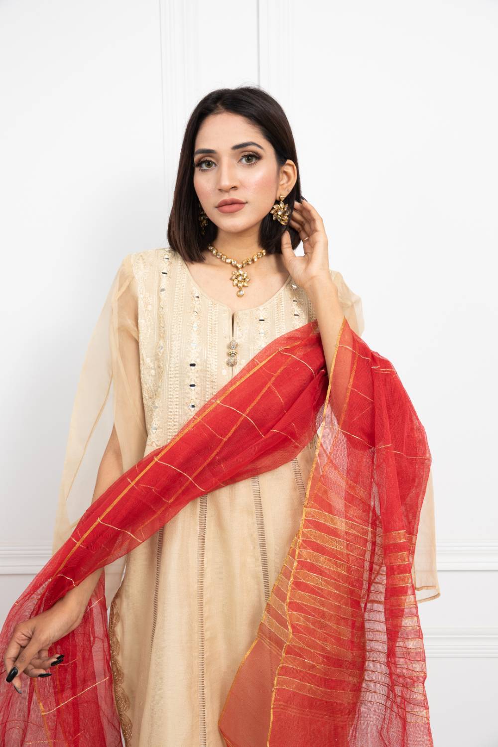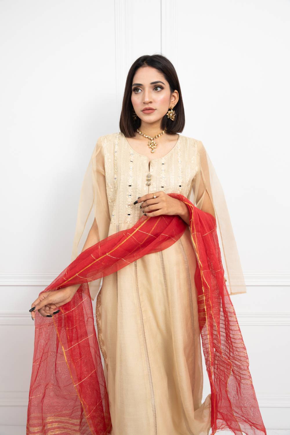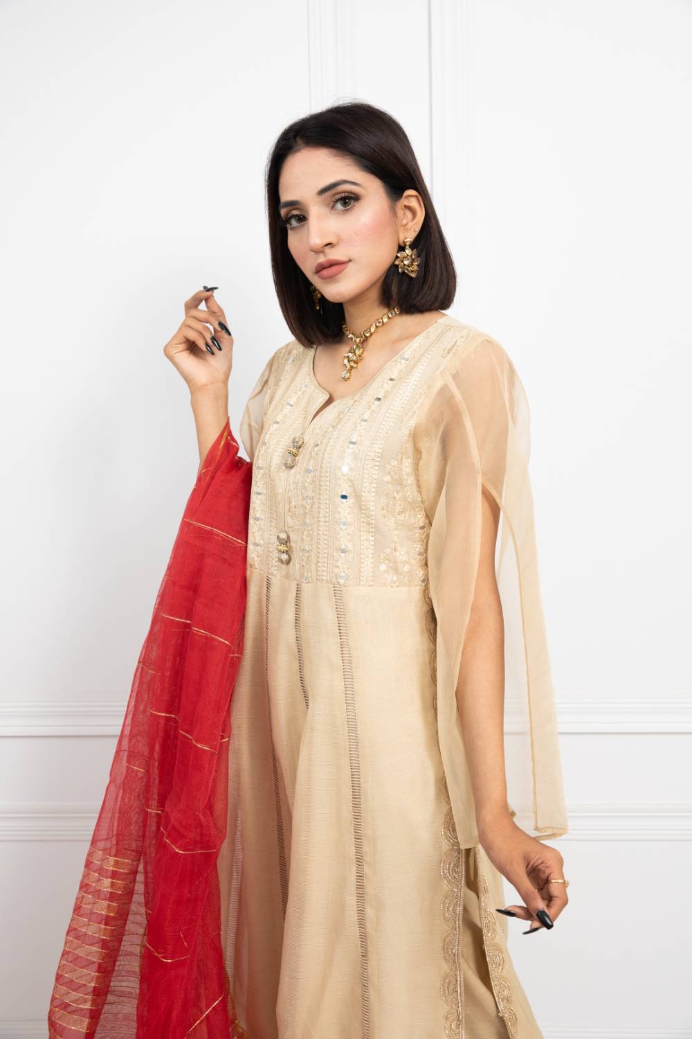A delicate 'Beige colored' long shirt with panels that gives a gorgeously feminine look, embellished with antique gotta work on all hemming sides. The body is intricately designed with mirror work and thread embroidery. Styled with hand-painted buttons. Paired with a red net zari dupatta and cigarette pants.