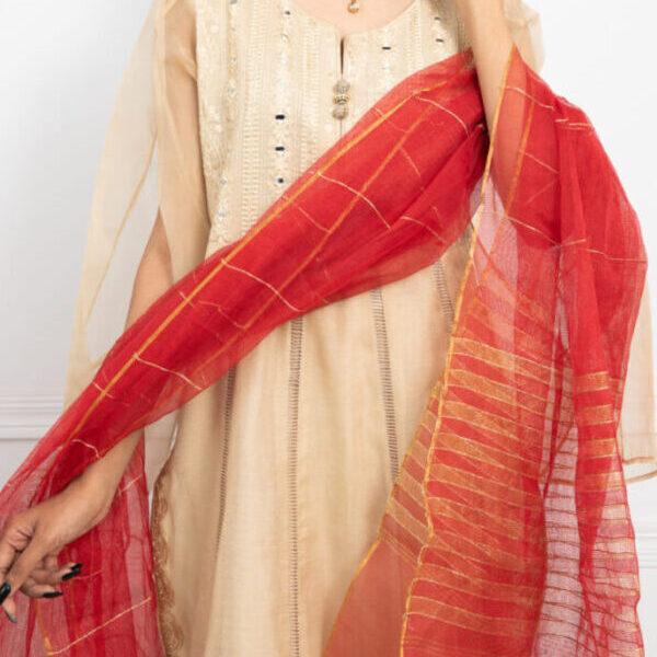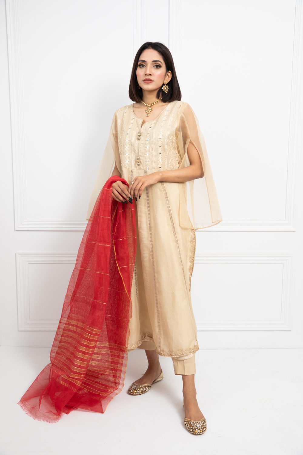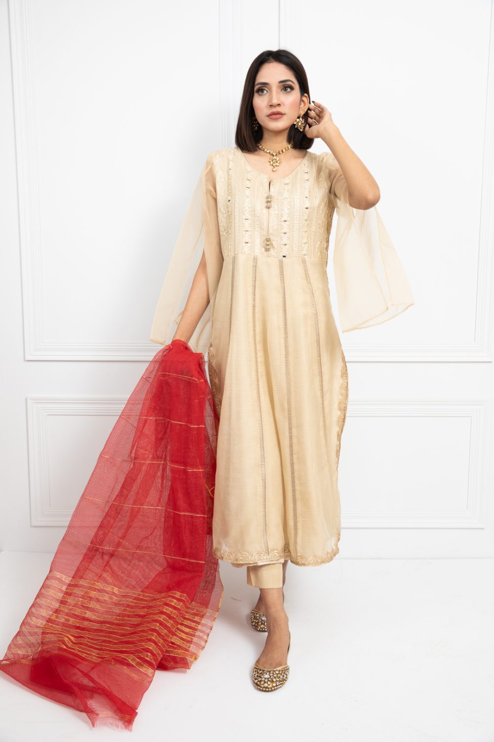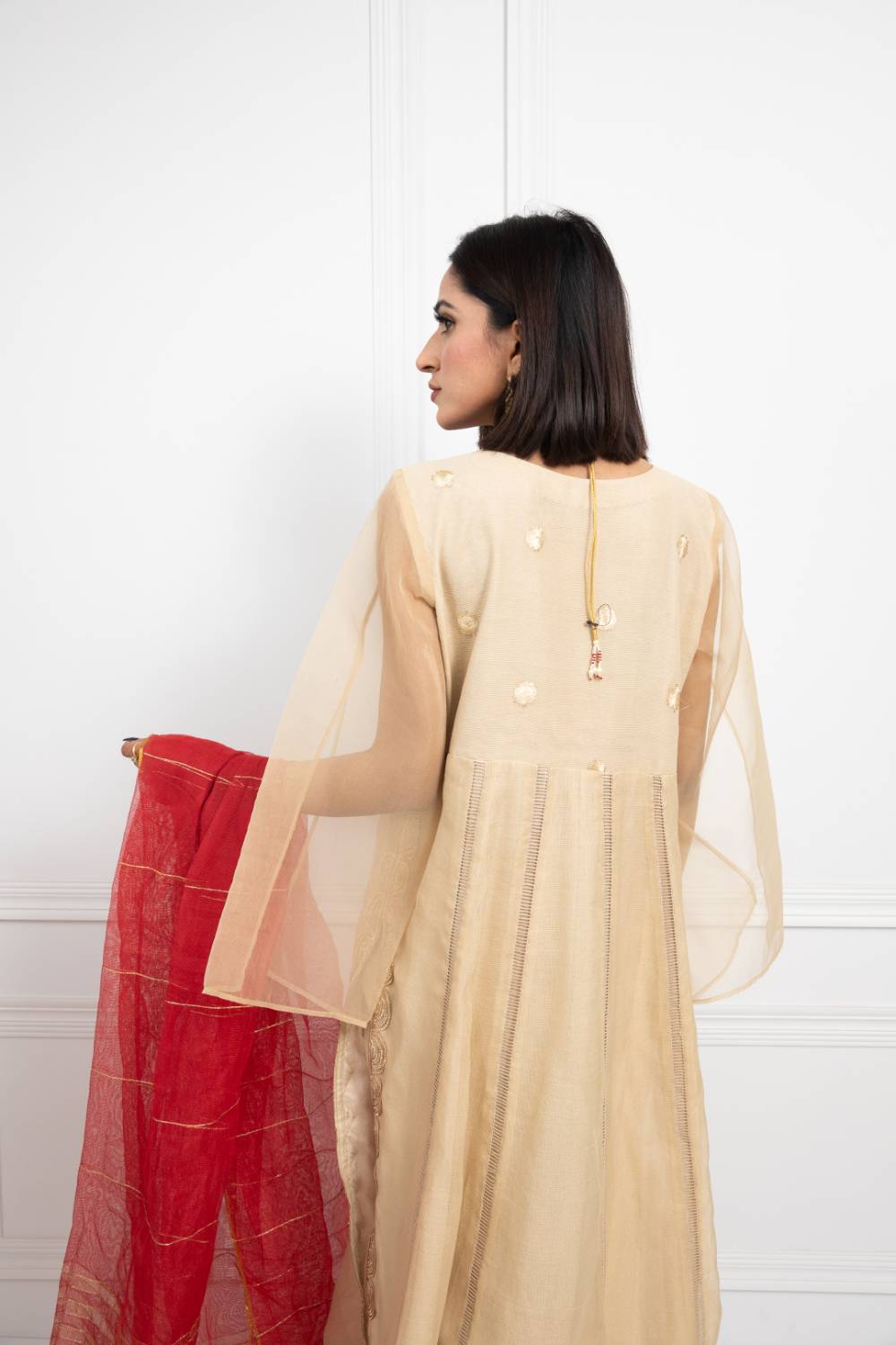 A delicate 'Beige colored' long shirt with panels that gives a gorgeously feminine look, embellished with antique gotta work on all hemming sides. The body is intricately designed with mirror work and thread embroidery. Styled with hand-painted buttons. Paired with a red net zari dupatta and cigarette pants.
