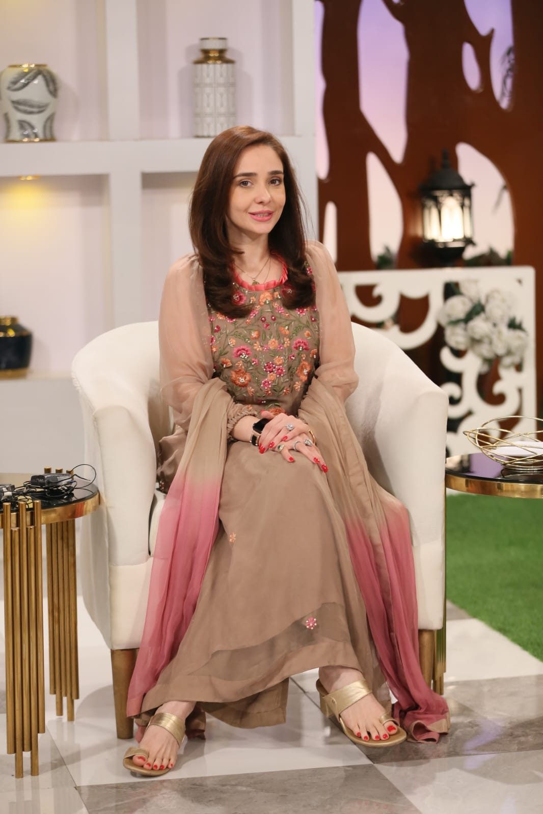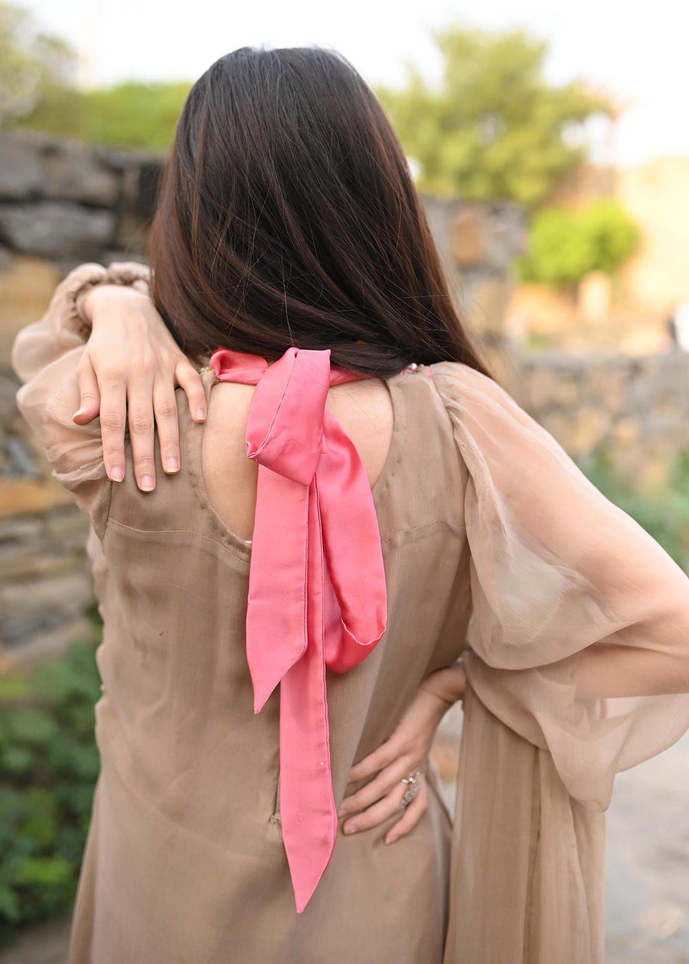 - Description: Long shirt made with assorted floral embroidery in pink, peach and slightly orange tones with pearl finish. A fine ruffle detail on the neckline with a back tie in pretty pink gives this article a jazzy look. A boot cut relaxed trouser with slit and dupatta with an added ring makes this outfit even more special. \n