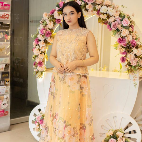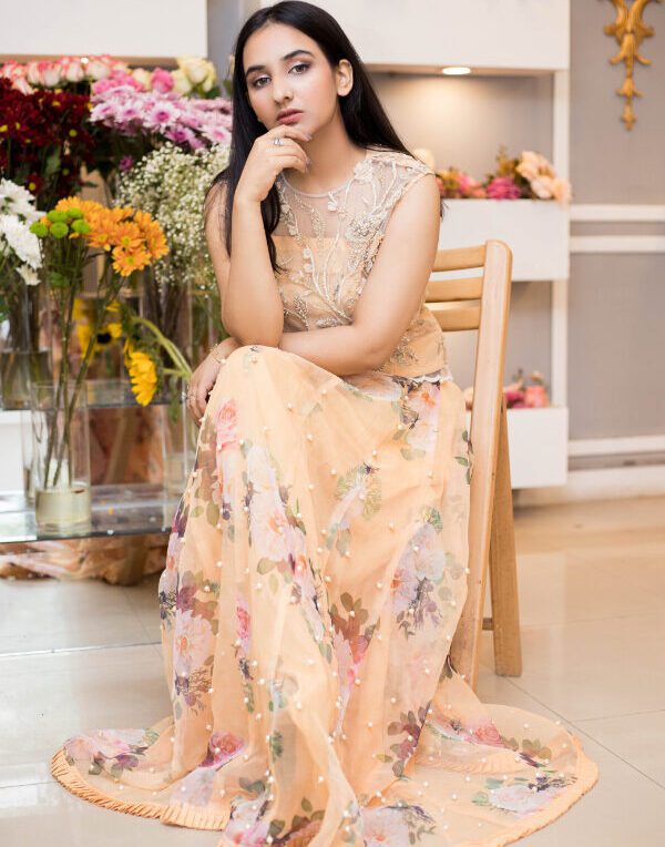 An organza skirt with beautiful frill and pearls. The net blouse is heavily embellished with attached slip
