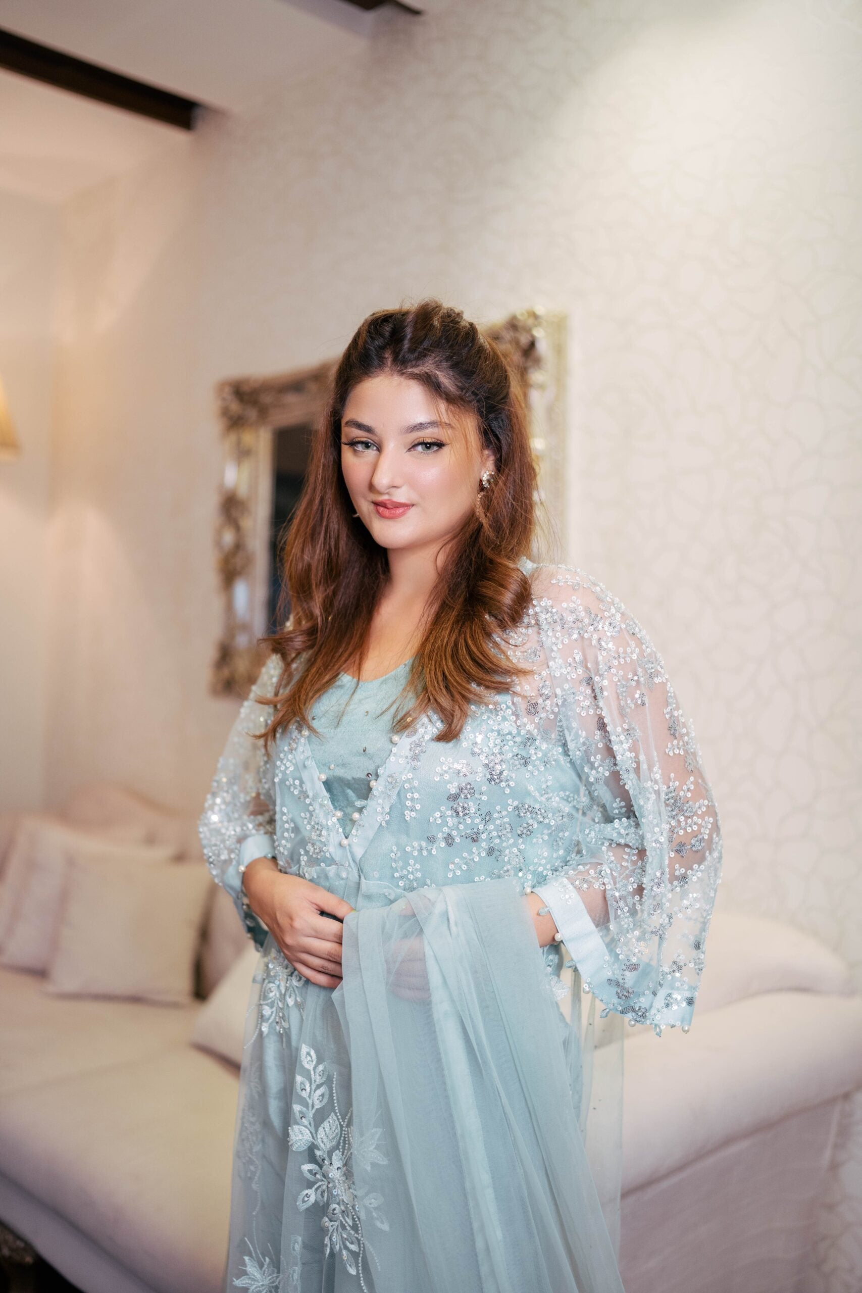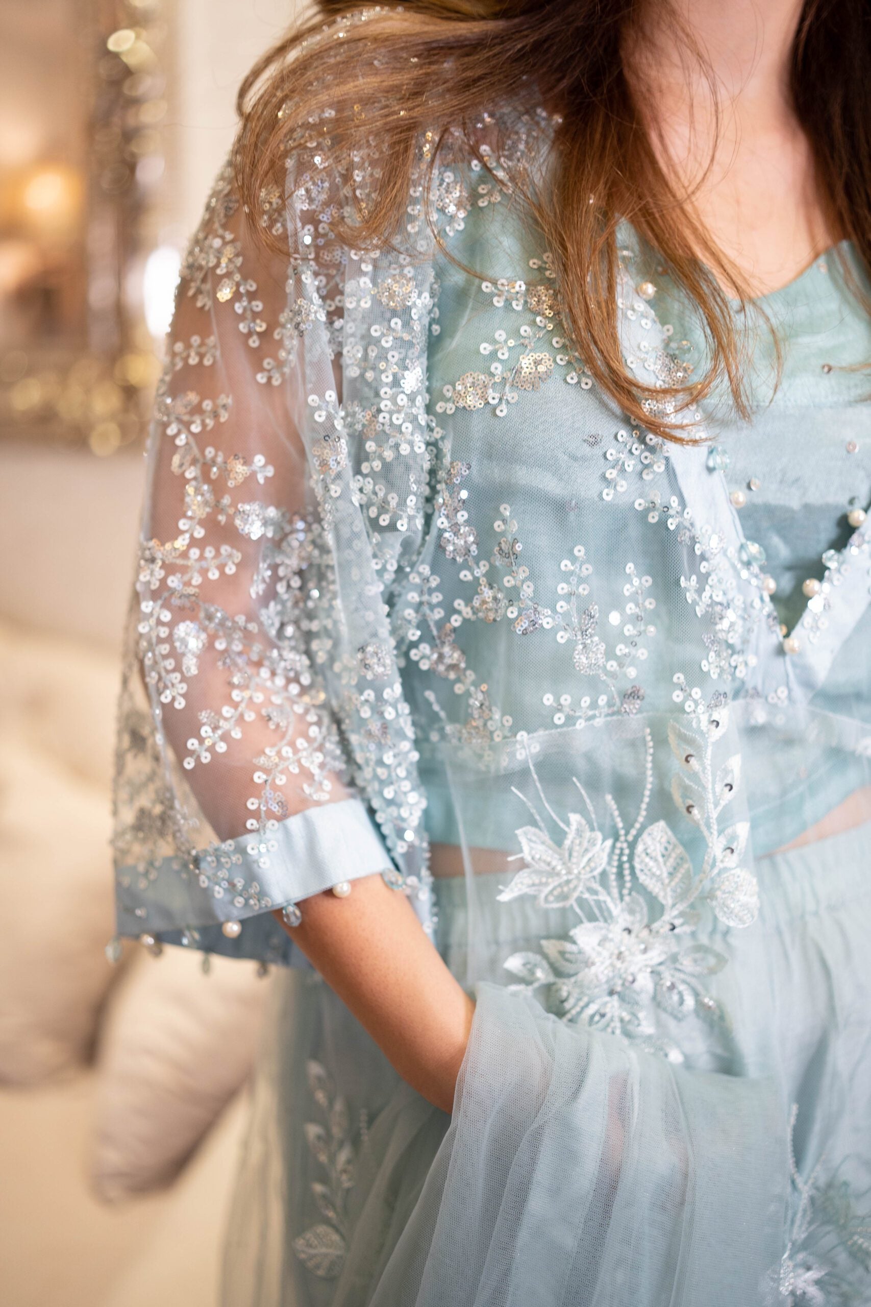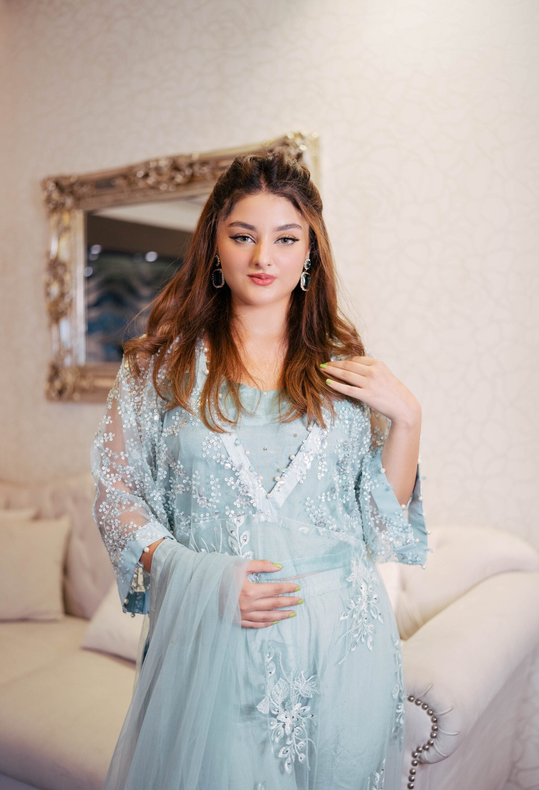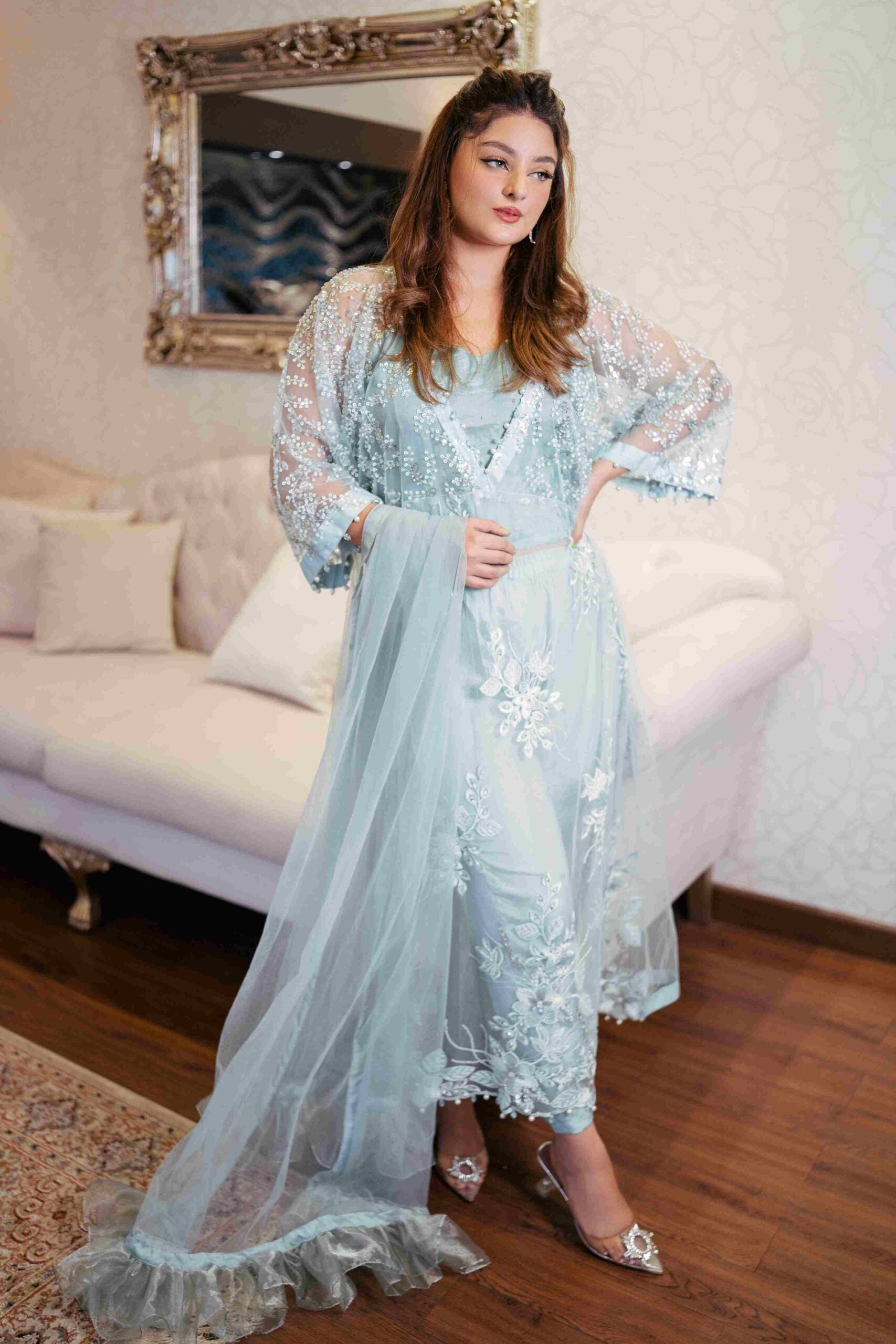 This beautiful 3- price ensemble is made on heavily worked net fabric with floral details. Kaftan style sleeves along with a long shirt and shiny crystals make you stand out.