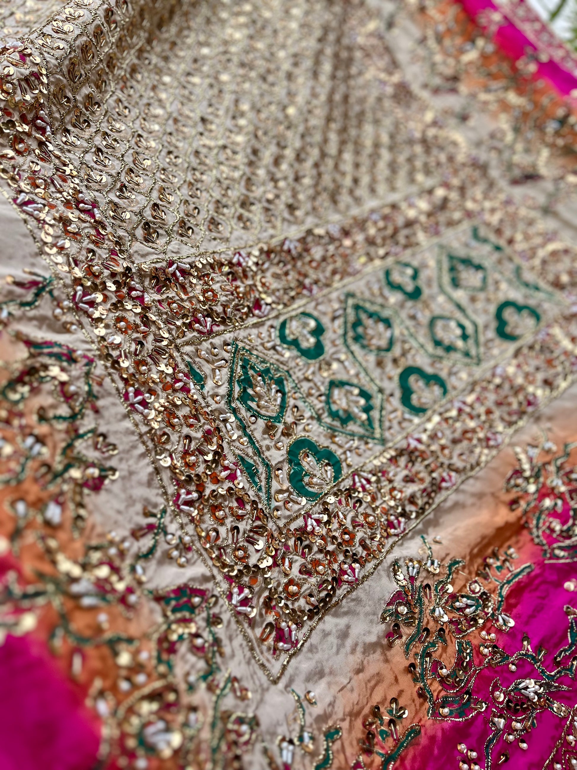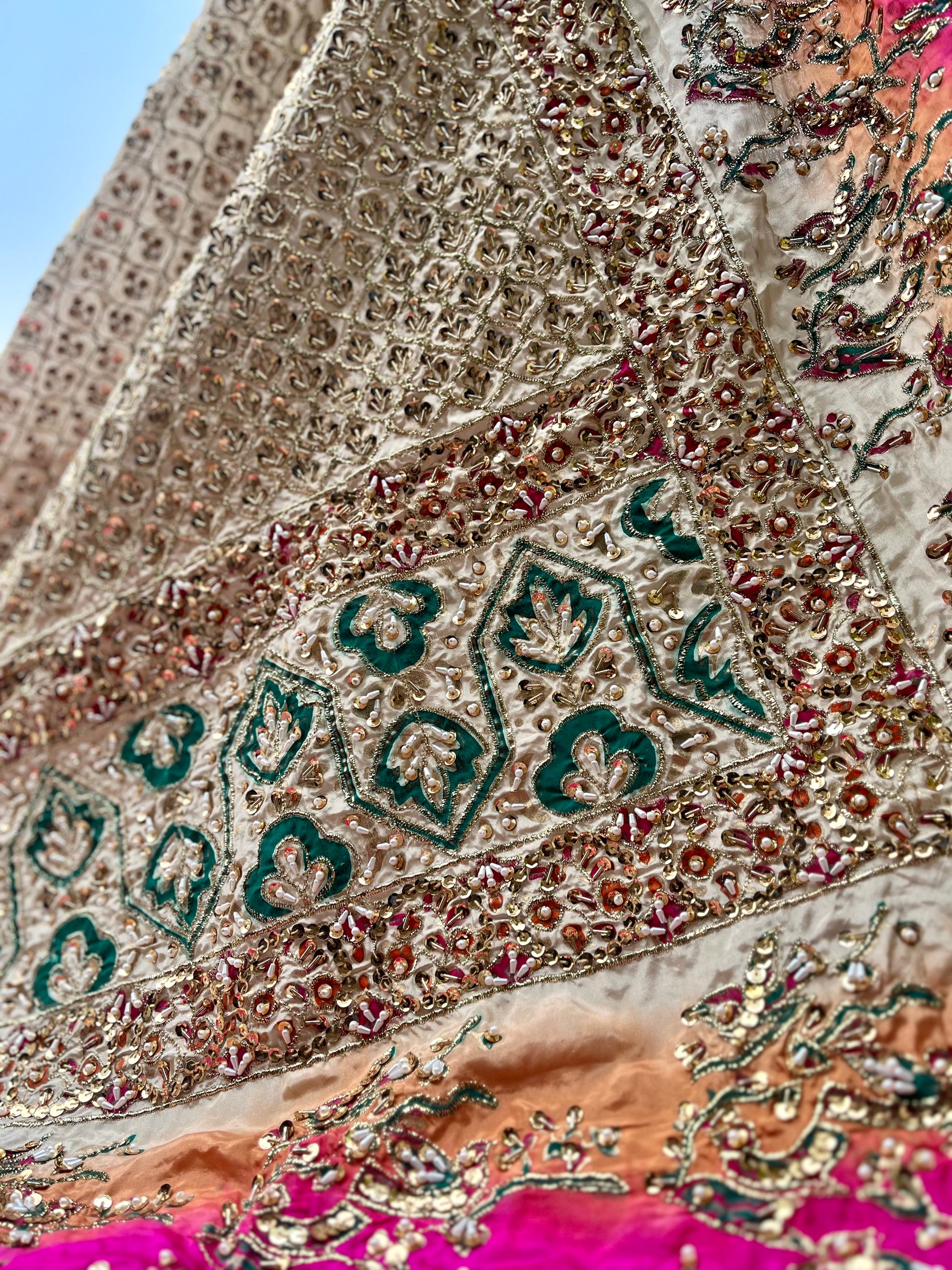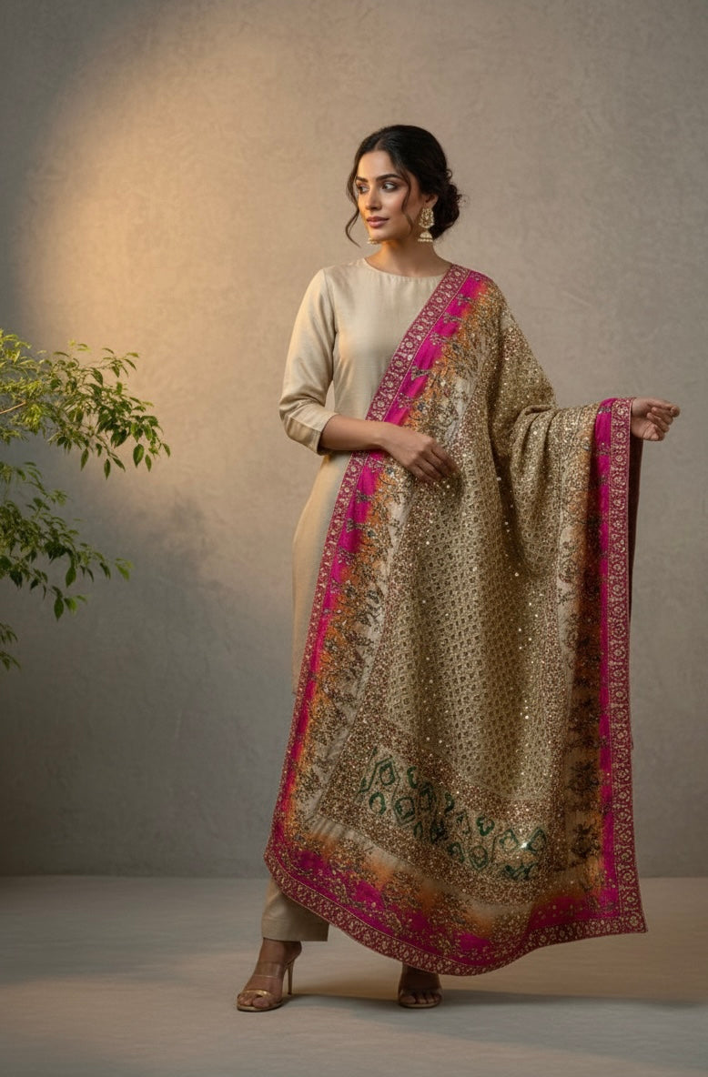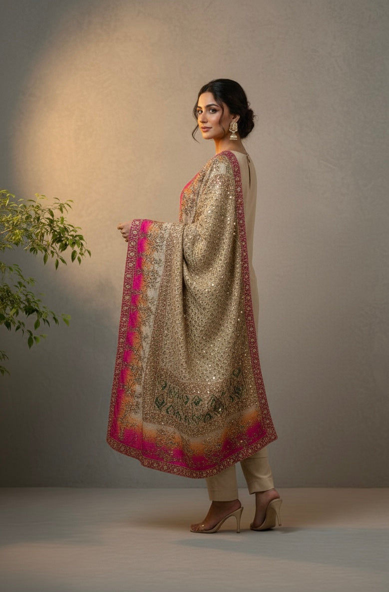Description: This kaamdani dupatta is a combination of gold and pink color . Pair it with plain rawsilk ensemble or add it to your existing outfit, it will make you look royal. Handworked with love and made using traditional techniques, this dupatta is a show stopper. Let the festivities begin!