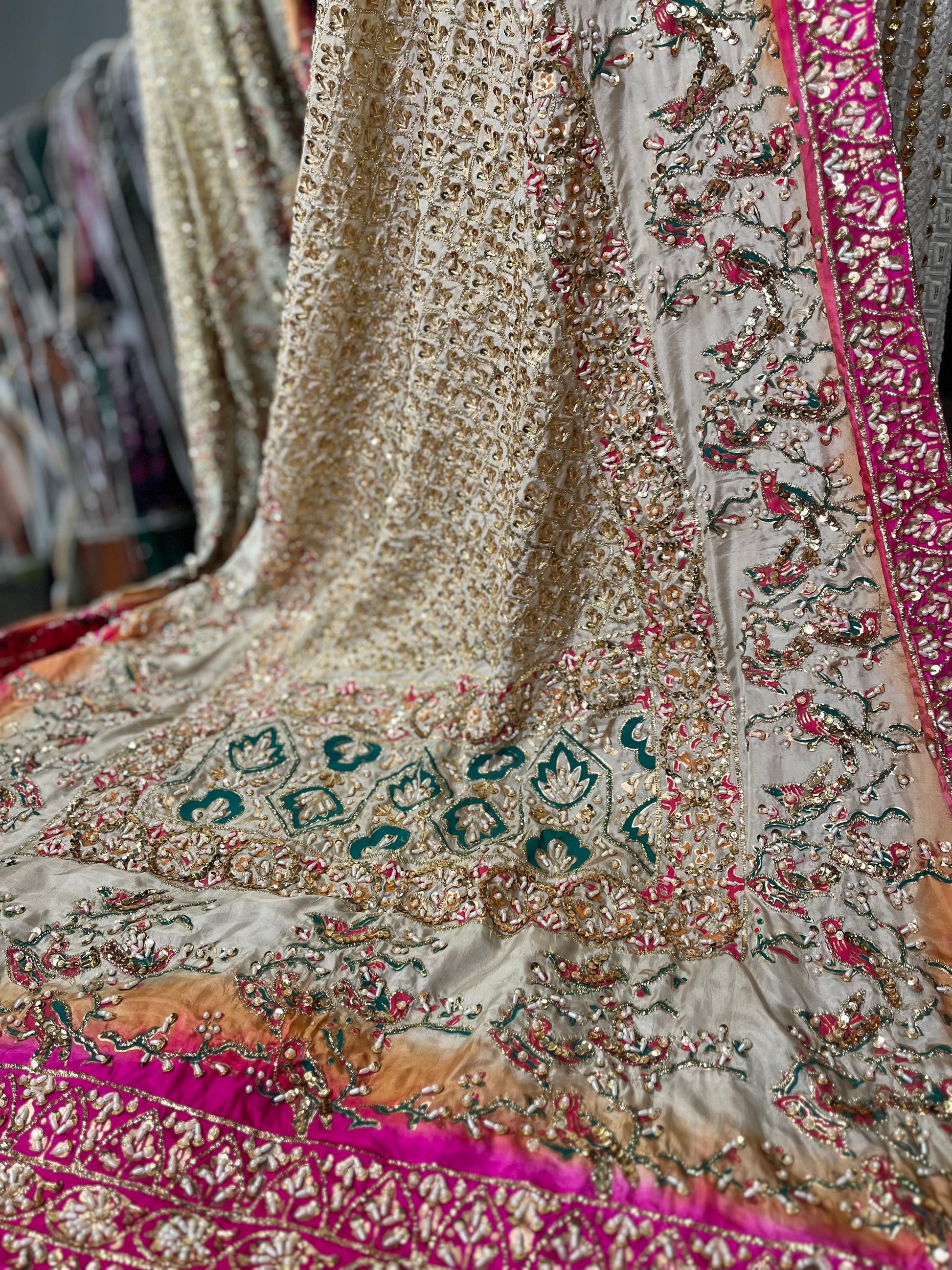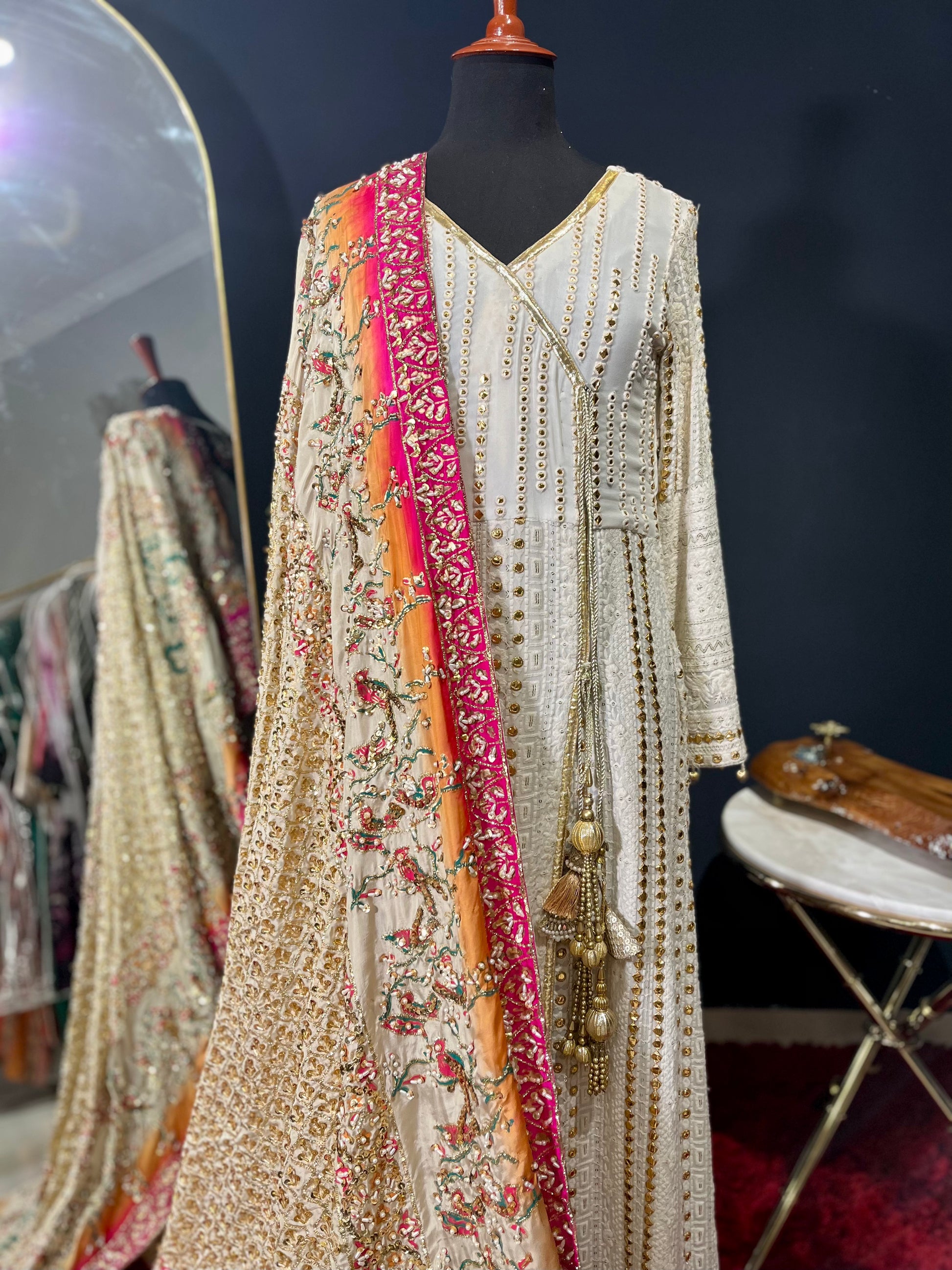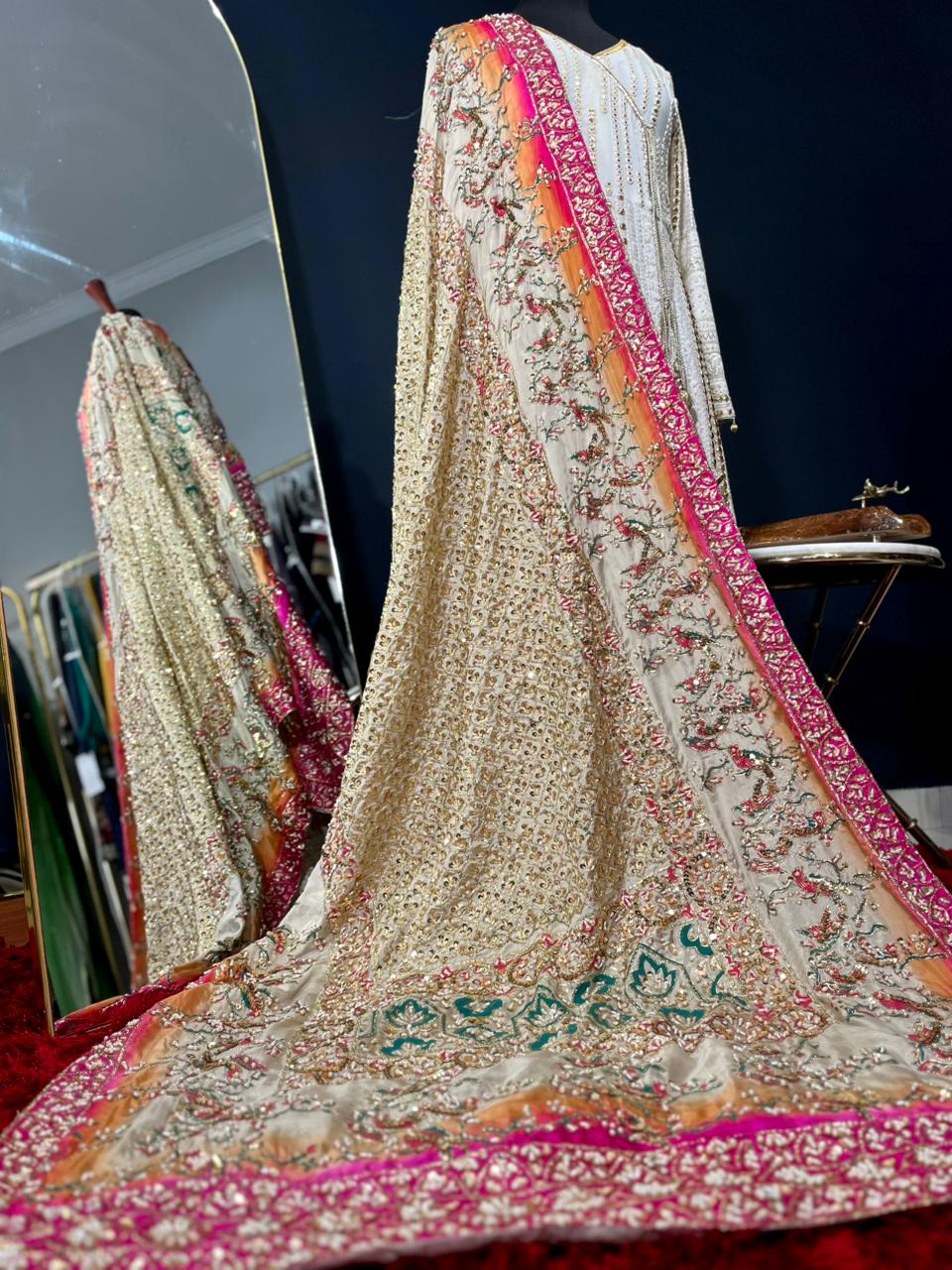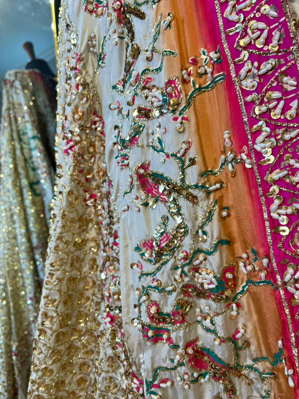 Description: This kaamdani dupatta is a combination of gold and pink color . Pair it with plain rawsilk ensemble or add it to your existing outfit, it will make you look royal. Handworked with love and made using traditional techniques, this dupatta is a show stopper. Let the festivities begin!