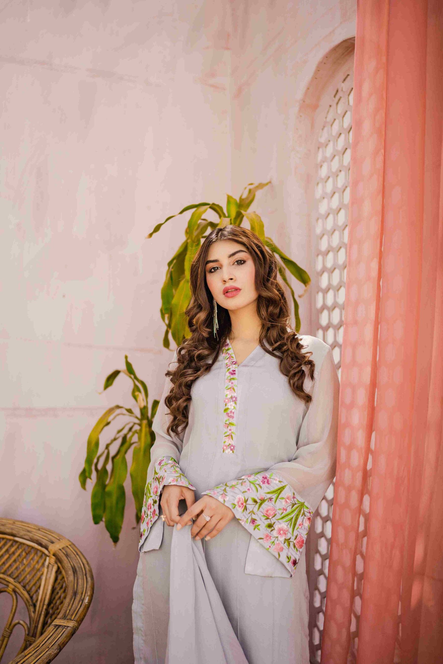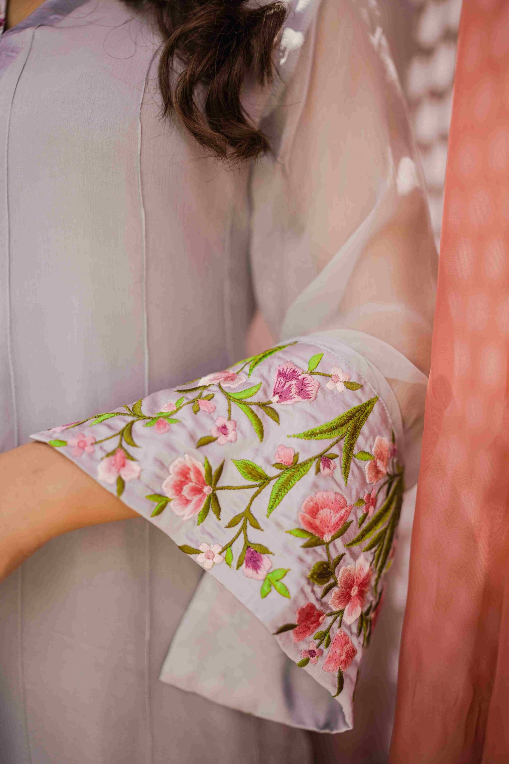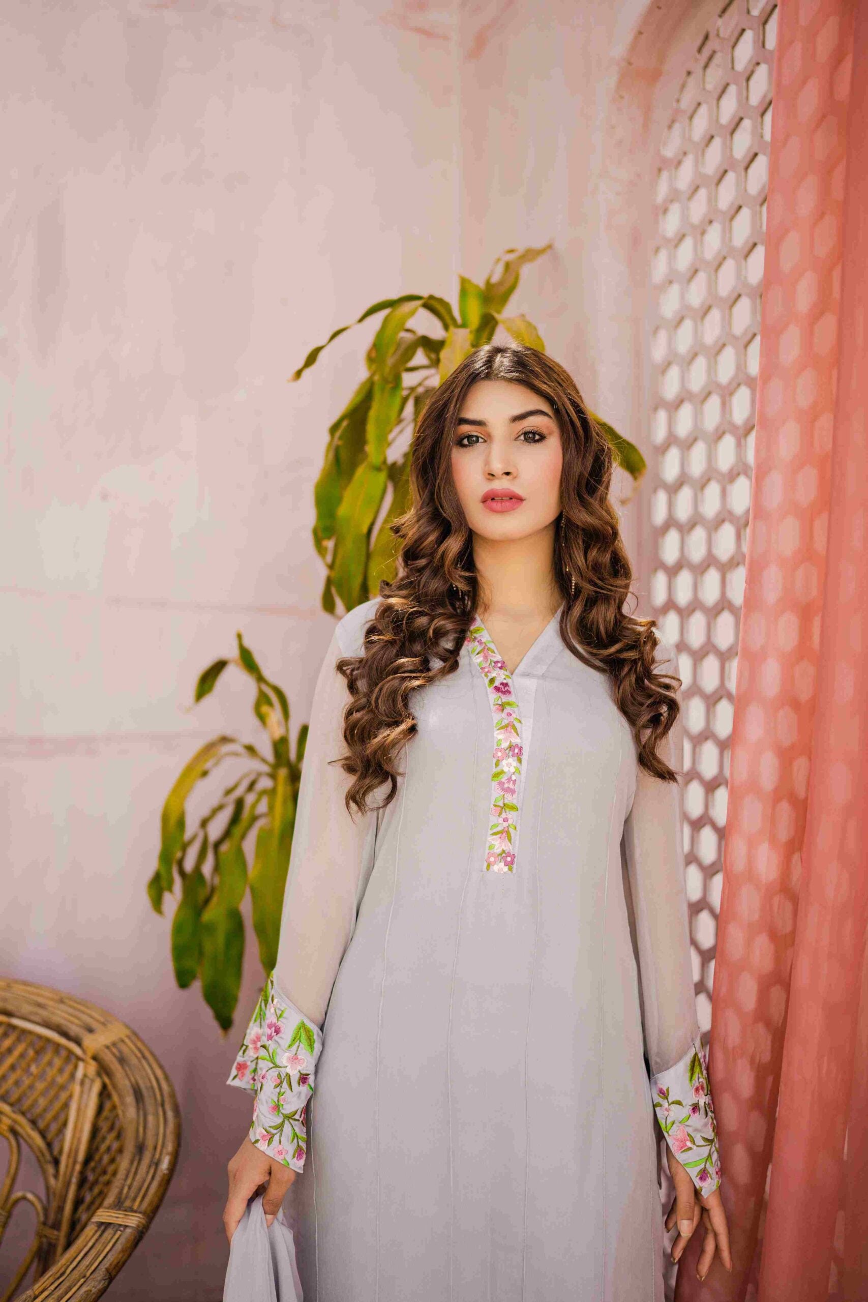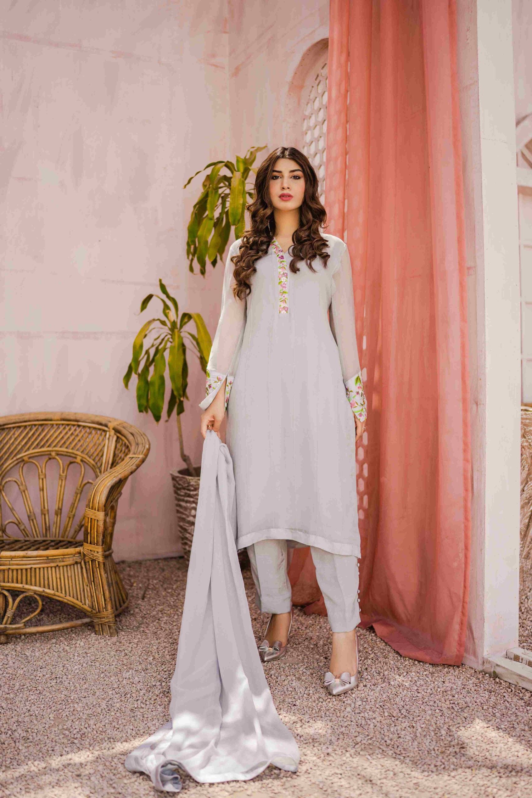 Pleated chiffon shirt with spring inspired resham embroidery. Graceful and elegant sleeves having bell shape and slit add to the details of this dress. Grey medium length shirt paired with trouser and chiffon dupatta with shamose silk edging. Trouser has buttons on the side hem. Slip is attached with the dress, can be provided seperate on demand. | \n