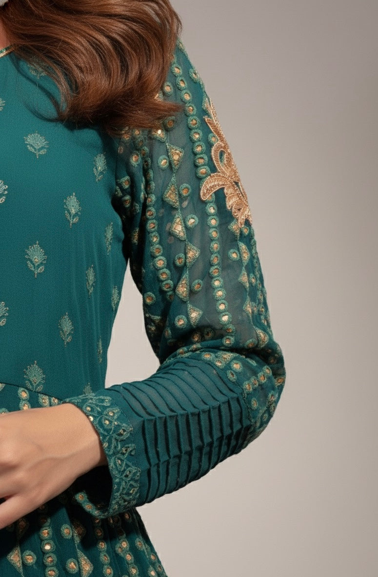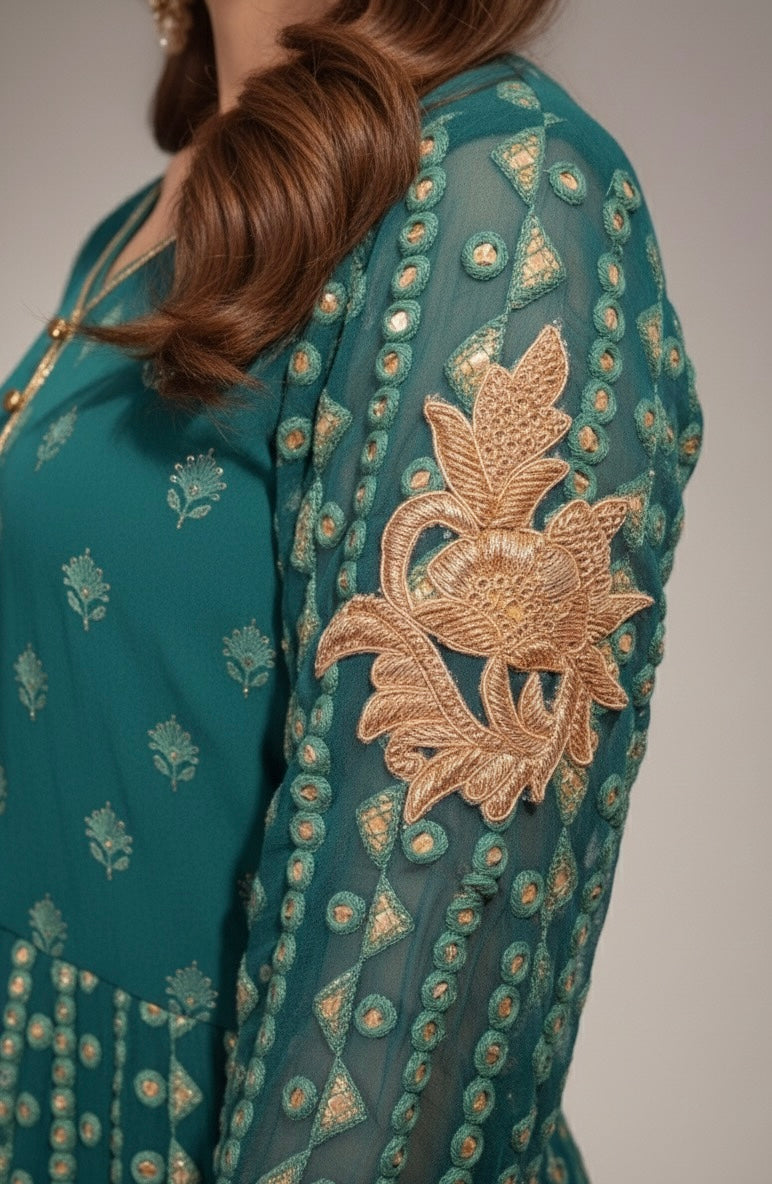 Embrace sophisticated craftsmanship with this exquisite front-open kalidar, meticulously tailored in breathable chikankari fabric. The design is elevated by bespoke handmade motifs adorning the sleeves and graceful, structured pleats for a flattering silhouette. It is perfectly paired with contemporary flared pants featuring intricate gota details that add traditional charm, and completed with a flowing plain chiffon dupatta finished with sparkling kiran trim all around. The back of the garment is finished with a stunning motif at the neckline, ensuring elegance from every angle. Please note: Due to the artisan nature of this piece, fabric design, and specific motifs may vary based on availability.