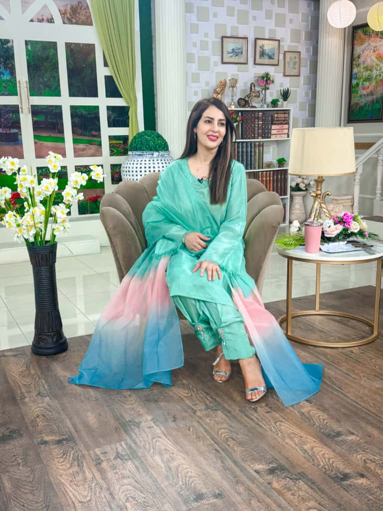 Indulge in the luxurious allure of our Green Luxe ensemble. This exquisite three-piece outfit showcases a beautifully tailored silk suit, crafted with meticulous attention to detail. The neckline features intricate sequins handwork including interested shapes like stars, and the trousers have a different pleated look adorned with glamorous hand worked motifs. The ensemble is completed with a stunning organza dupatta, artfully designed with a harmonious blend of pink, blue, and green tones. Each piece is created with unparalleled care and passion, ensuring a garment that embodies both sophistication and grace. Experience the perfect blend of comfort and style with this unique and captivating creation.