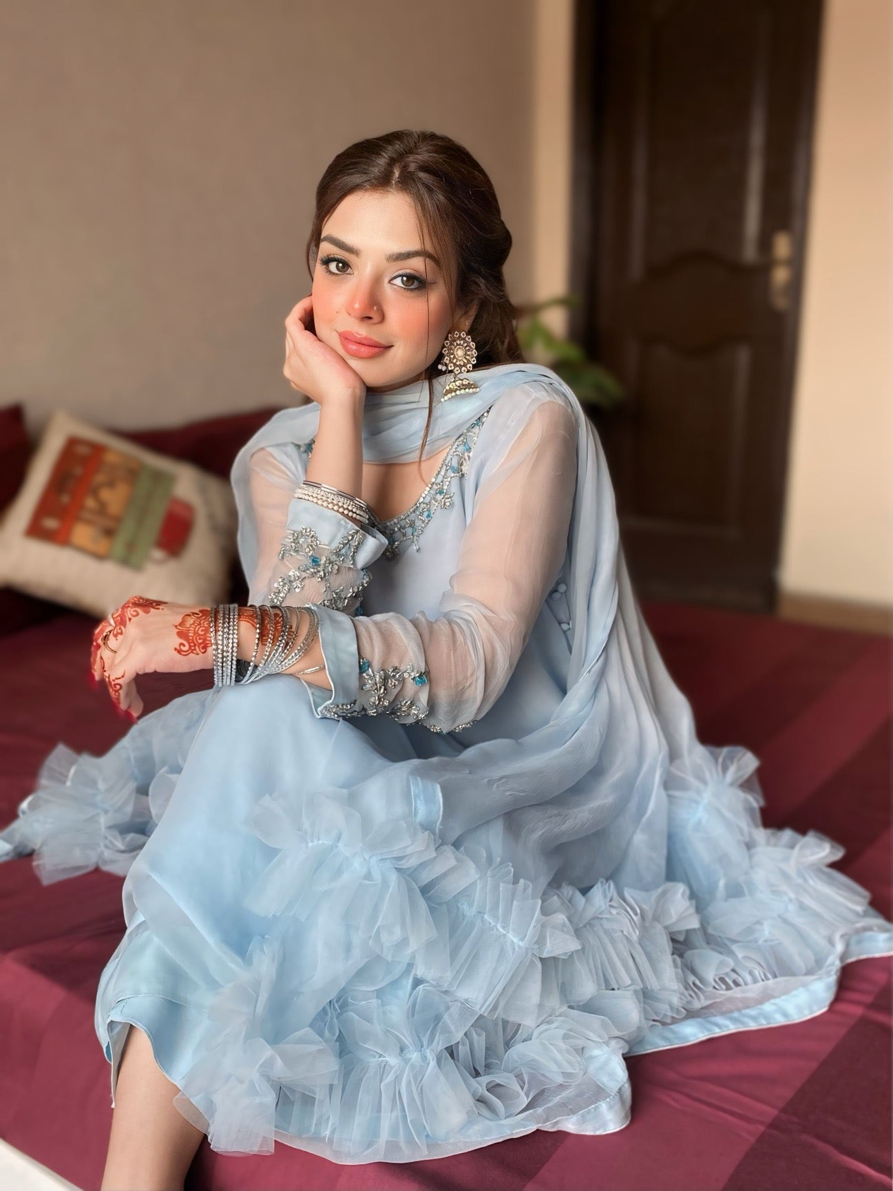 Handworked neckline and sleeves with blue crystals, sequins, dabka and naqshi on this etheral tone of ice blue makes this outfit look like a dream come FALSE. The shirt is adorned with buttons on hems of shirt and trouser. Statement detailed dupatta with frill details makes the look complete. Outfit: 3 Piece