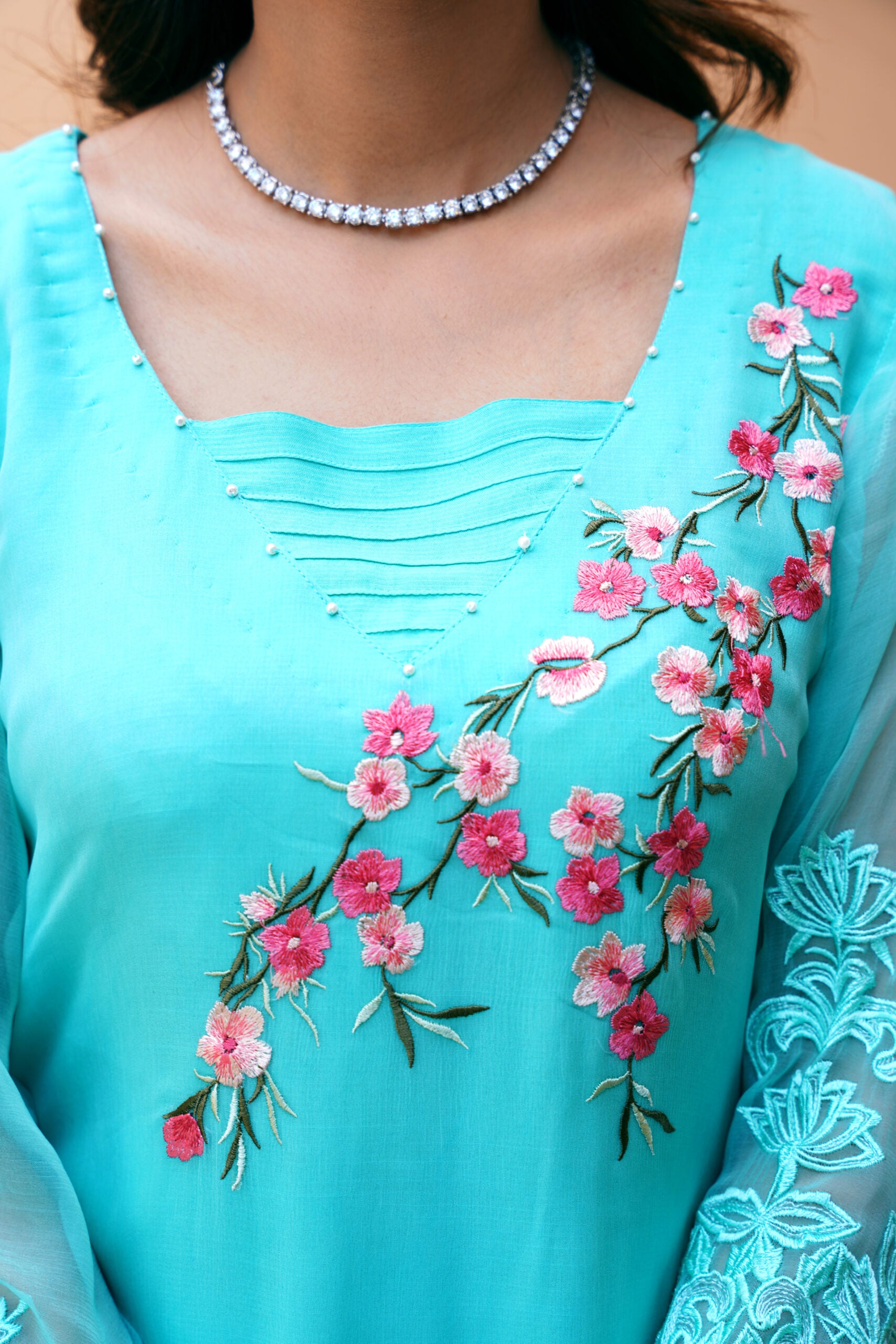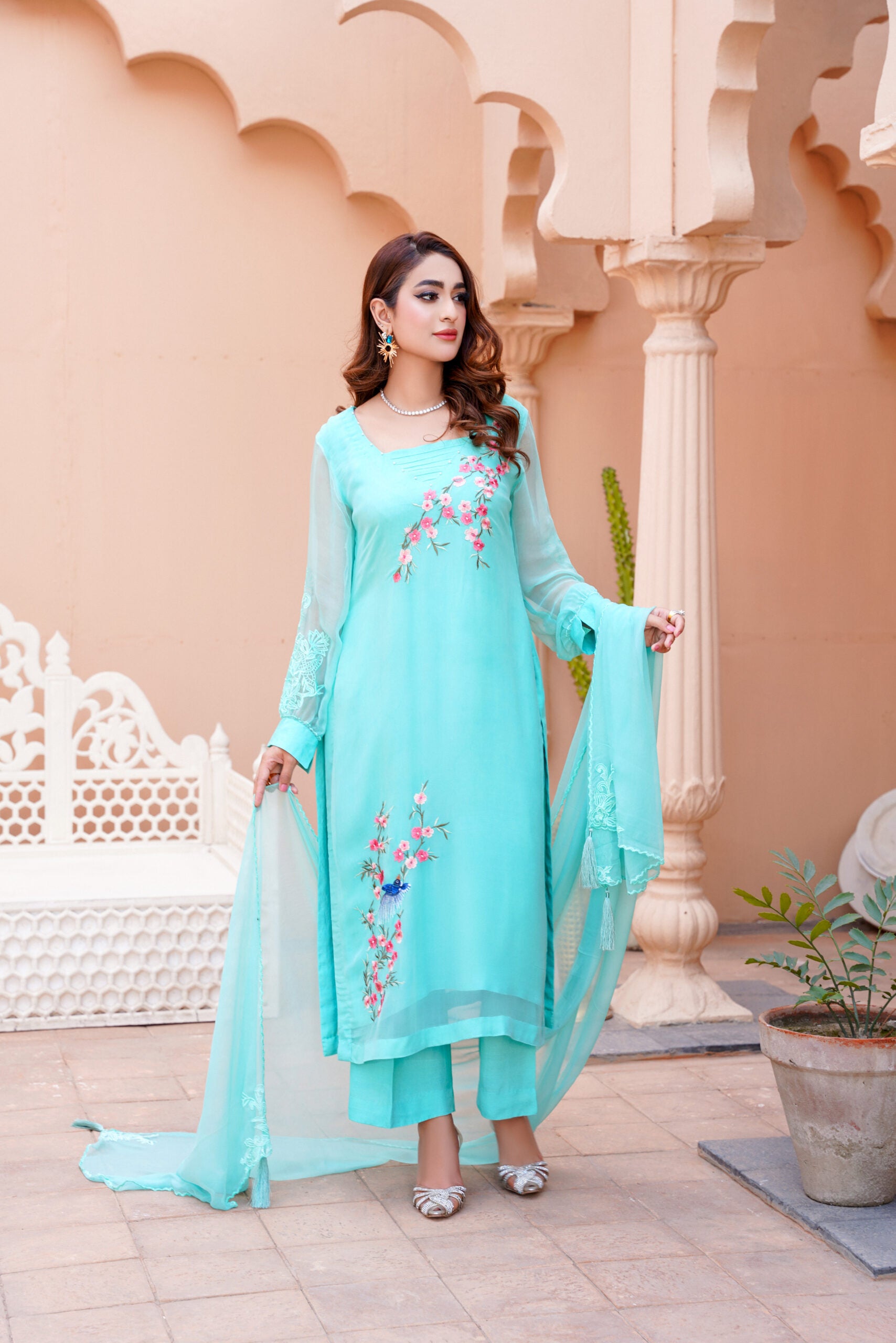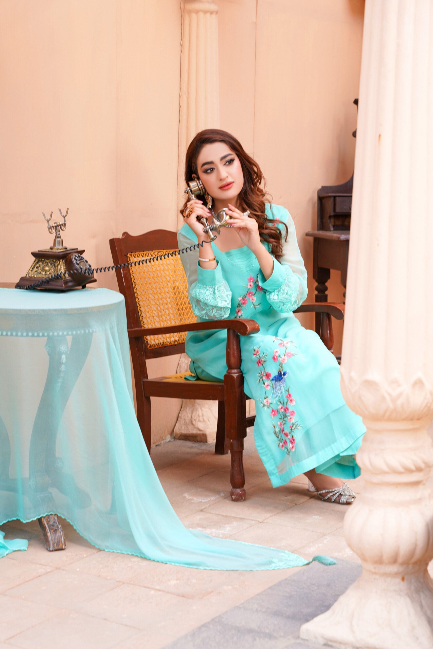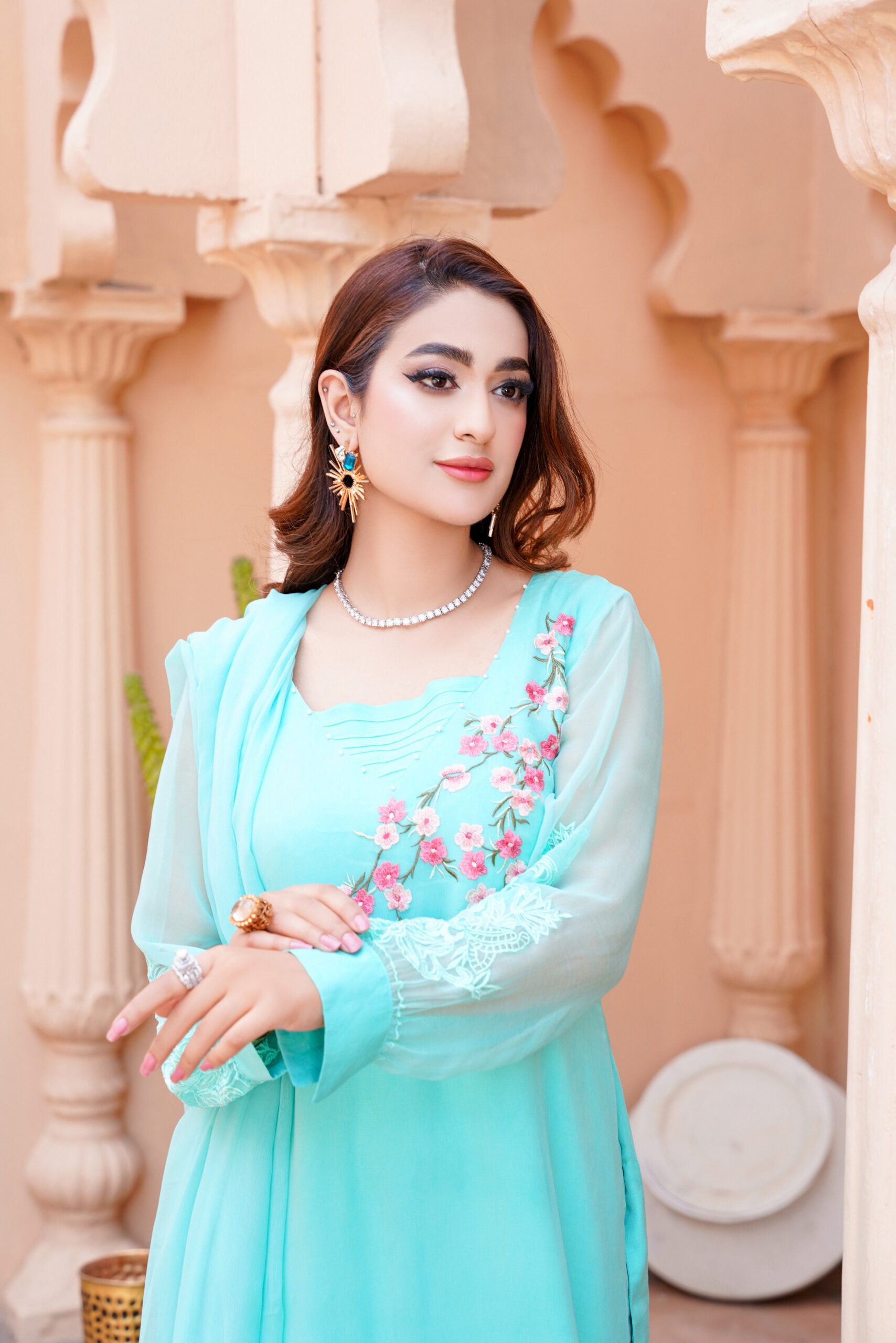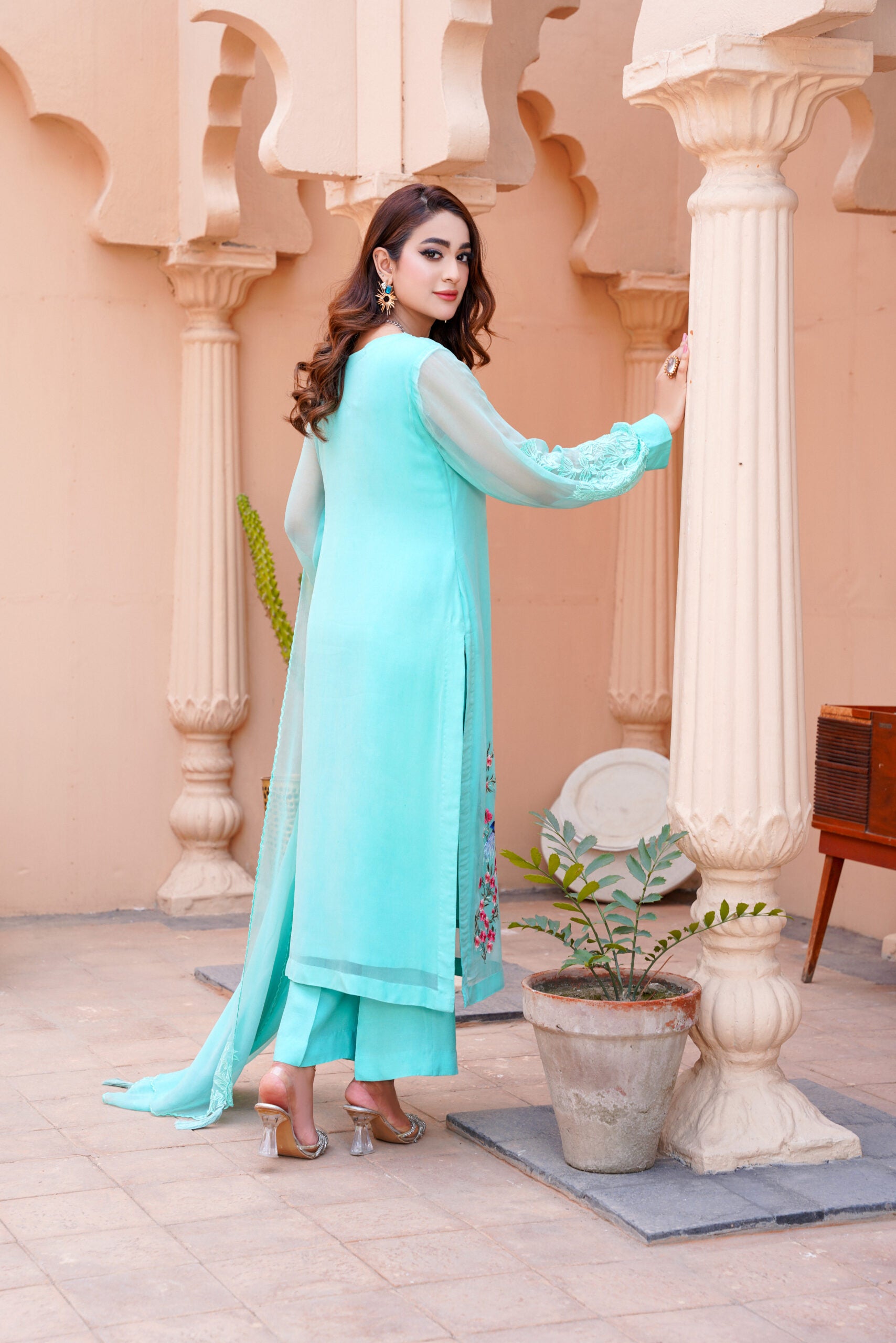 Introducing our exquisite three-piece Icy Bloom. This stunning ensemble includes a dupatta, trousers, and shirt, all meticulously designed to create a harmonious and breathtaking look. The vibrant blue hue radiates confidence and allure, while the intricate pearl work on the neck adds an extra touch of elegance. With its flowing silhouette and impeccable craftsmanship, this dress is the epitome of luxury and style.