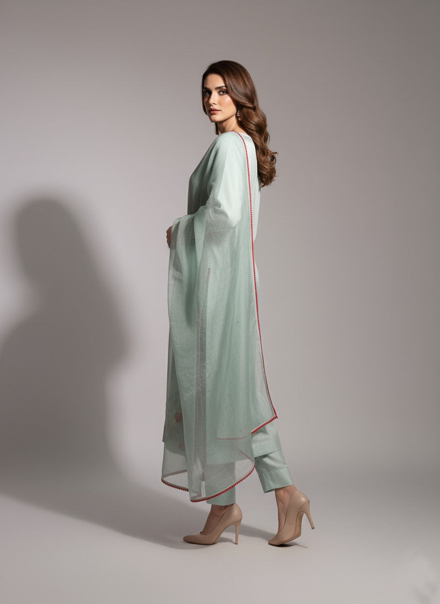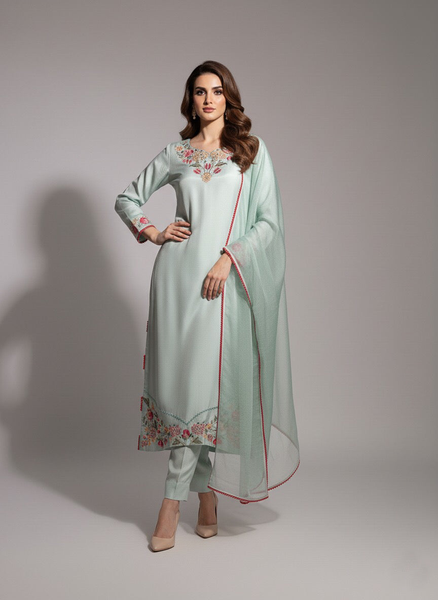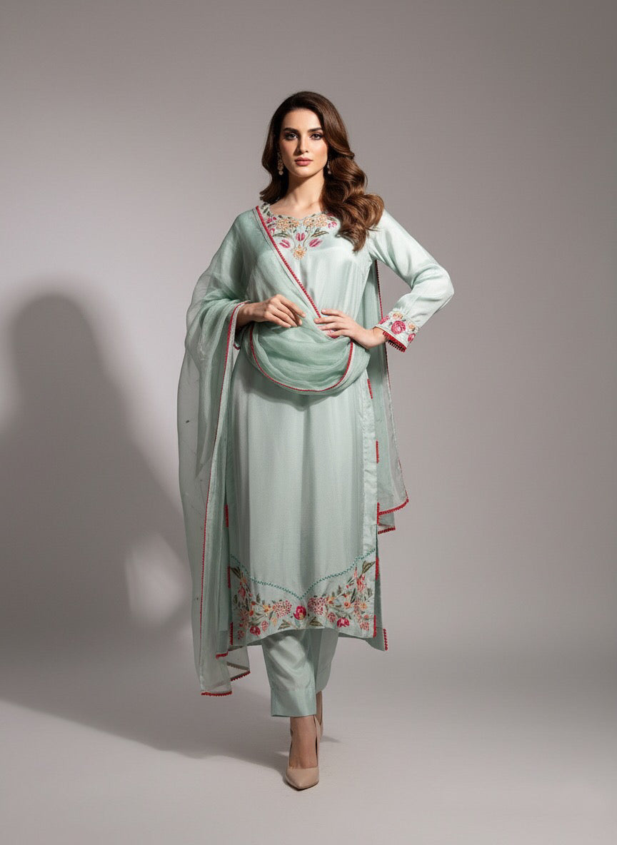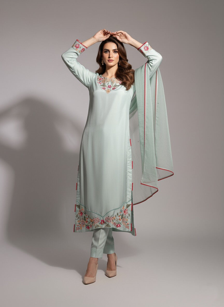 Indulge in the opulence of this three-piece ensemble, meticulously crafted from premium tassel silk fabric. The dress features delicate lace inserts, artfully incorporated into the hem, neckline, and sleeves, enhancing its refined aesthetic. Neckline, daman and sleeves are adorned with intricate multi-thread embroidery, adding depth and visual interest. The set is completed with wide-leg, straight-cut trousers and a medium silk dupatta, offering a seamless fusion of sophistication and modern design.