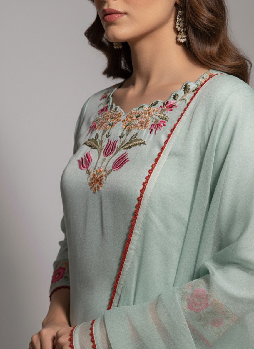Intricate multi-thread embroidery on neckline, daman, and sleeves