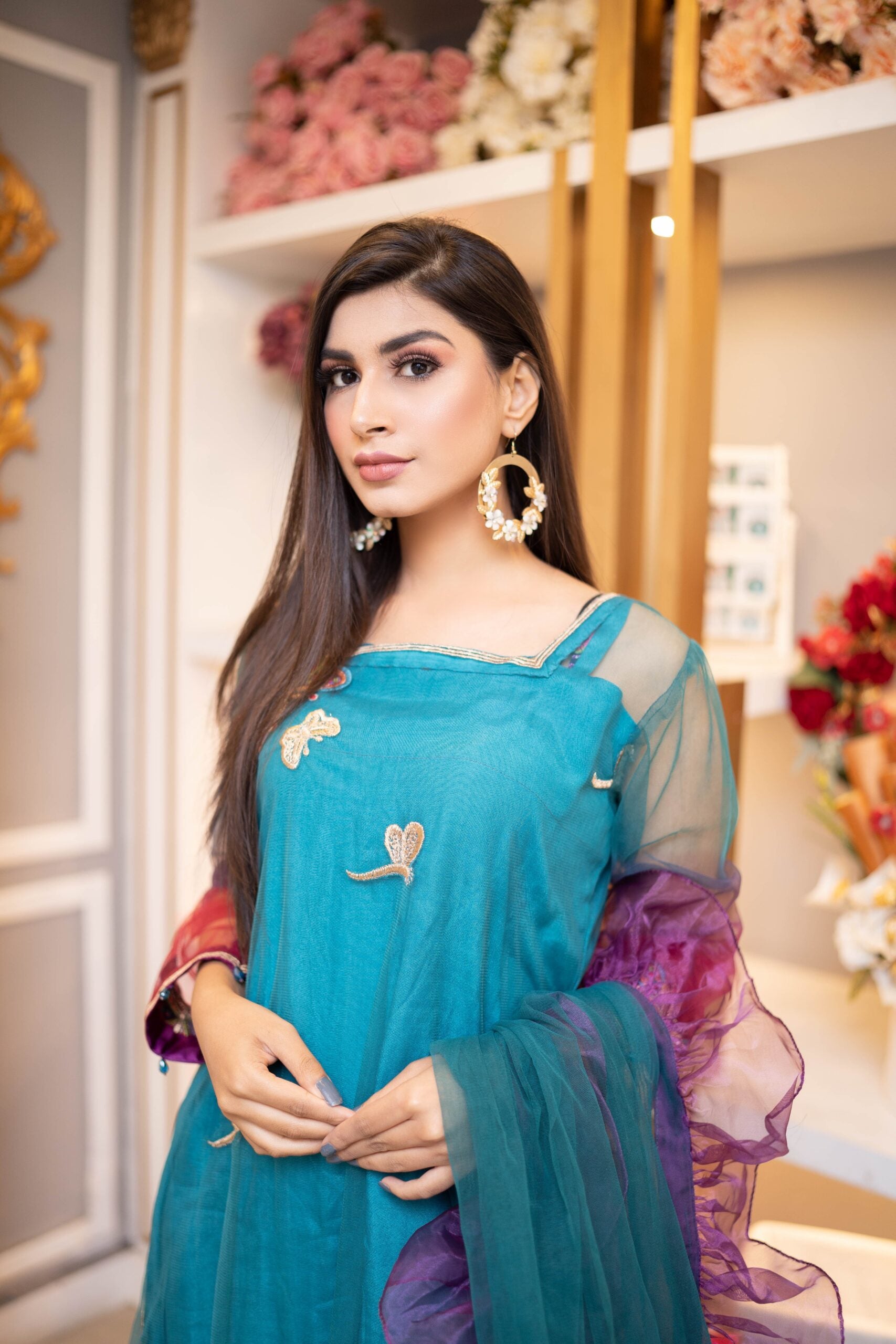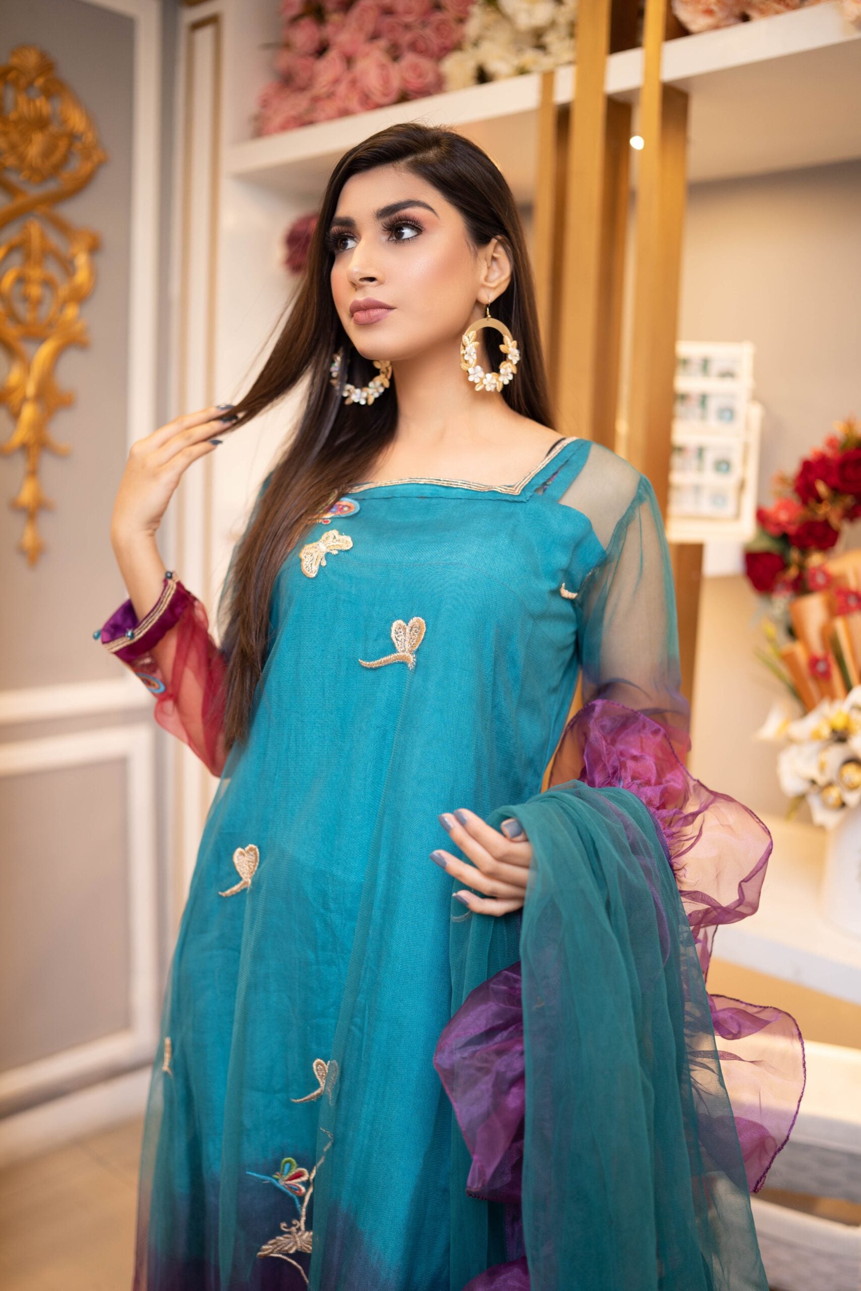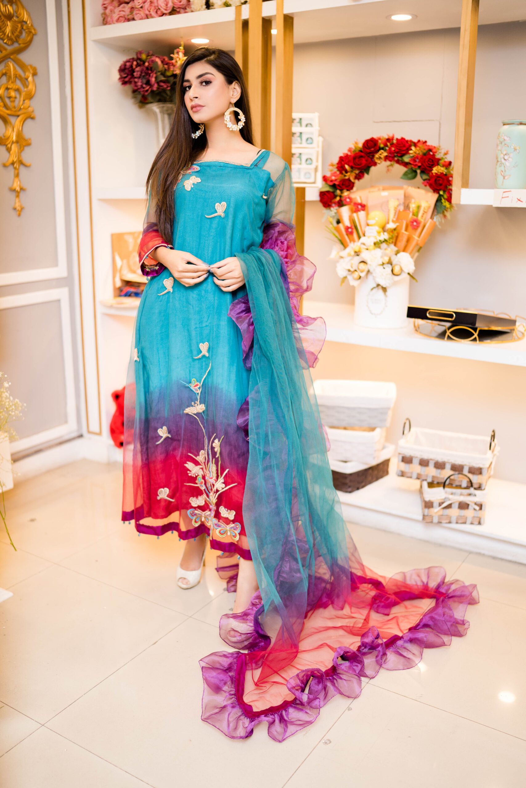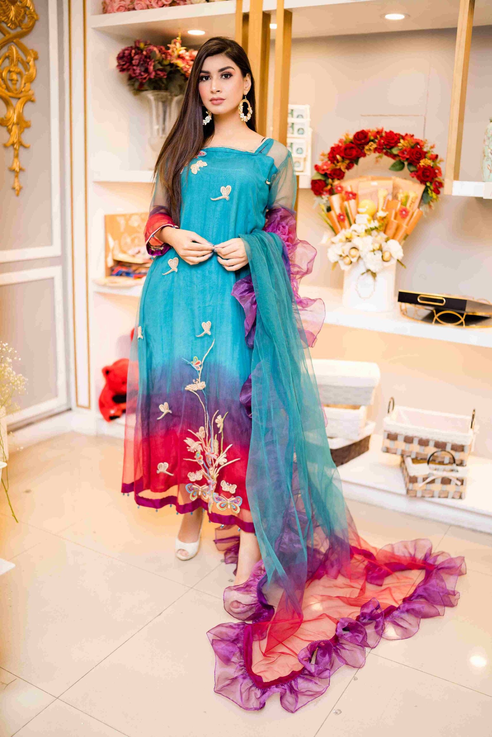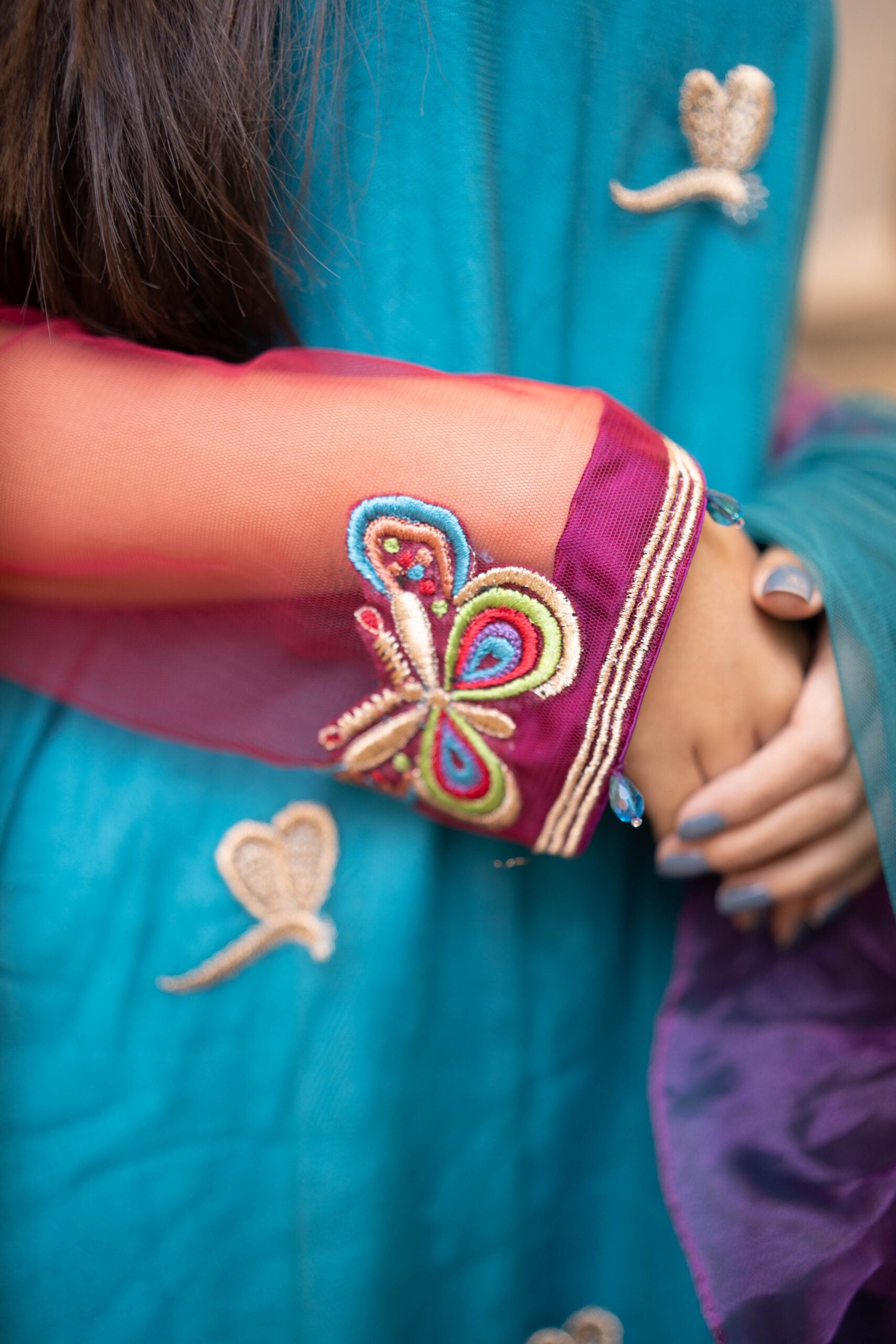 Tri-colored dress made in net fabric in teal, red & purple hues. The embroidery has wild fields with butterfly and dragonfly artistic details in tilla, resham, pearls.