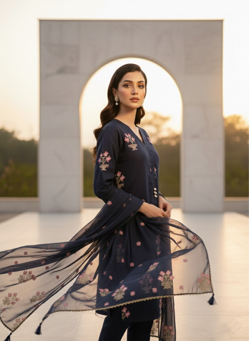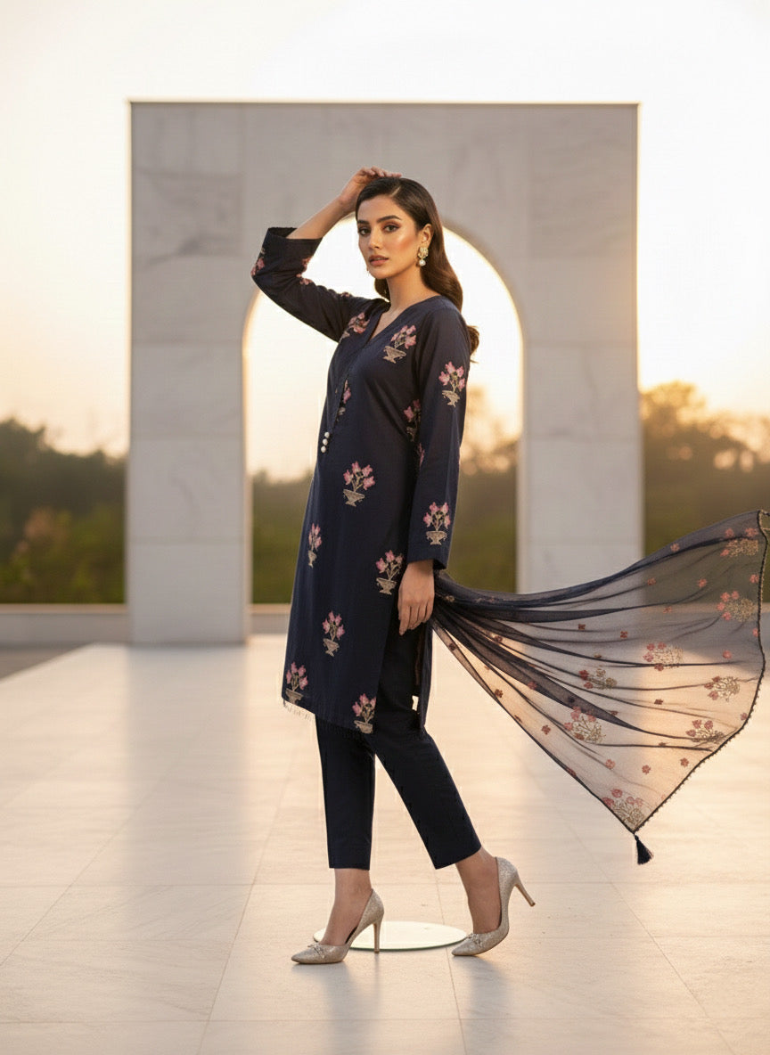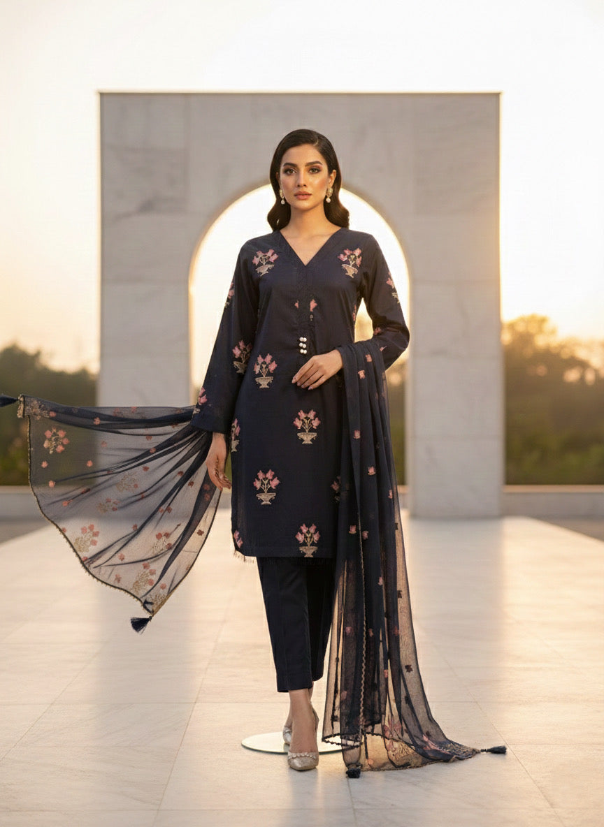 Elegant three-piece black cotton ensemble featuring delicate chiffon dupatta with intricate floral embroidery. Exquisite embroidered motifs grace the front, back, and sleeves, complemented by matching dupatta detailing. This sophisticated design combines traditional craftsmanship with refined aesthetics, perfect for special occasions and celebrations. The breathable cotton construction ensures comfort throughout wear, while the ornate embroidery adds timeless elegance to your wardrobe.