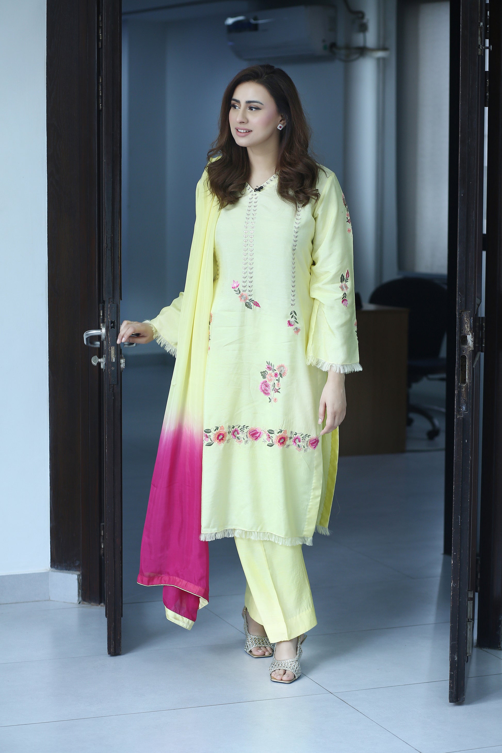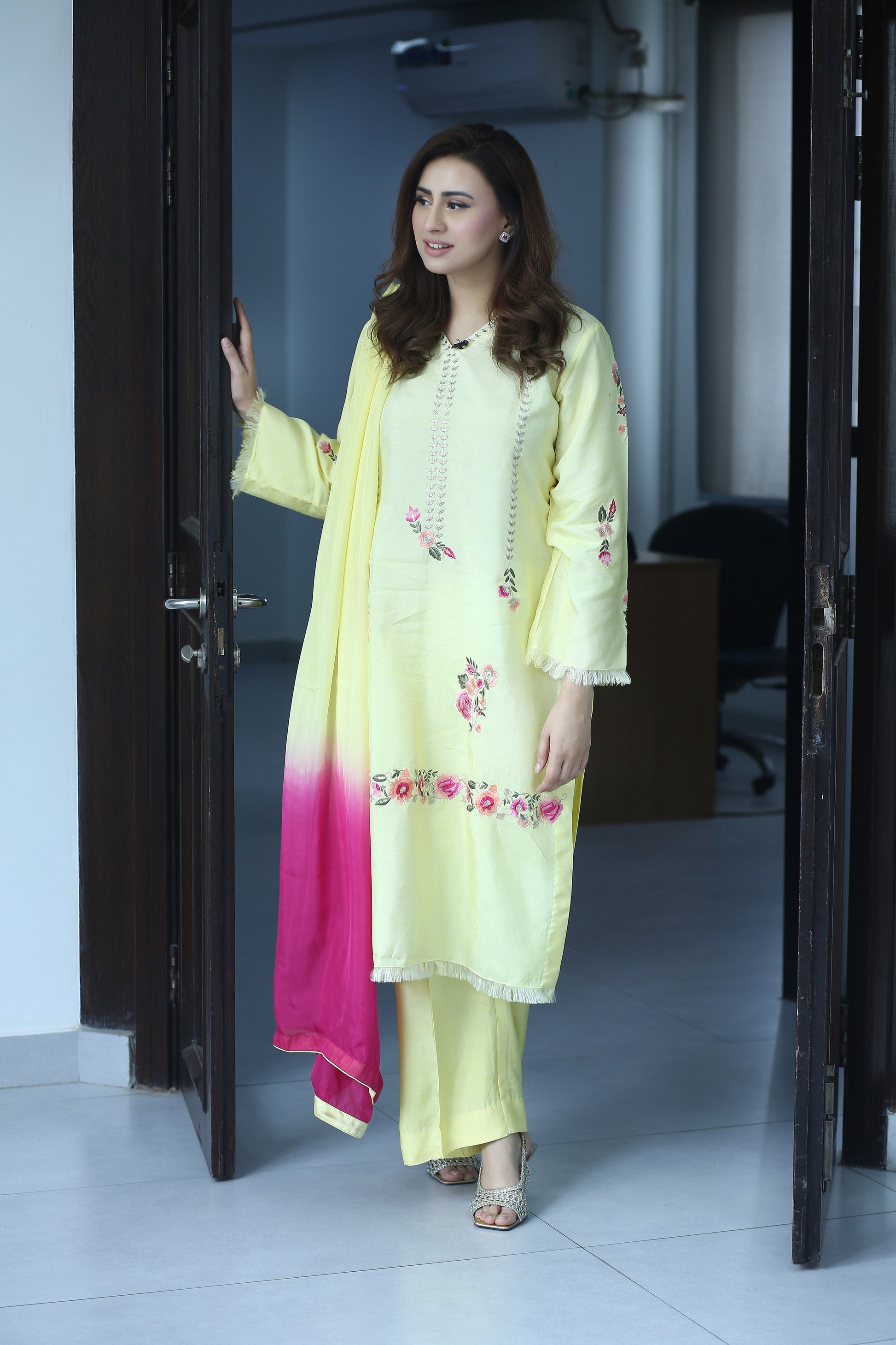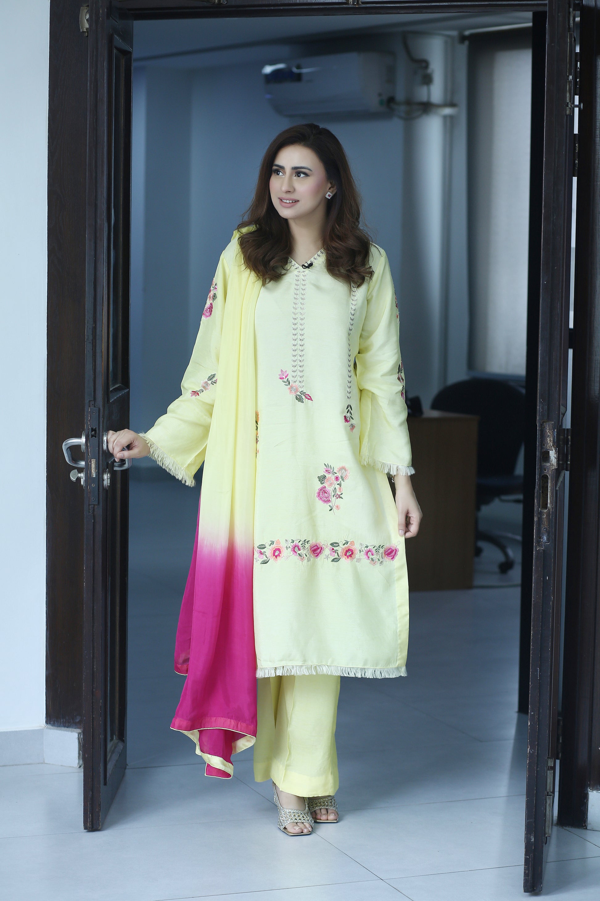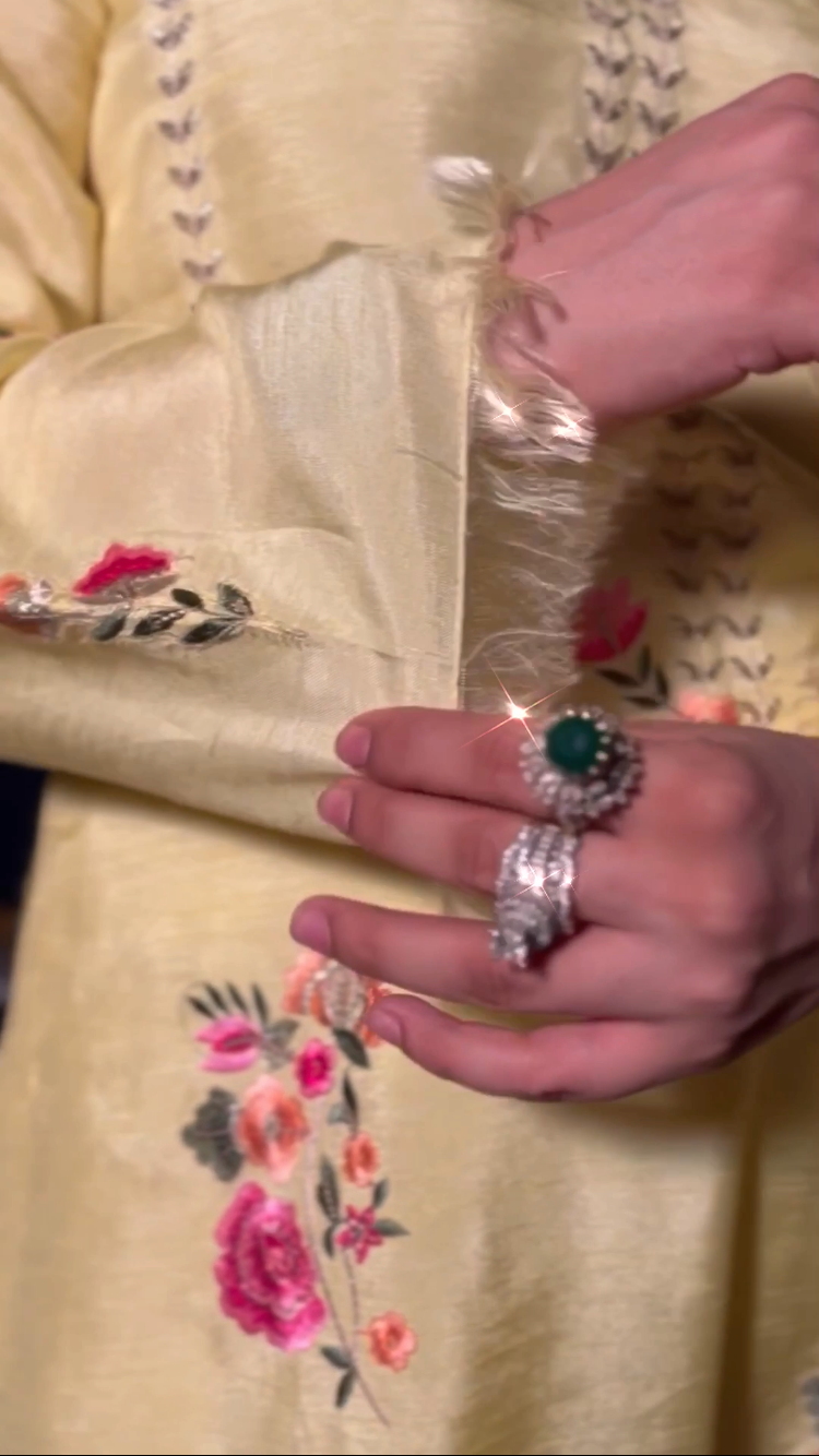 Elevate your festive wardrobe with Lemon Luxe – a radiant and refreshing 3-piece ensemble designed for the modern woman who cherishes timeless elegance. Crafted from premium Korean raw silk, the long shirt is adorned with delicate floral embroidery in ethereal shades of peach and pink, capturing the essence of graceful femininity.