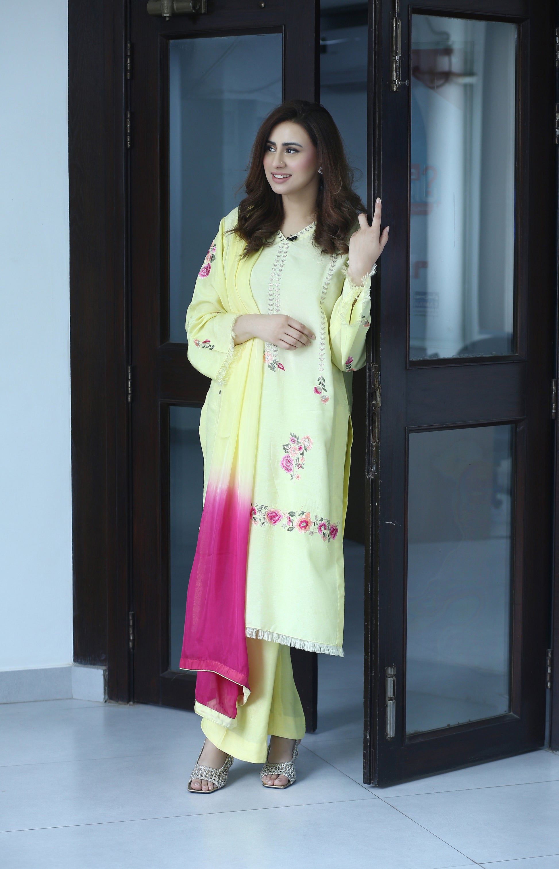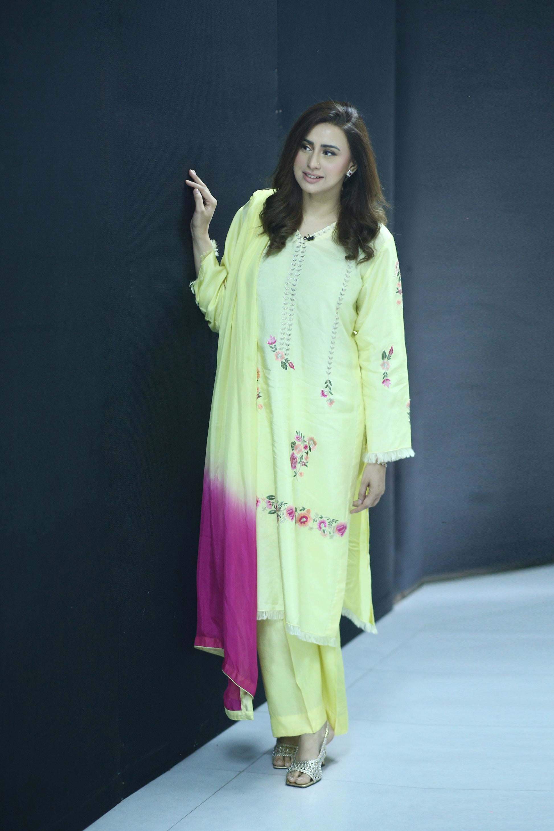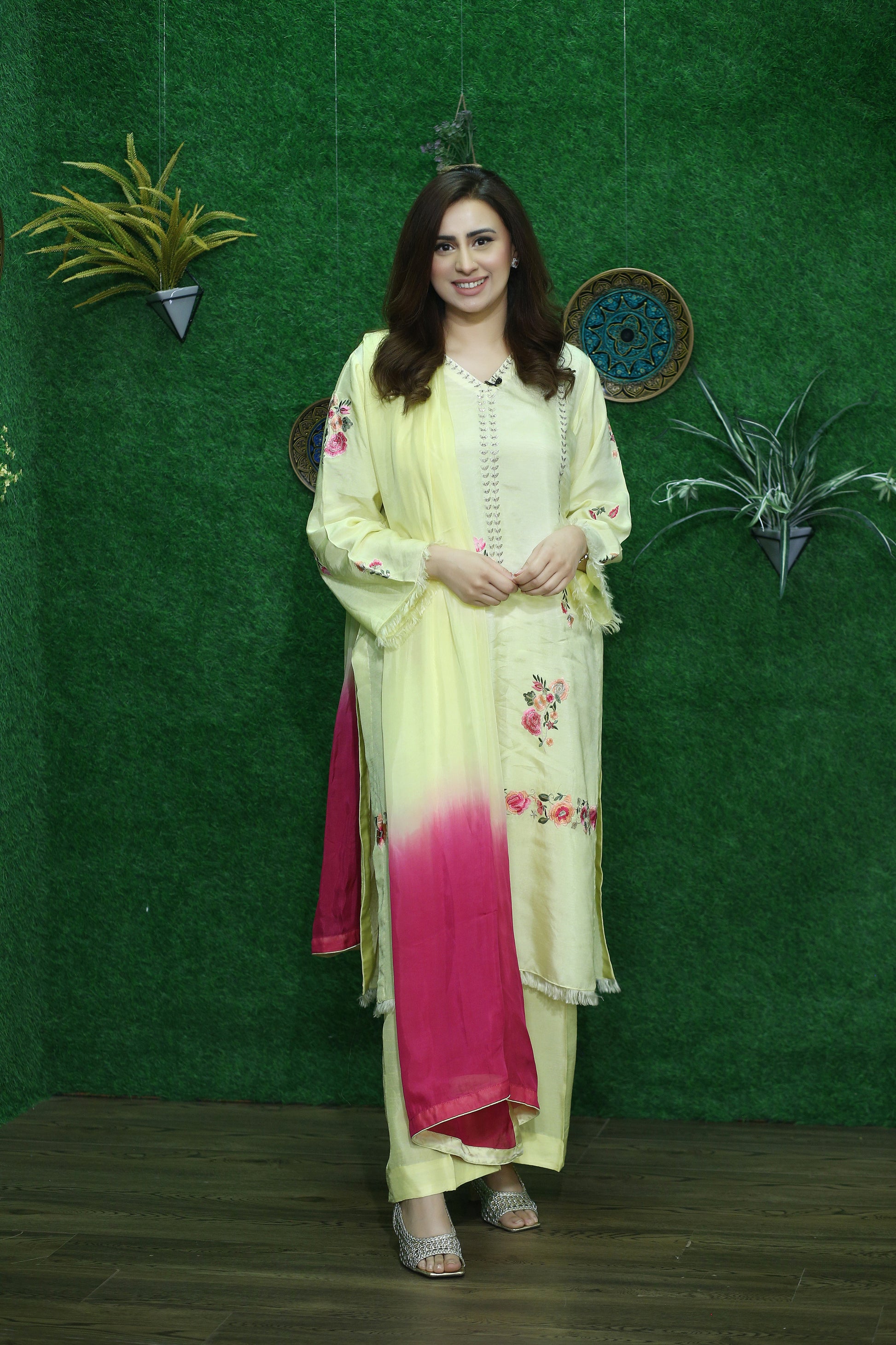 Elevate your festive wardrobe with Lemon Luxe – a radiant and refreshing 3-piece ensemble designed for the modern woman who cherishes timeless elegance. Crafted from premium Korean raw silk, the long shirt is adorned with delicate floral embroidery in ethereal shades of peach and pink, capturing the essence of graceful femininity.