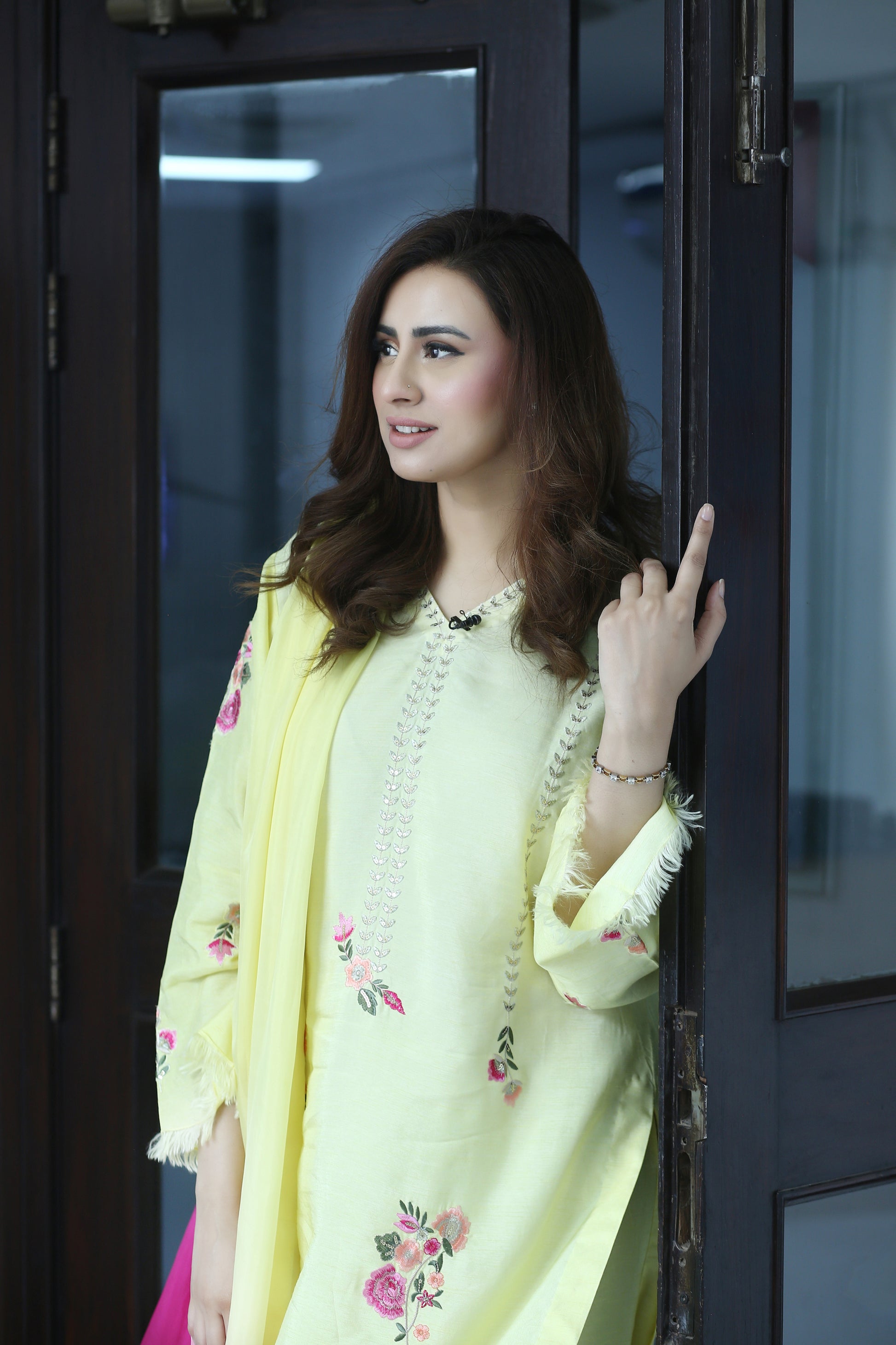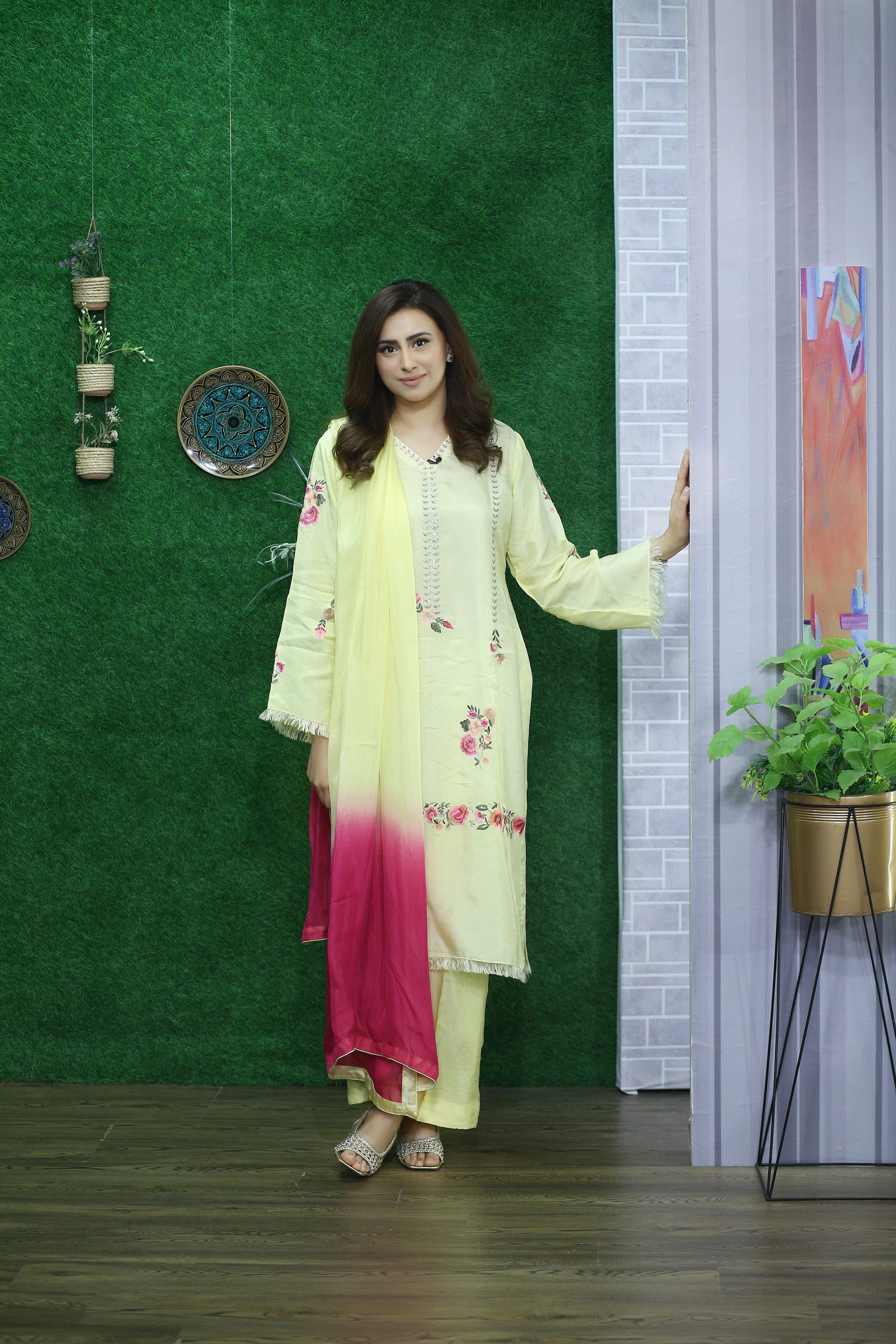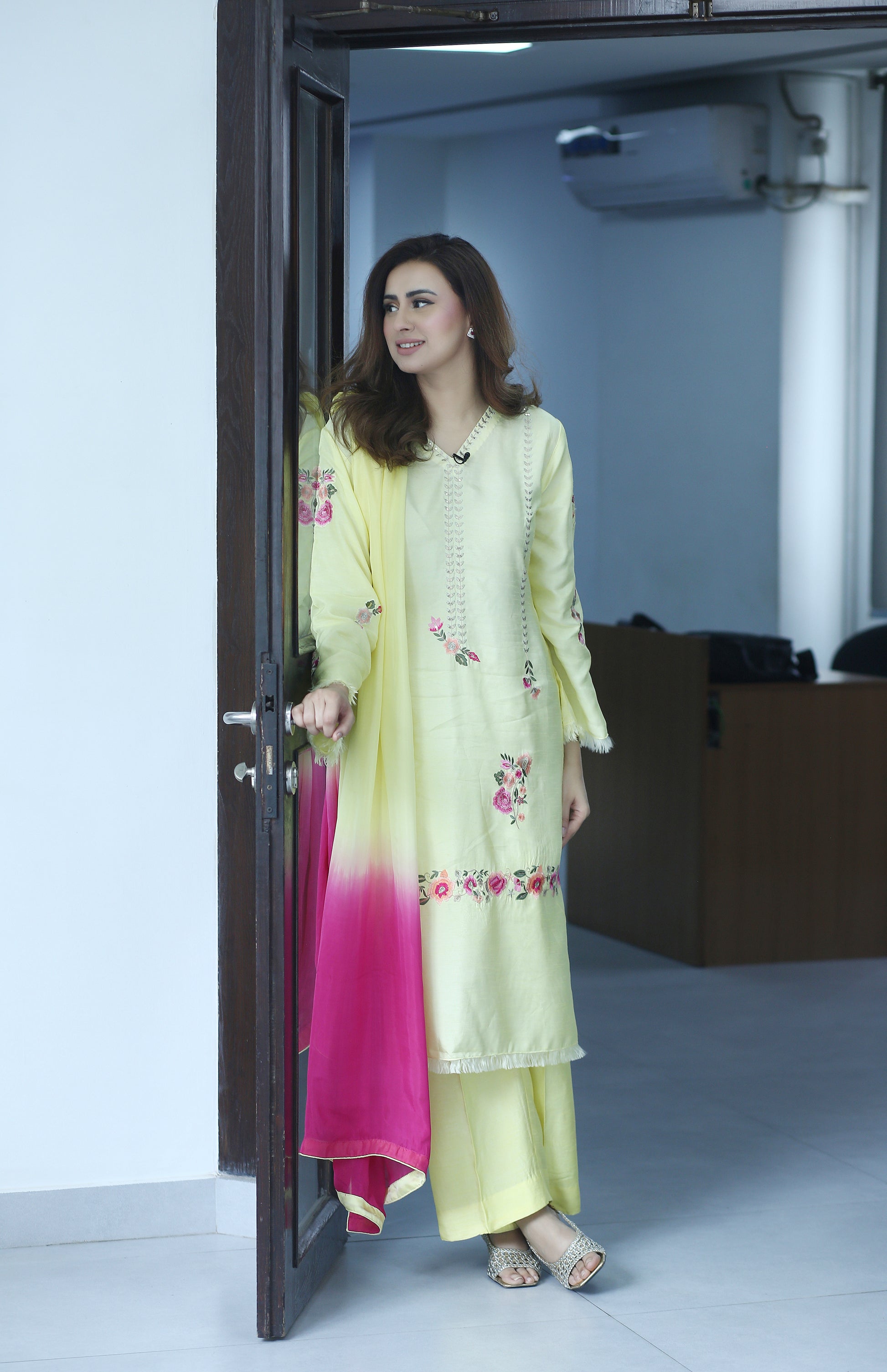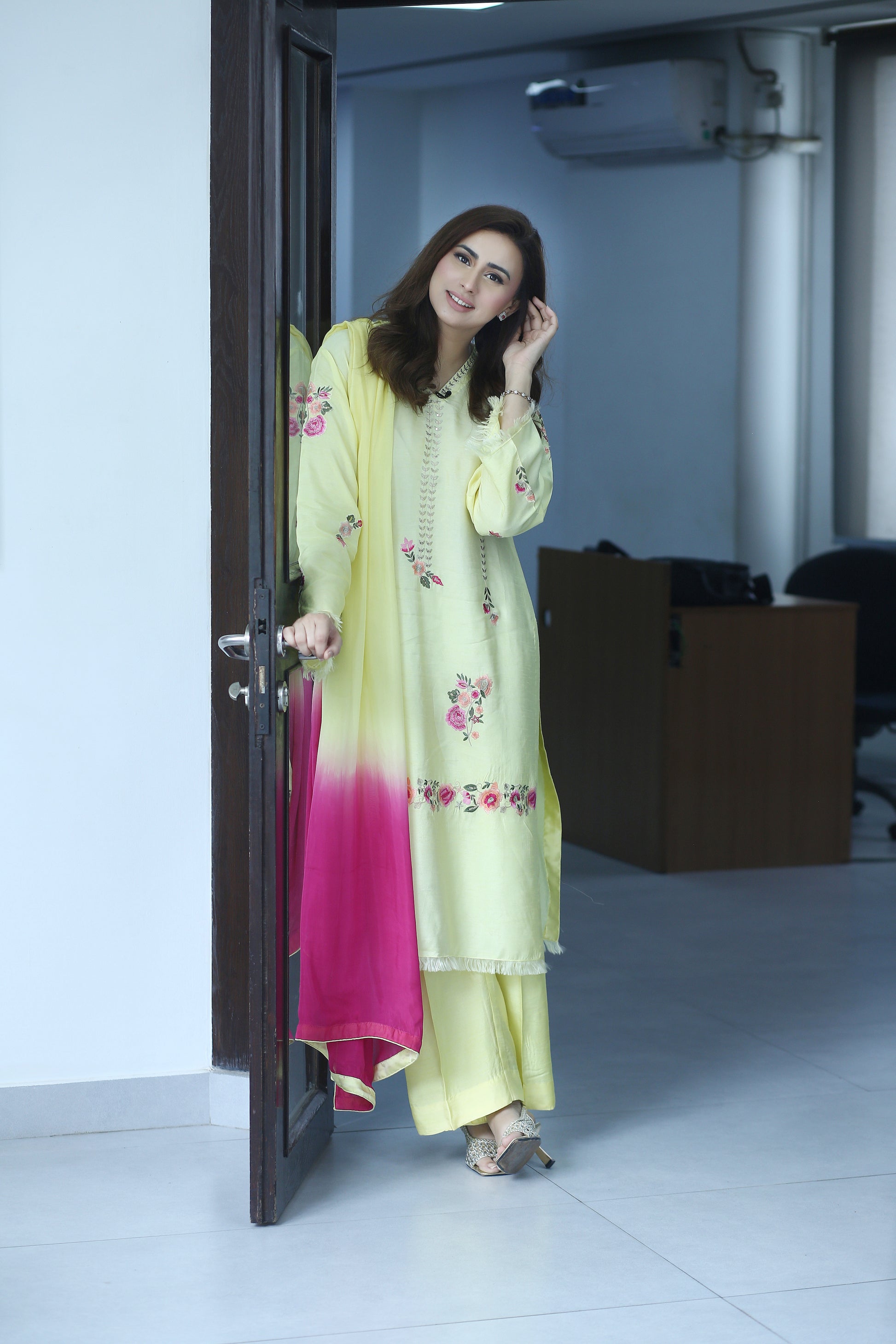 Elevate your festive wardrobe with Lemon Luxe – a radiant and refreshing 3-piece ensemble designed for the modern woman who cherishes timeless elegance. Crafted from premium Korean raw silk, the long shirt is adorned with delicate floral embroidery in ethereal shades of peach and pink, capturing the essence of graceful femininity.