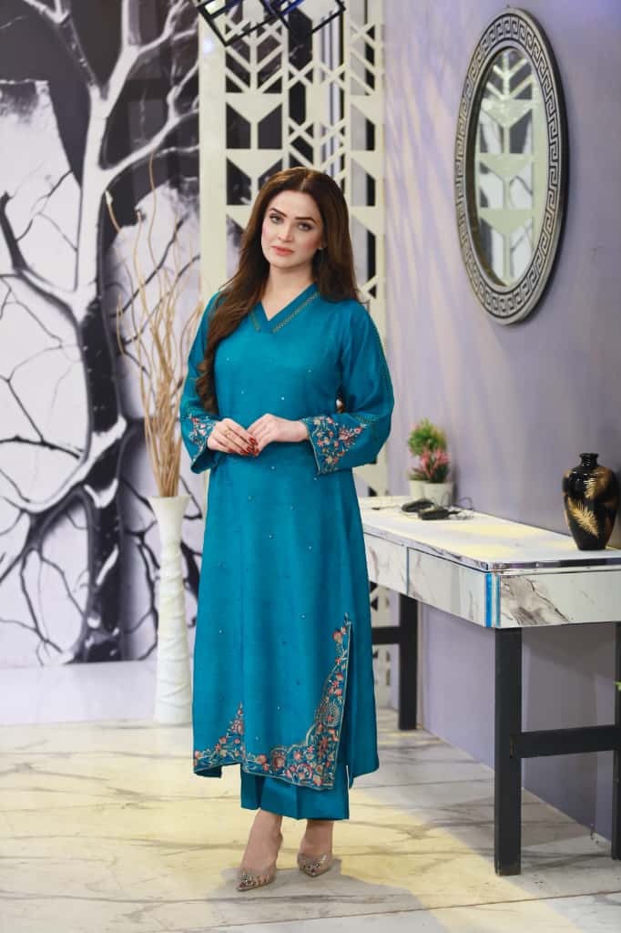 Made from premium Korean rawsilk, the shirt features delicately embroidered sleeves and daman for a refined finish. The entire front of the shirt is adorned with sequin work, giving a subtle mirror-like shine that enhances your overall appearance. The neckline and sleeves come with lace inserts, adding a graceful and feminine touch to the outfit.
