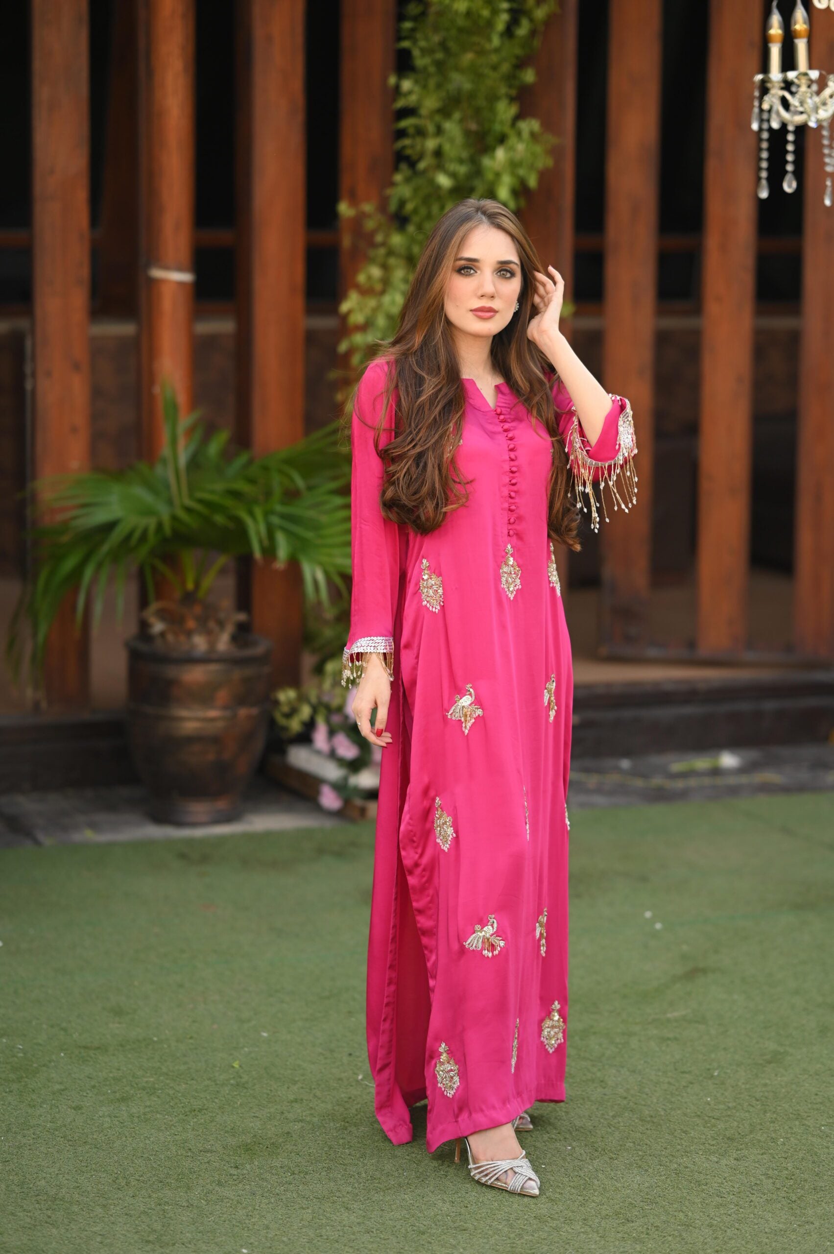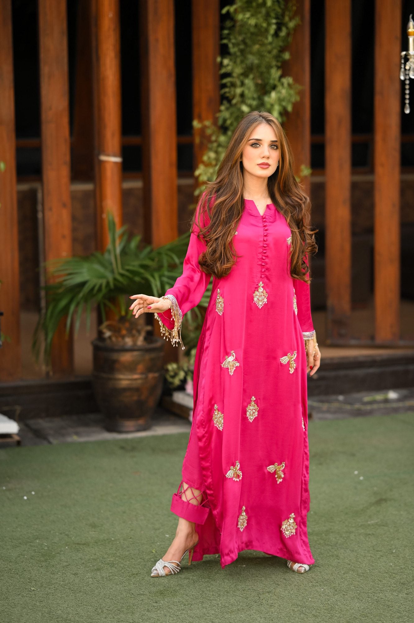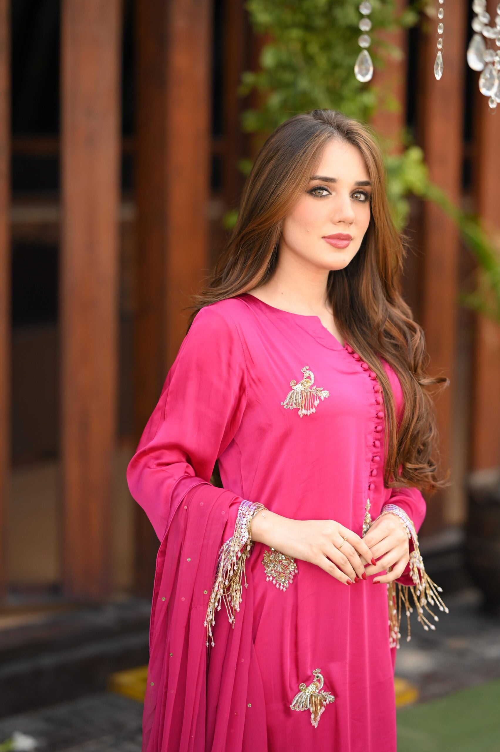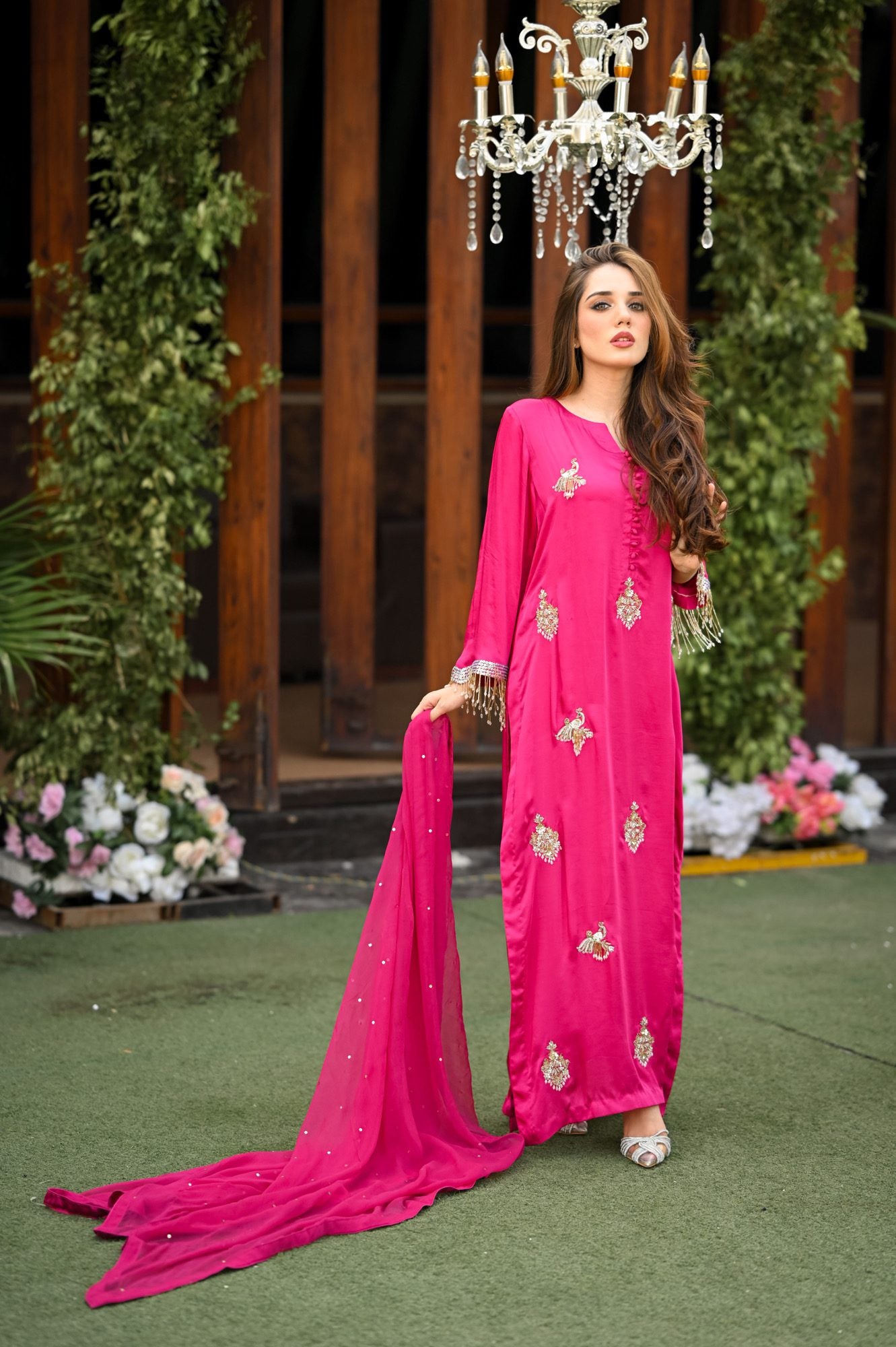 We have created this magnificent piece on the most beautiful shade of magenta. Delicate handwork all over the charmeuse silk long 50 inches shirt comes with beautiful sparkling dupatta and delicately stitched trouser. Tassel handwork on sleeves gives this article an extra sparkle. This ensemble is sure to make you stand out!