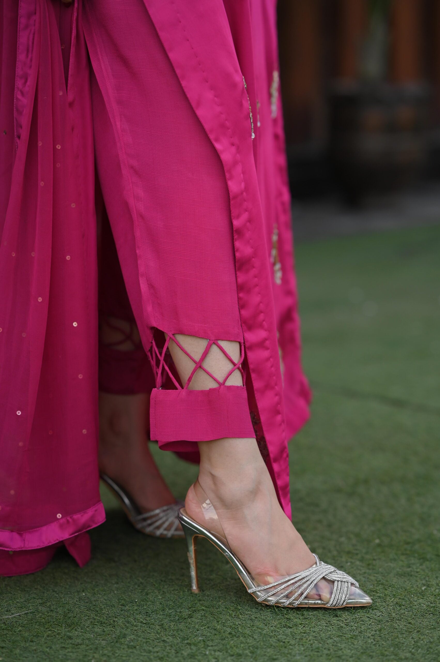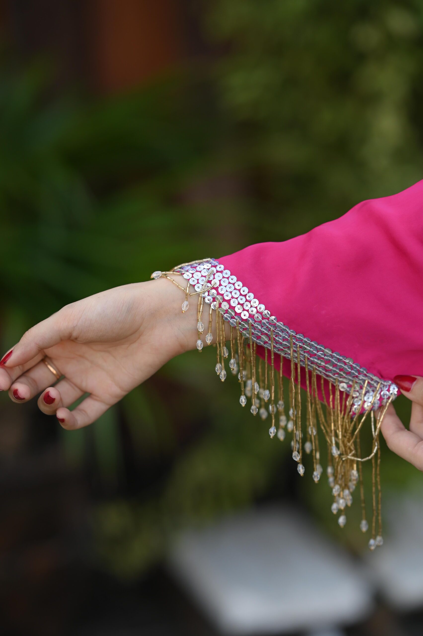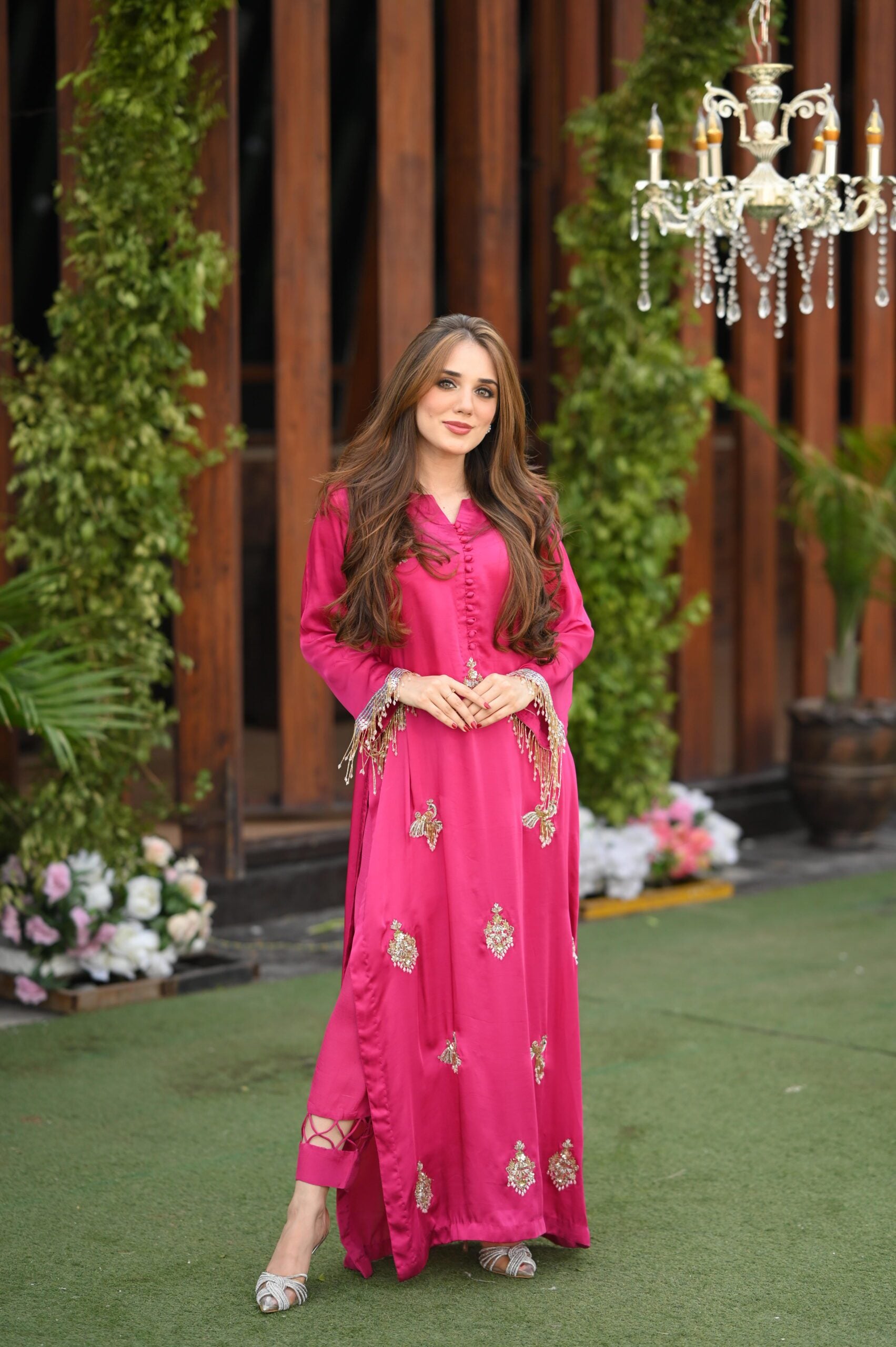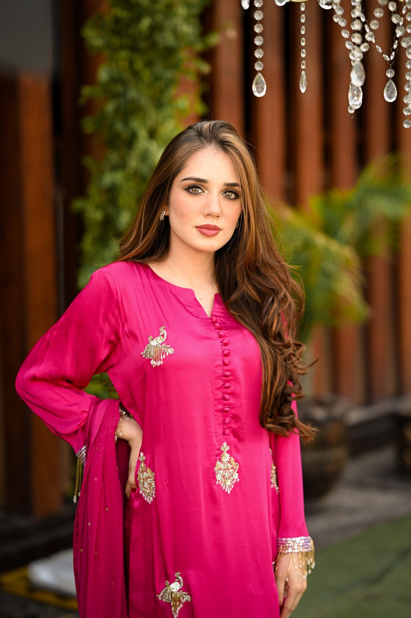 We have created this magnificent piece on the most beautiful shade of magenta. Delicate handwork all over the charmeuse silk long 50 inches shirt comes with beautiful sparkling dupatta and delicately stitched trouser. Tassel handwork on sleeves gives this article an extra sparkle. This ensemble is sure to make you stand out!