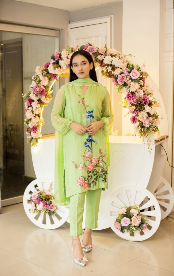 \nInspired by the spring season, this beautiful organza dupatta is dyed in two-tone with cherry blossom branches handpainted to perfection. Dupatta finished with bird and pearl tassels.