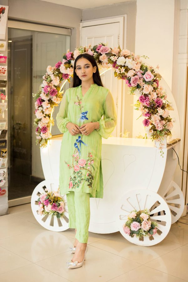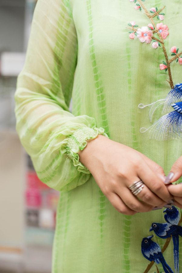 Tie & Dye chiffon shirt with beautiful embroidery on front and smoking on sleeves. Paired with high-quality raw silk trouser.