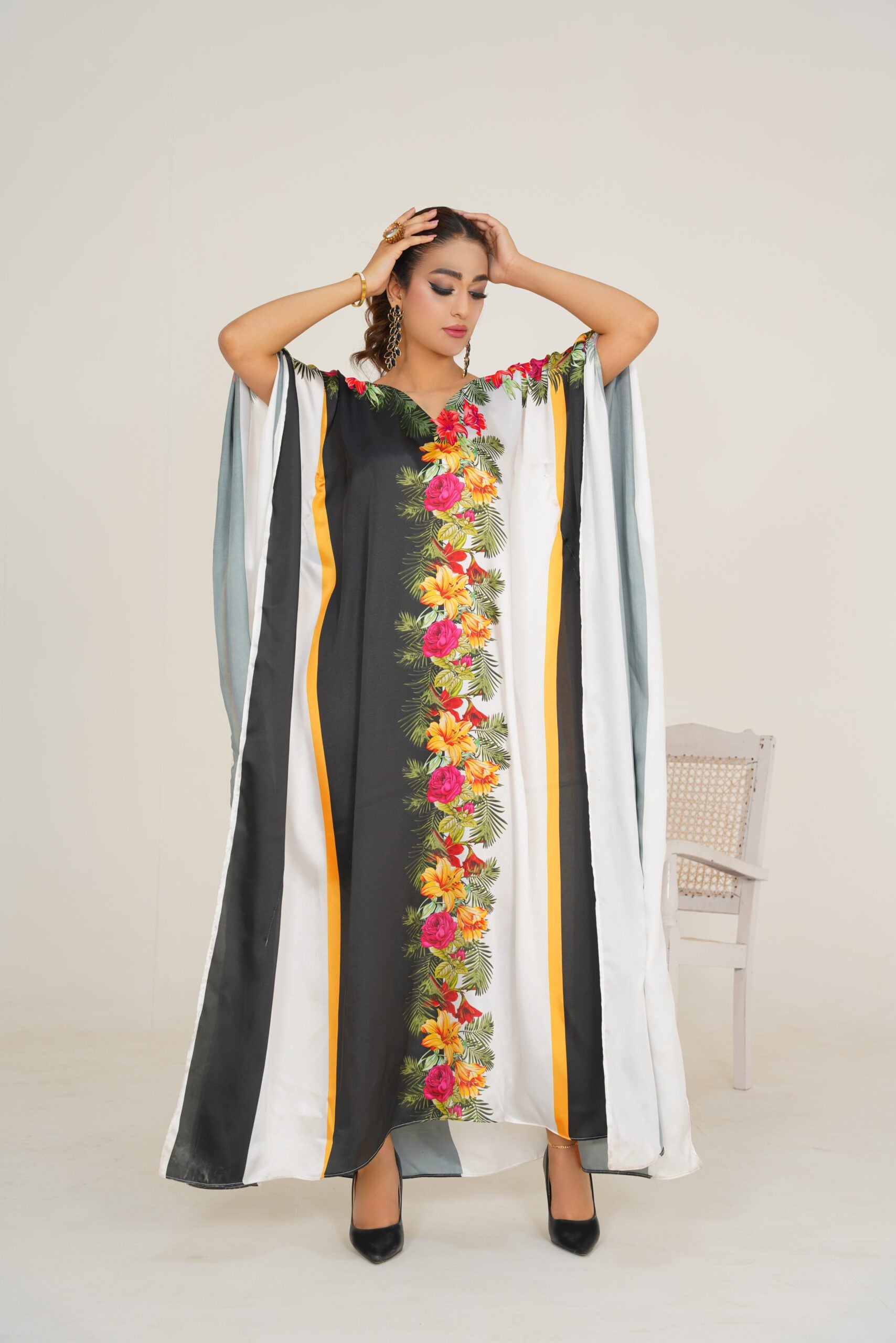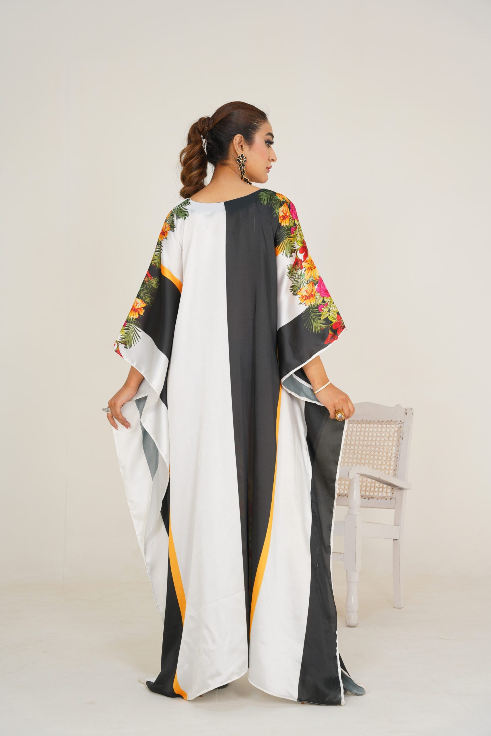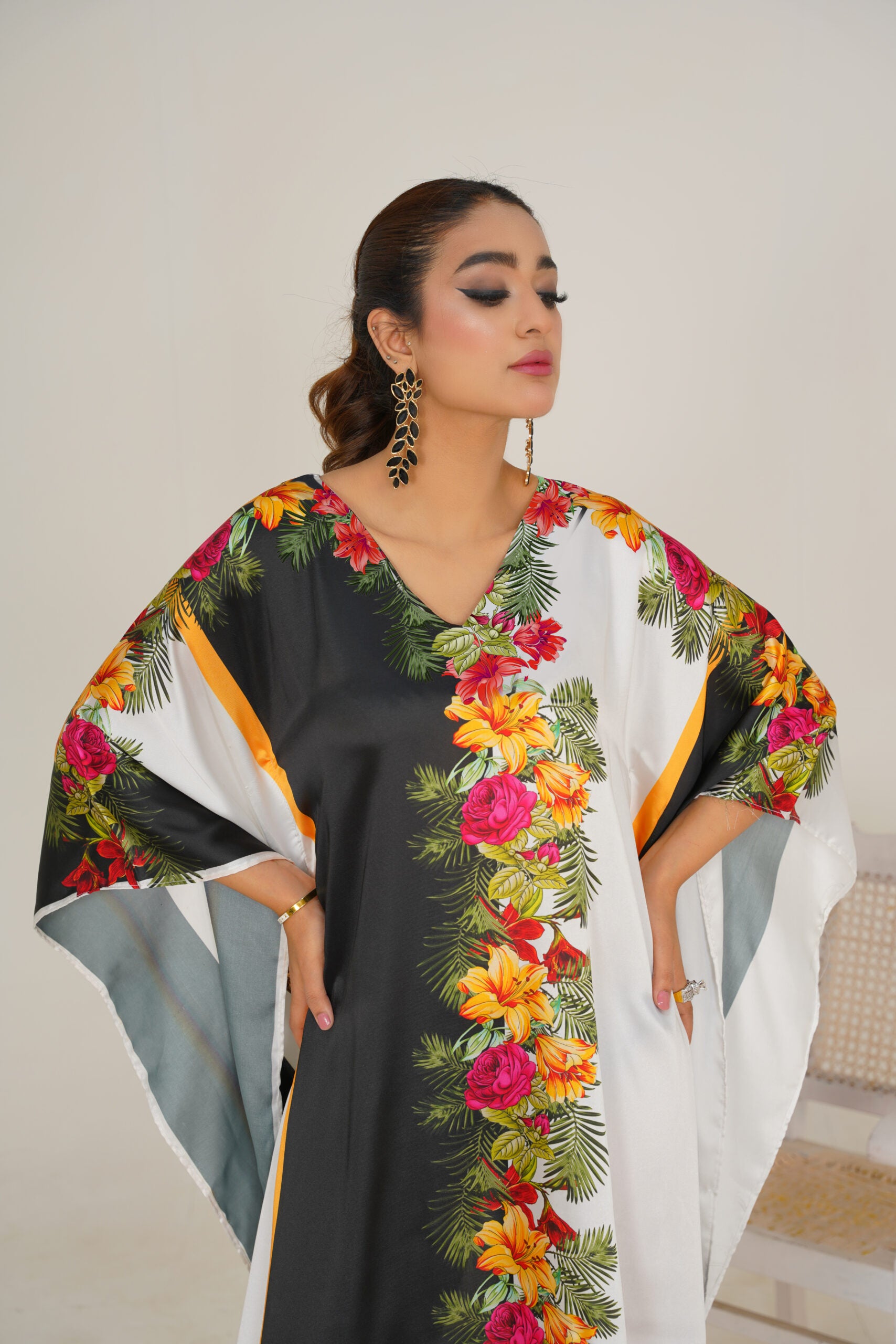 This Kaftan is a stunning piece of fashion artistry. Made from charmeuse Silk, this kaftan offers a soft and flowing drape that accentuates your every movement. The intricate floral patterns, delicately arranged on a black and white backdrop, create a visually captivating design that exudes elegance and sophistication. With its impeccable craftsmanship and attention to detail, this kaftan is a FALSE testament to refined style. Embrace the beauty and grace of this exquisite kaftan and make a statement with the length of 56. Disclaimer: Actual product color may vary slightly from the image.